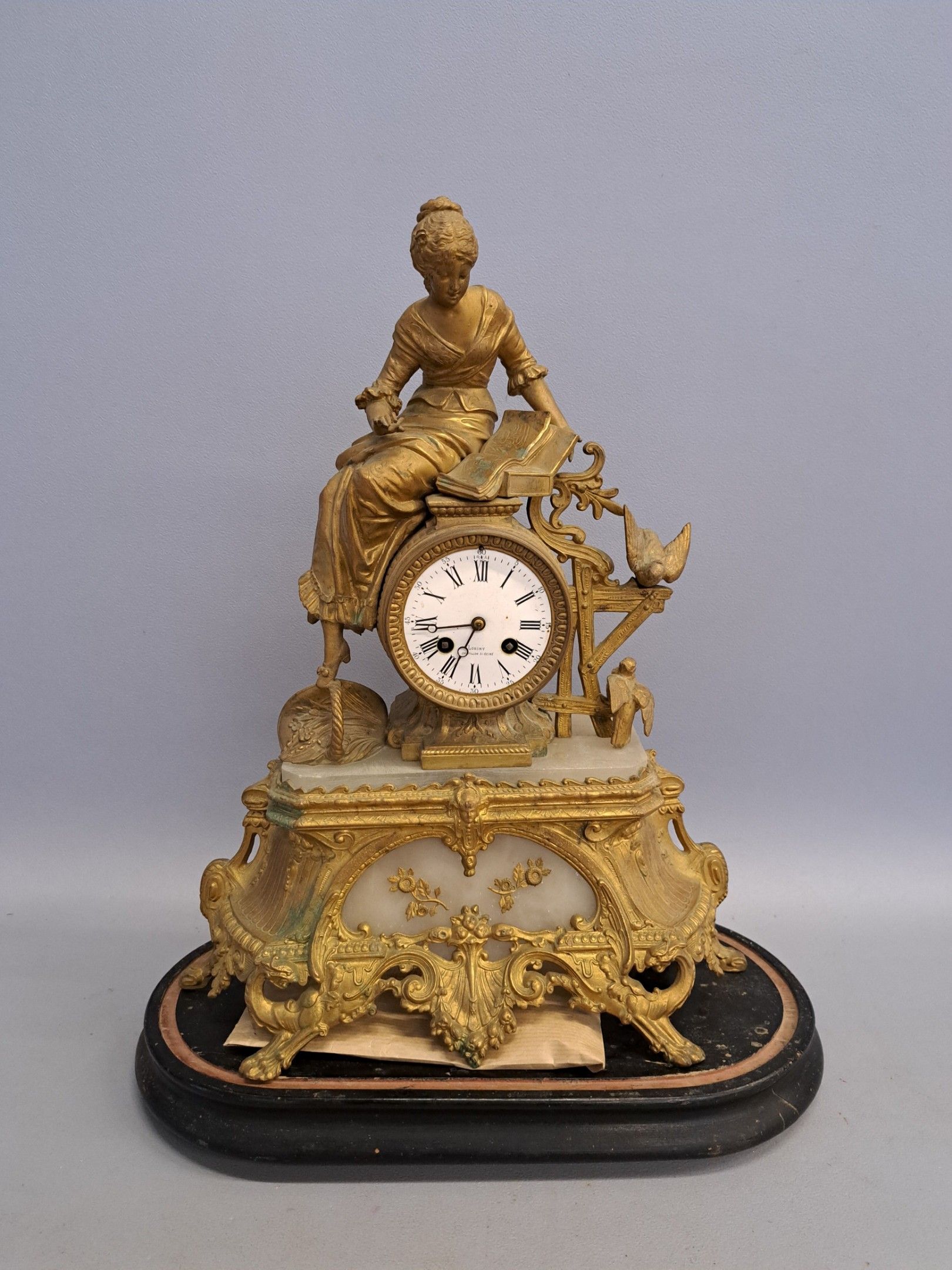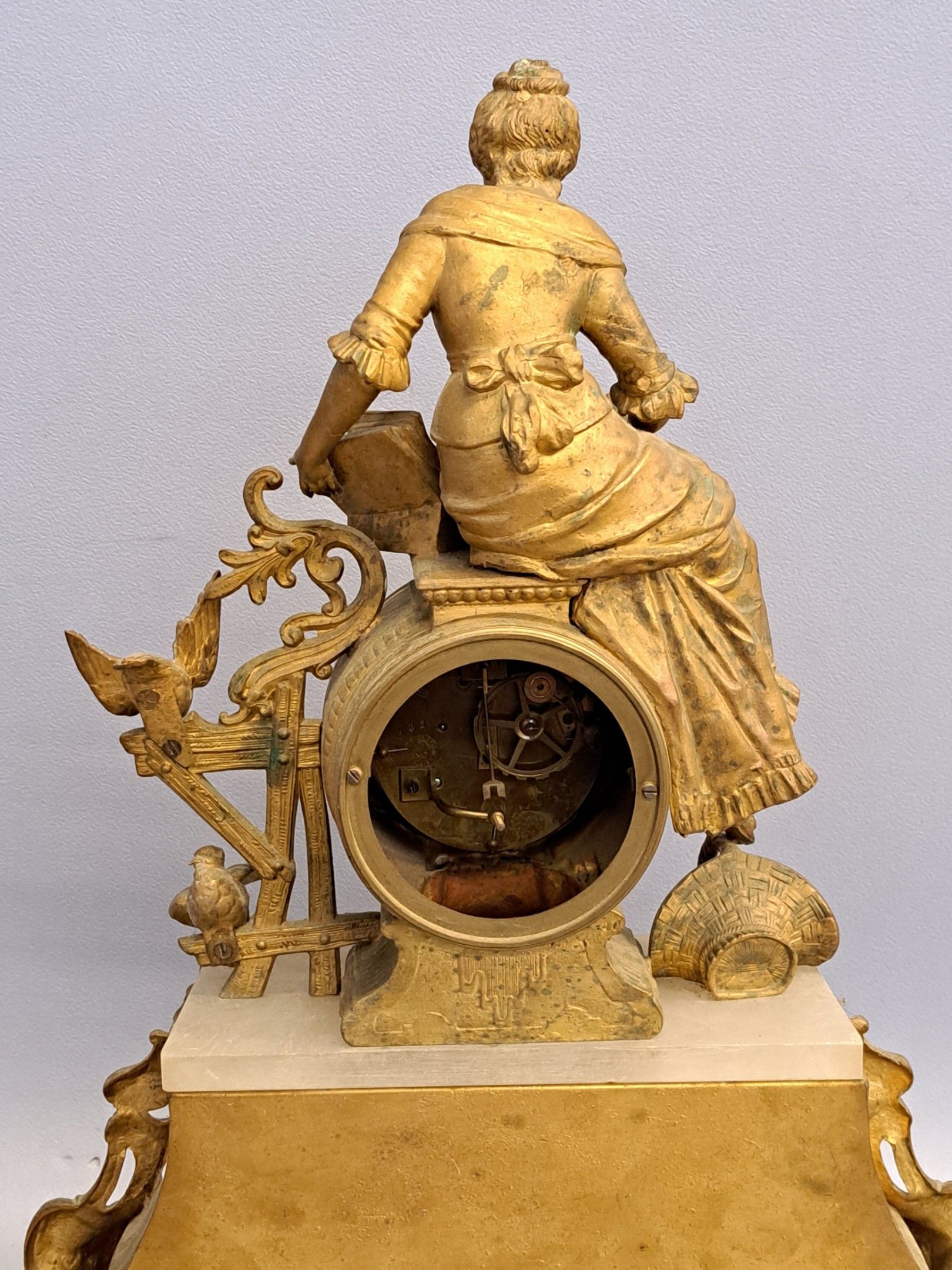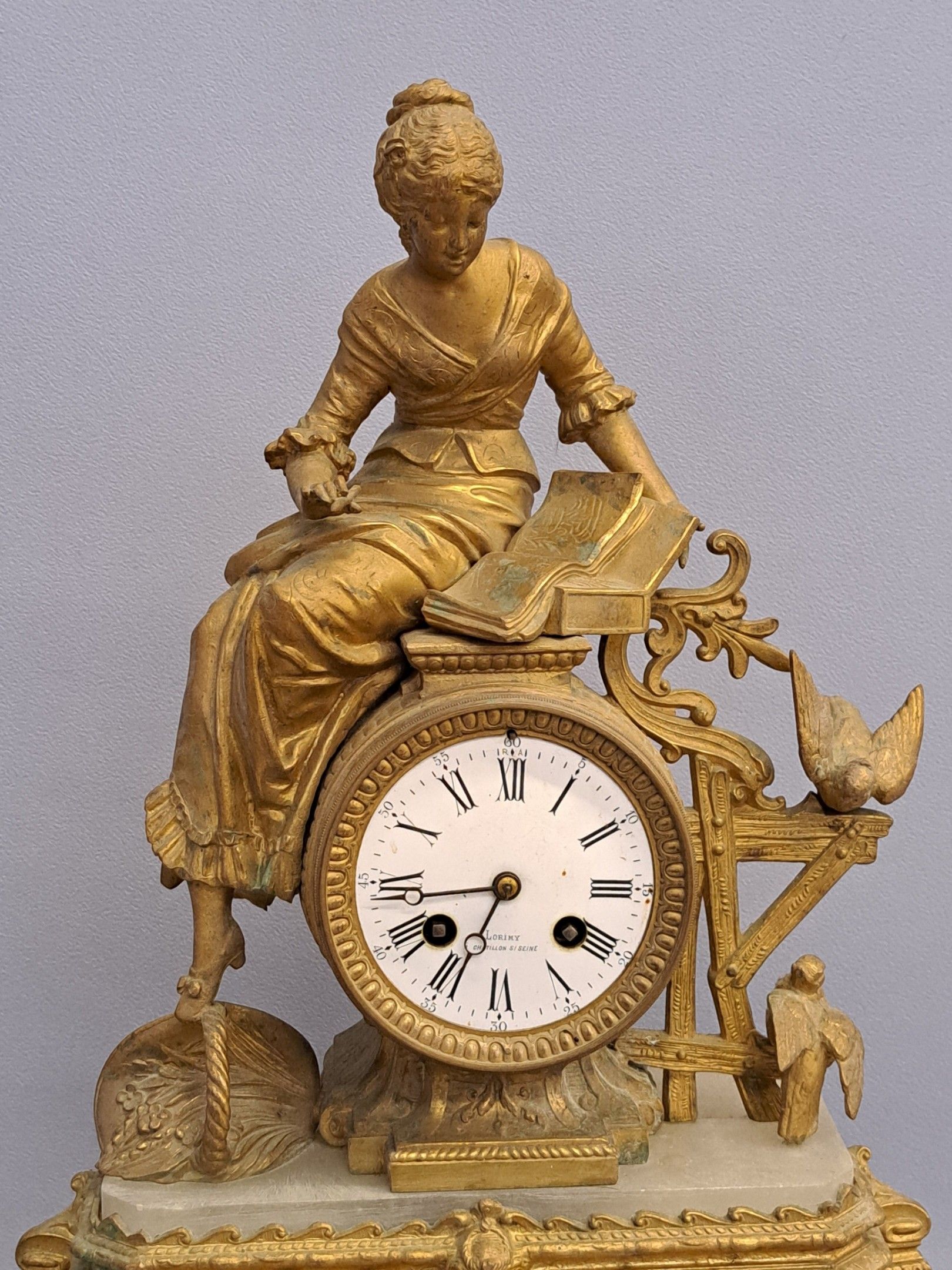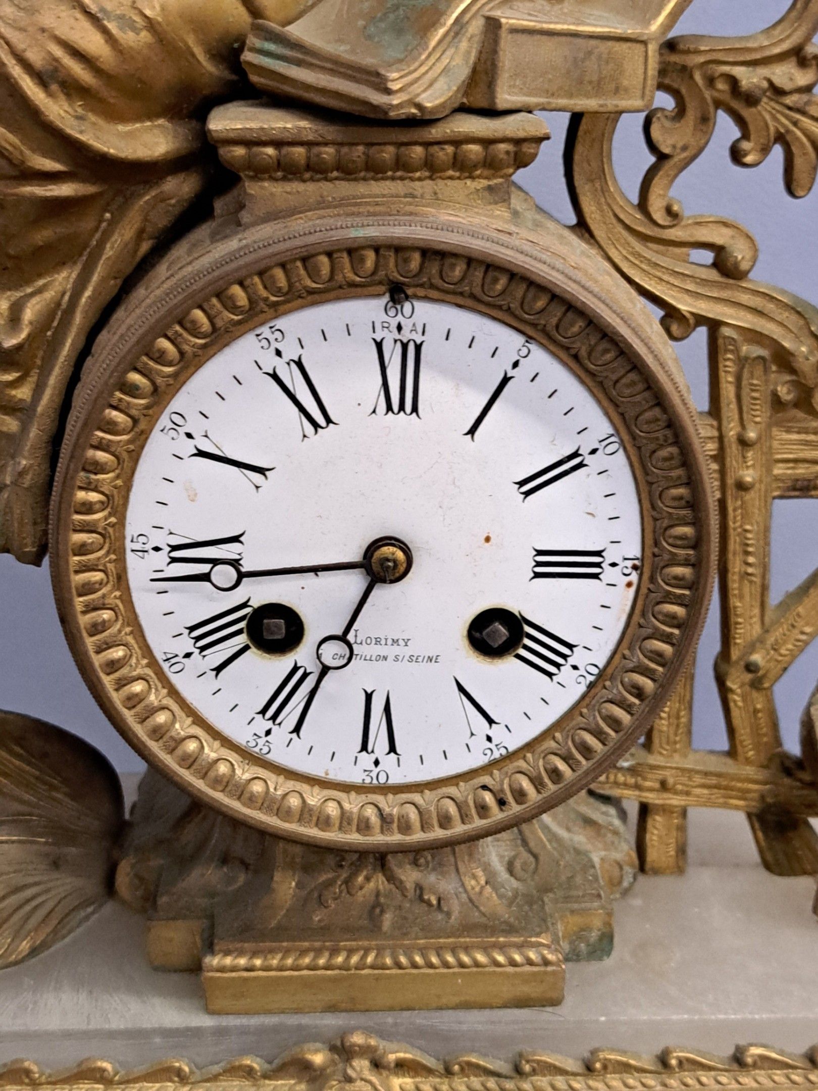 Gilt metal clock decorated with a woman drawing, white dial signed Lorimy in Châtillon sur Seine.