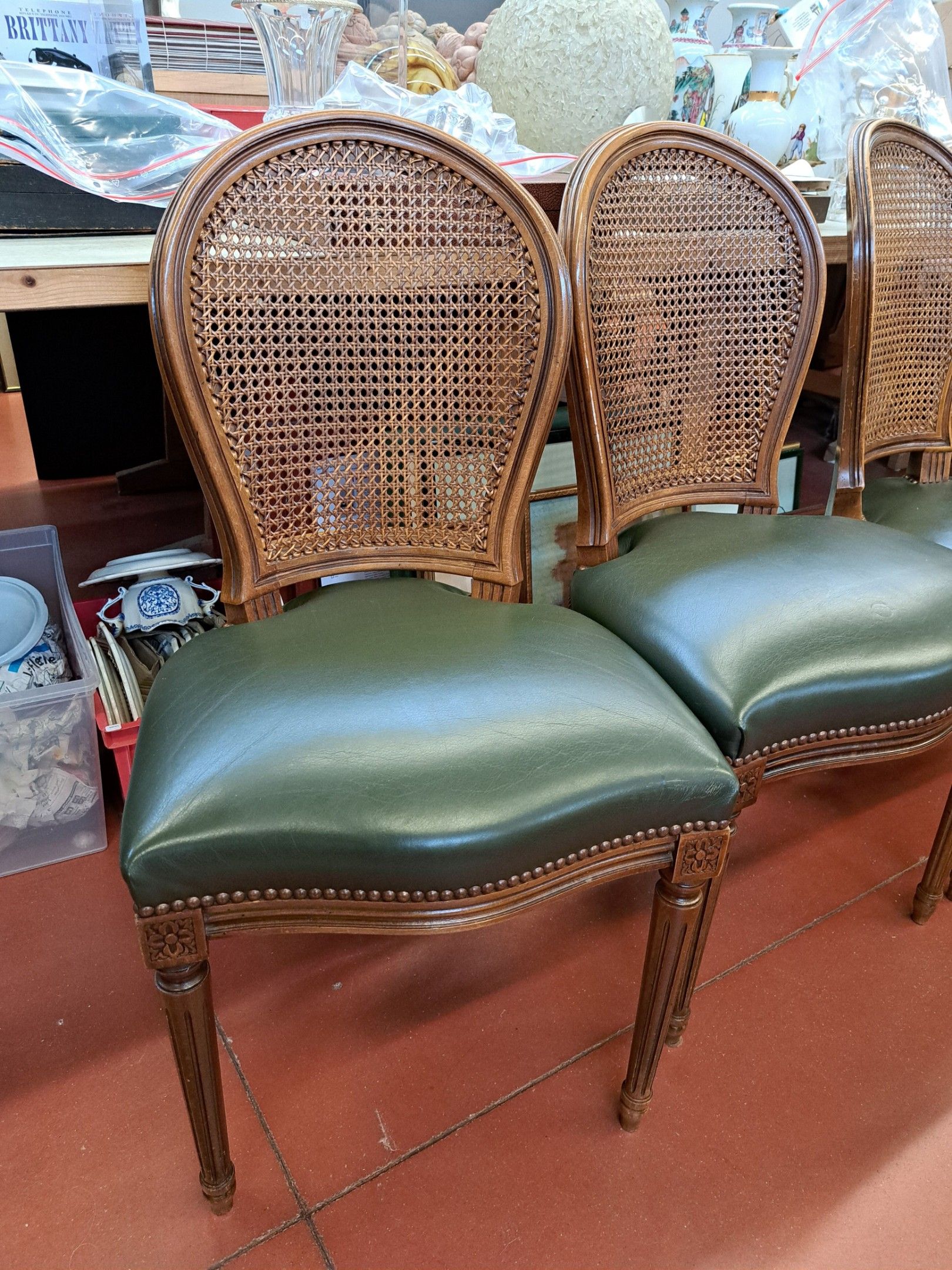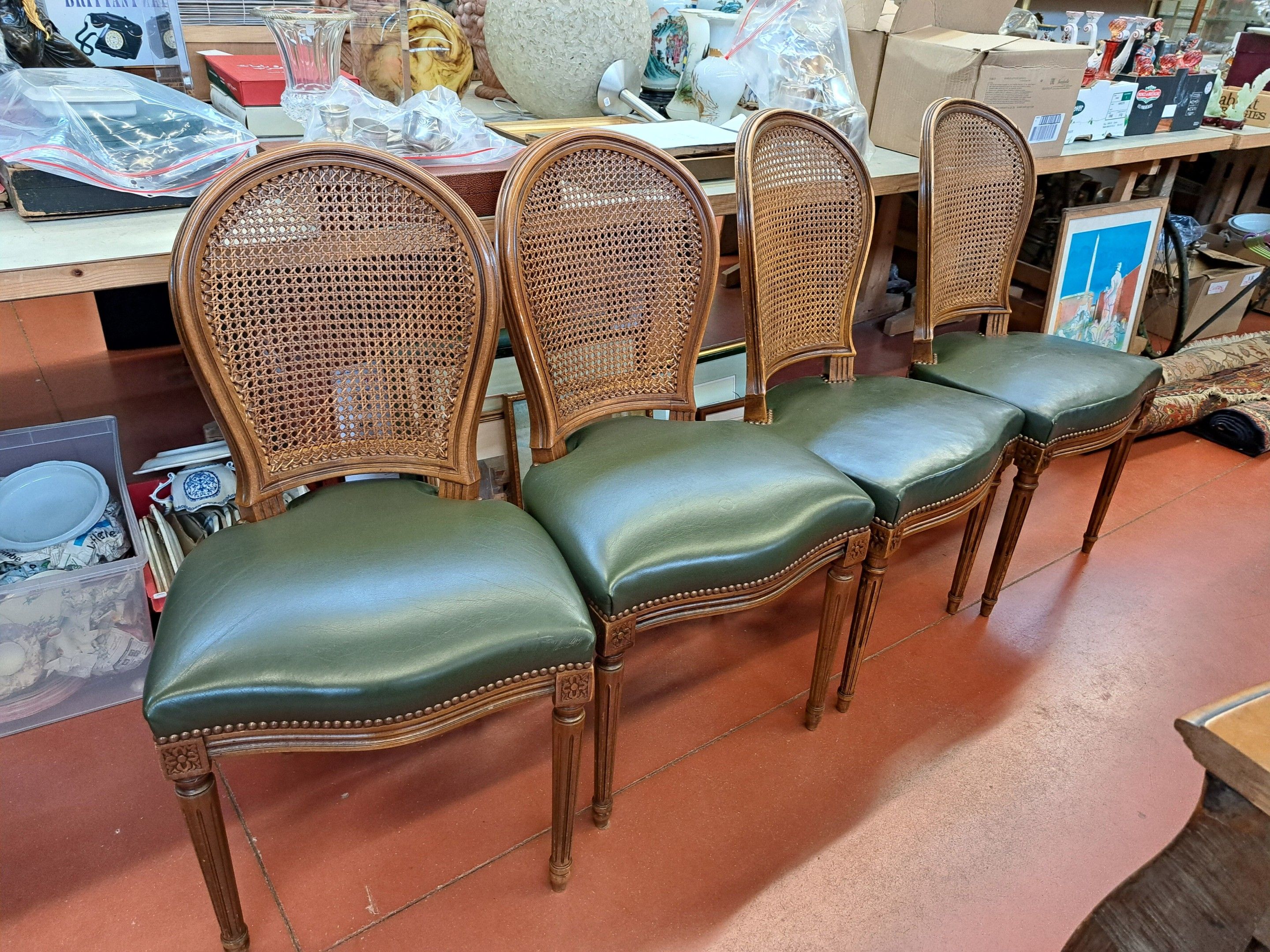 Suite of 4 carved walnut chairs in the Louis XVI style with green leatherette upholstered seat and fluted back.
