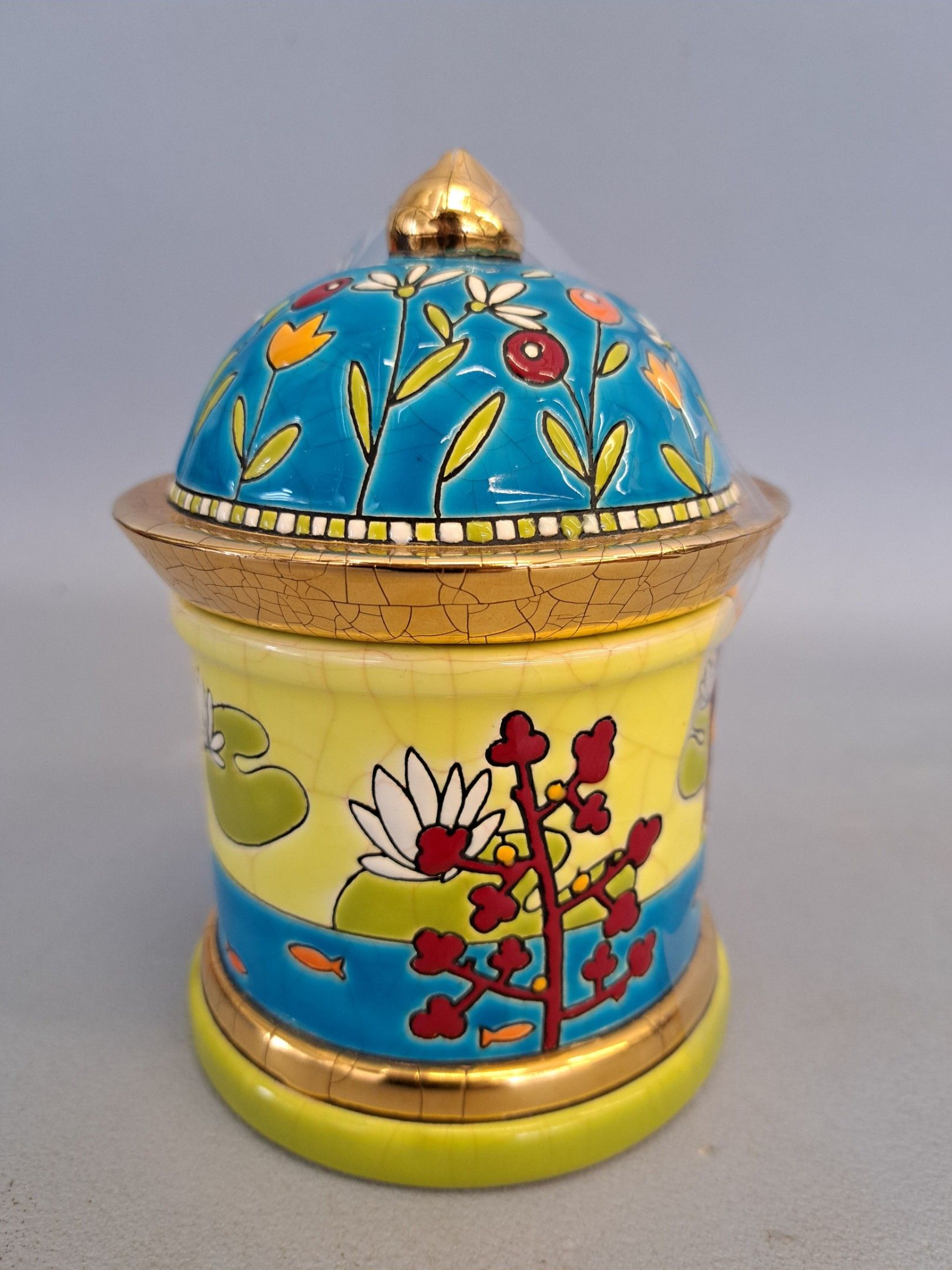 Kiosk box in enamel on a blue background decorated with fish, water lilies and plants. Signed under the base.