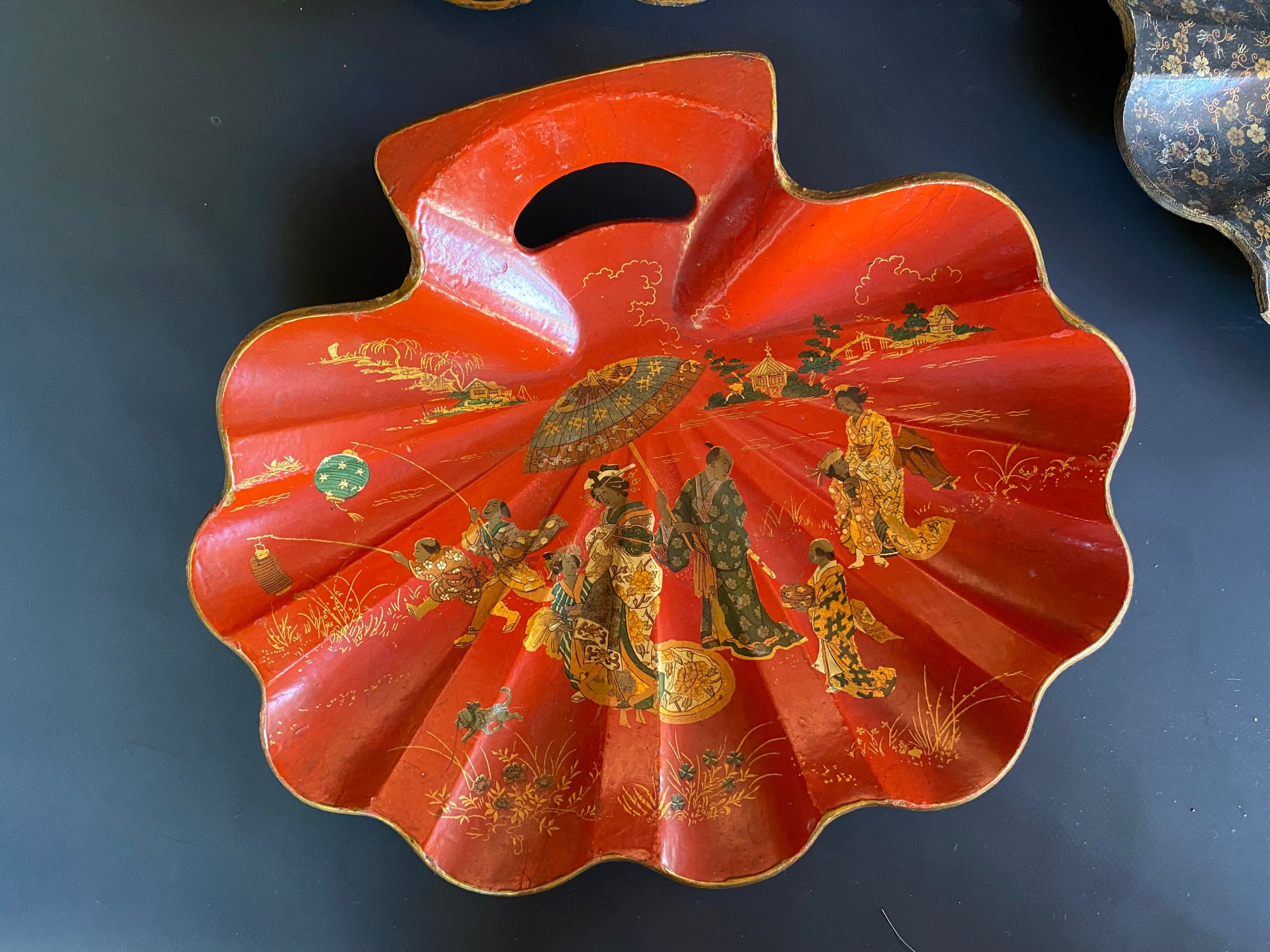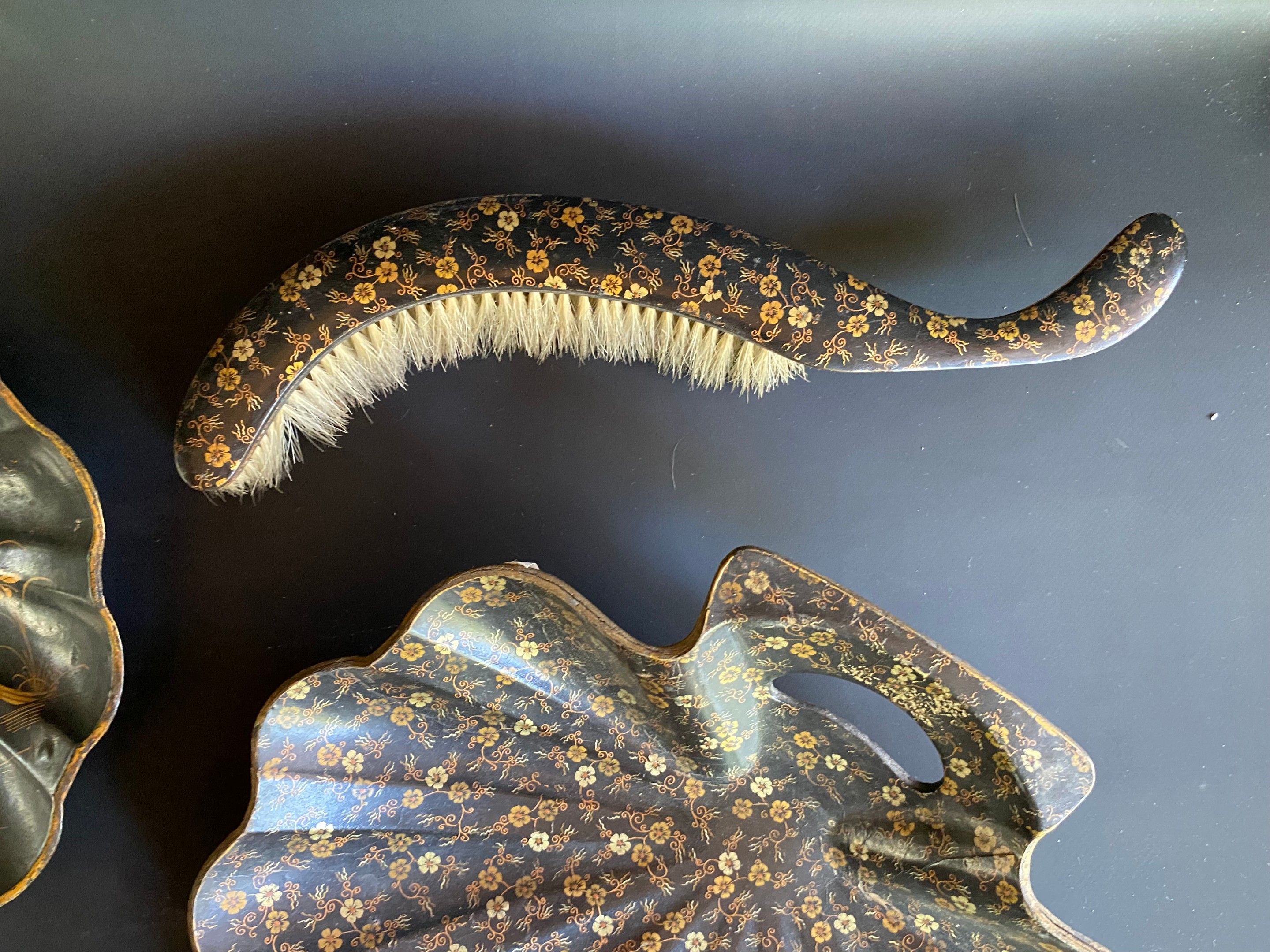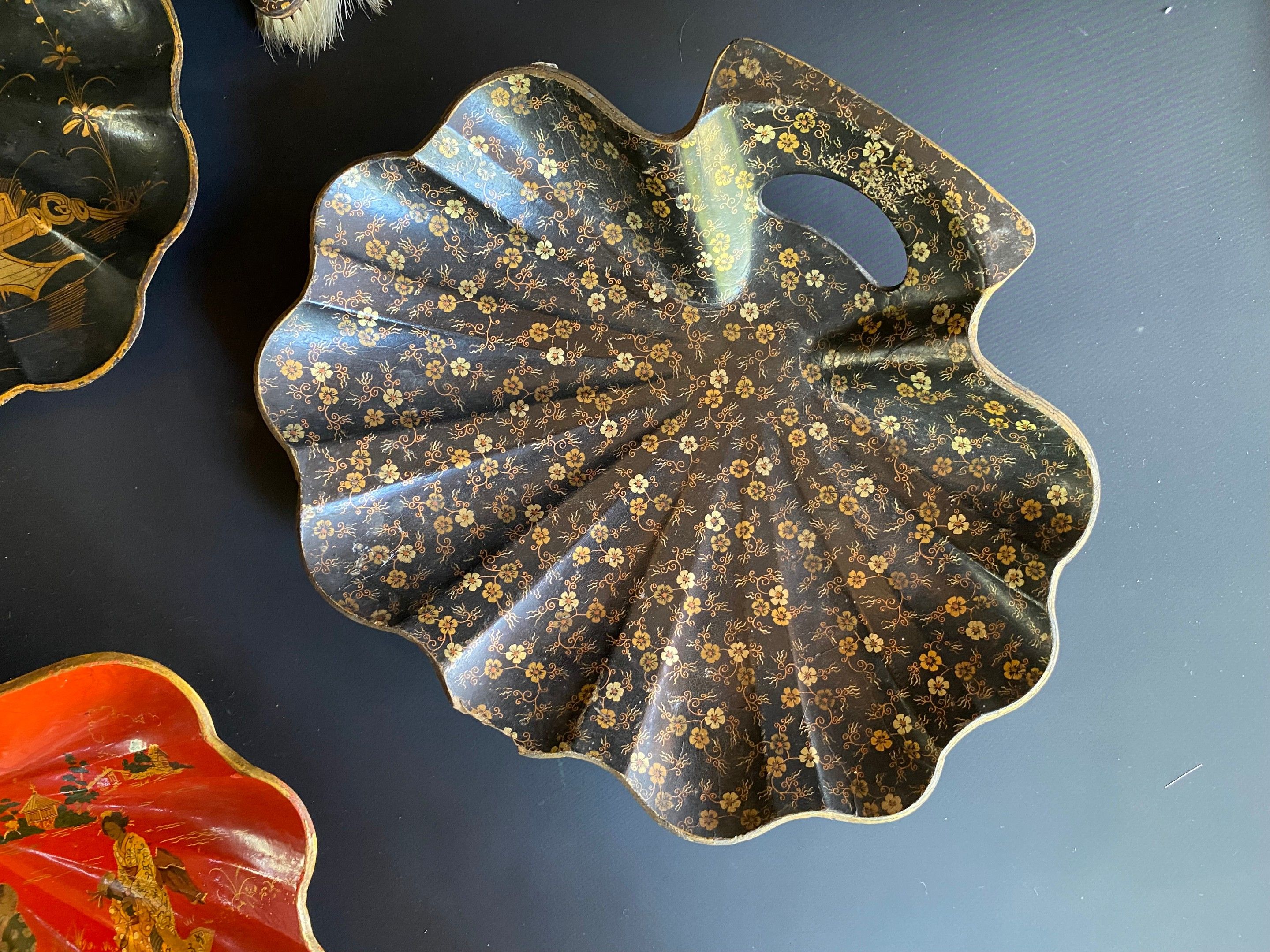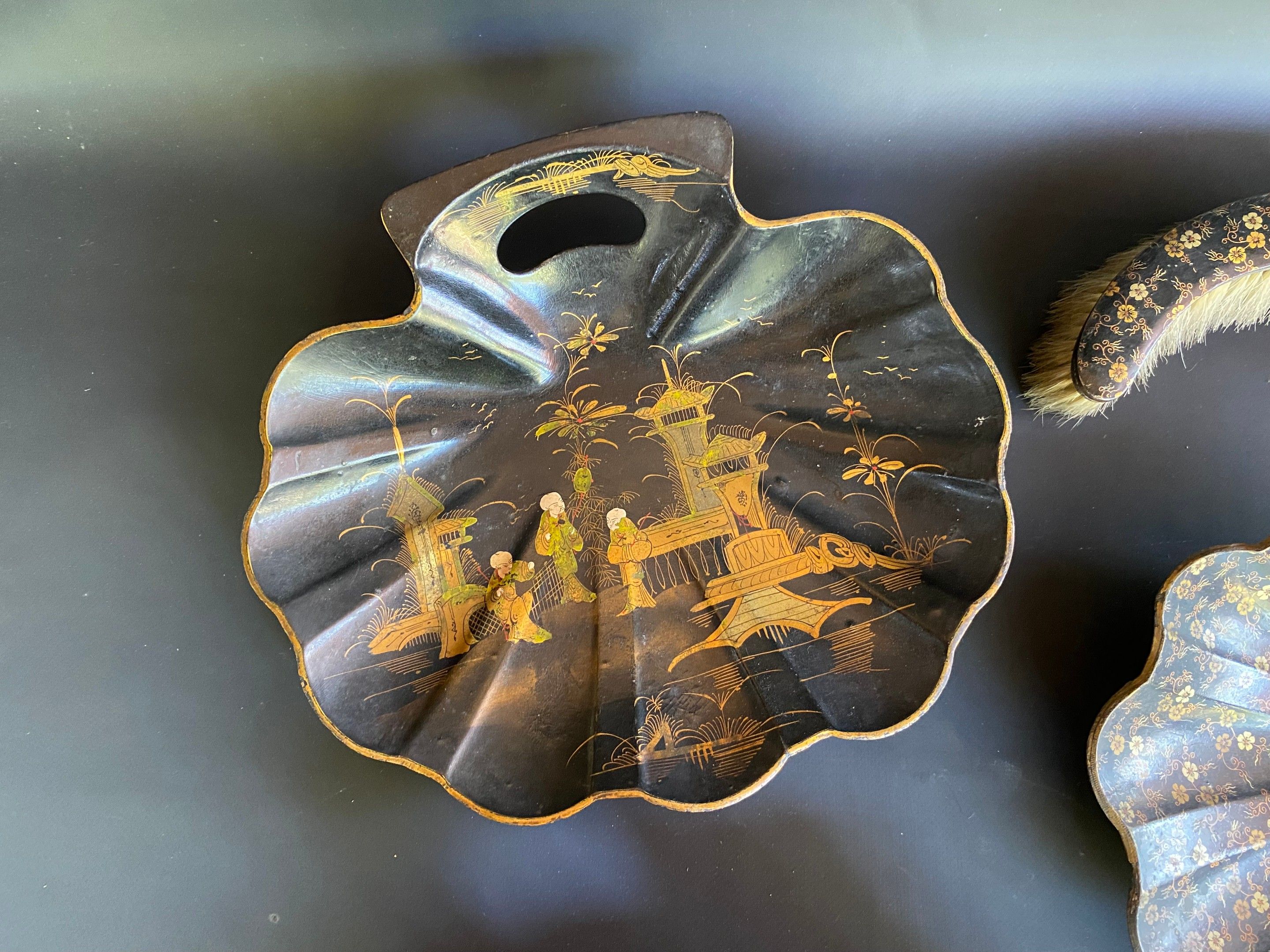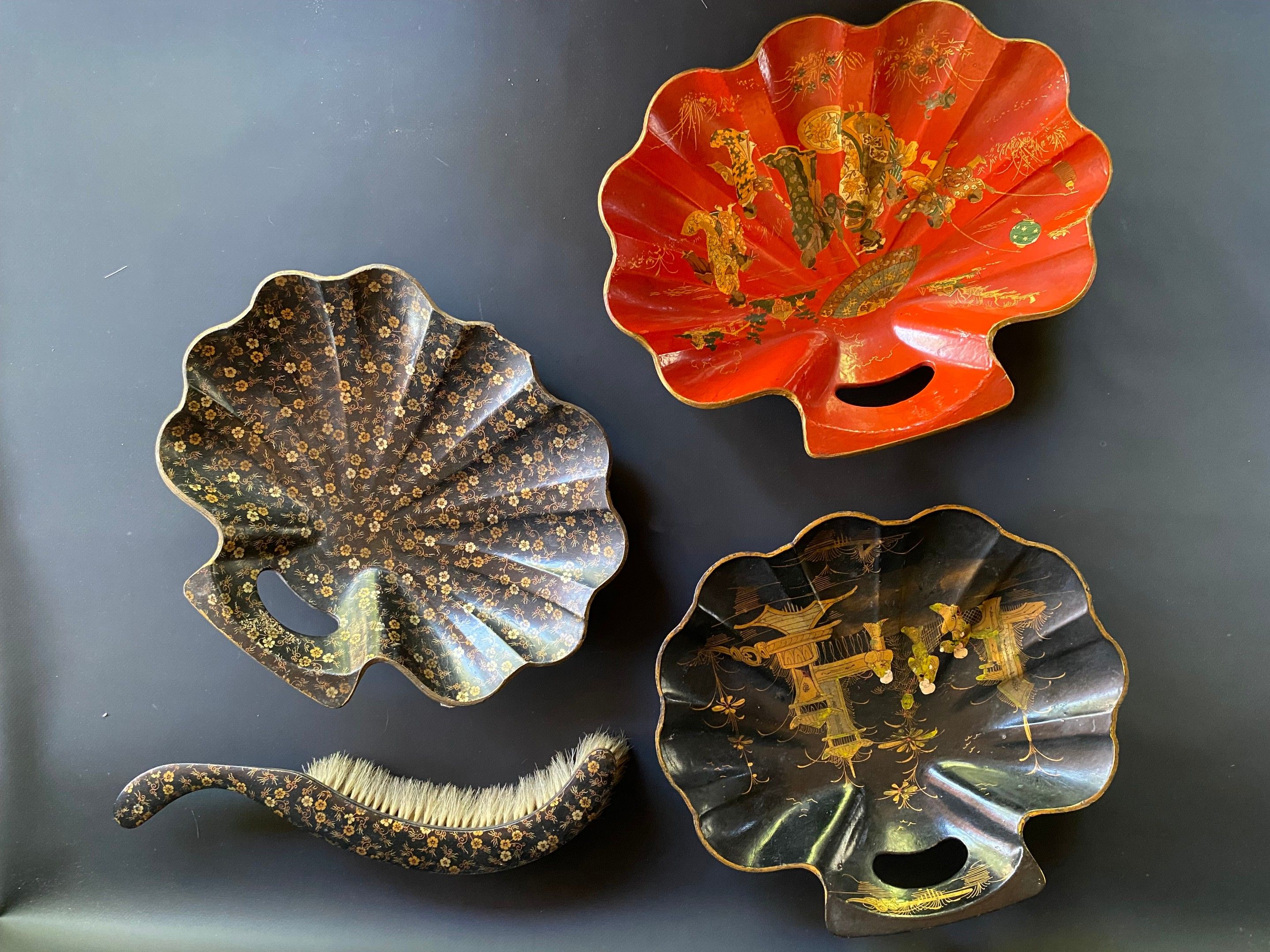 3 papier mâché crumb trays and a shovel, one decorated with semi flowers on a black background, one decorated with a vermilion character and a black background decorated with a palace from the Napoleon III period ( 26 x 30, 5 x 4 cm )