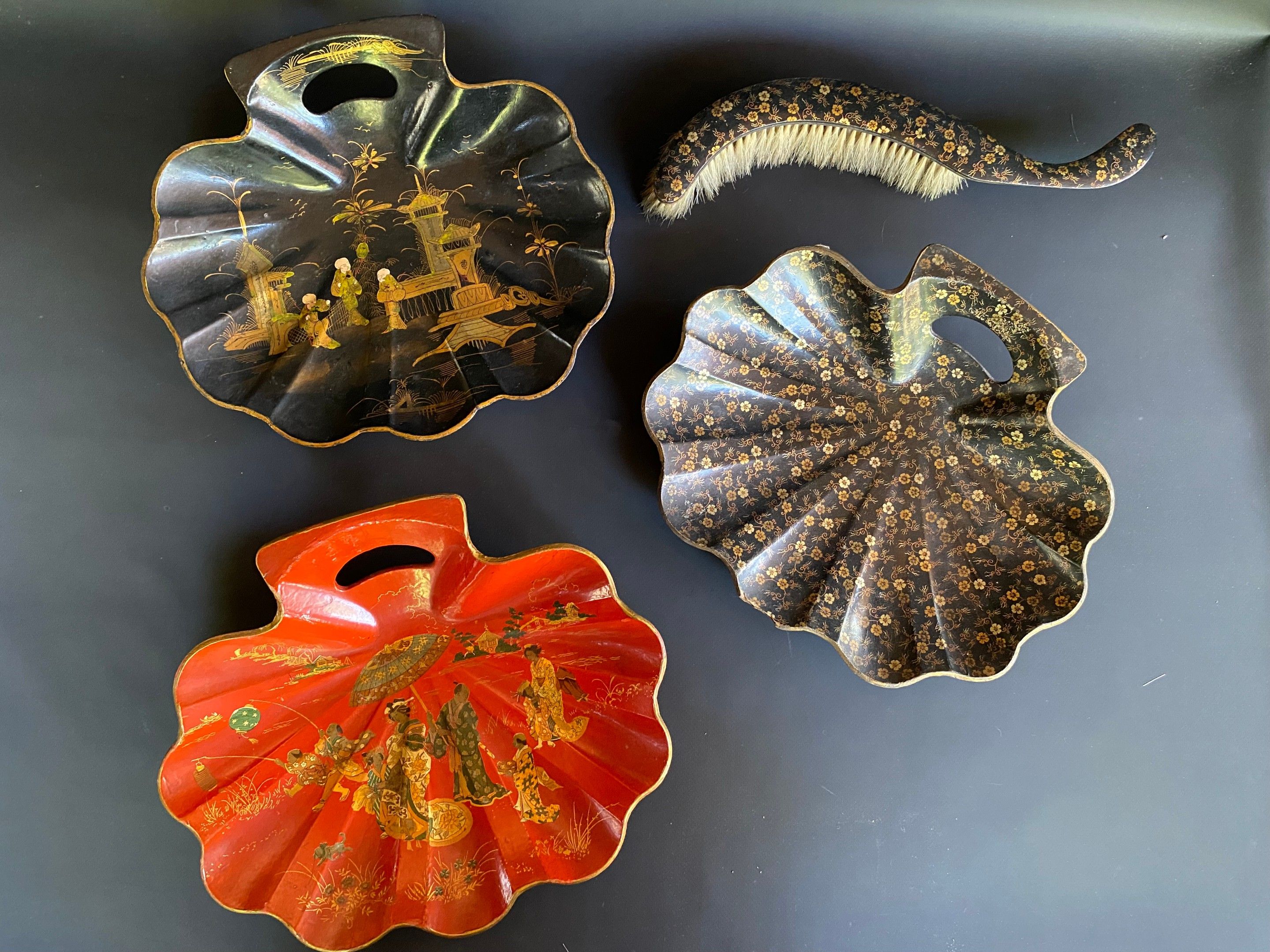 3 papier mâché crumb trays and a shovel, one decorated with …