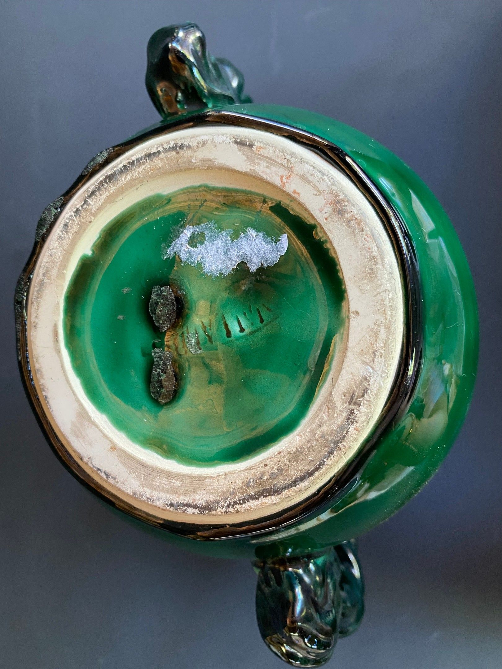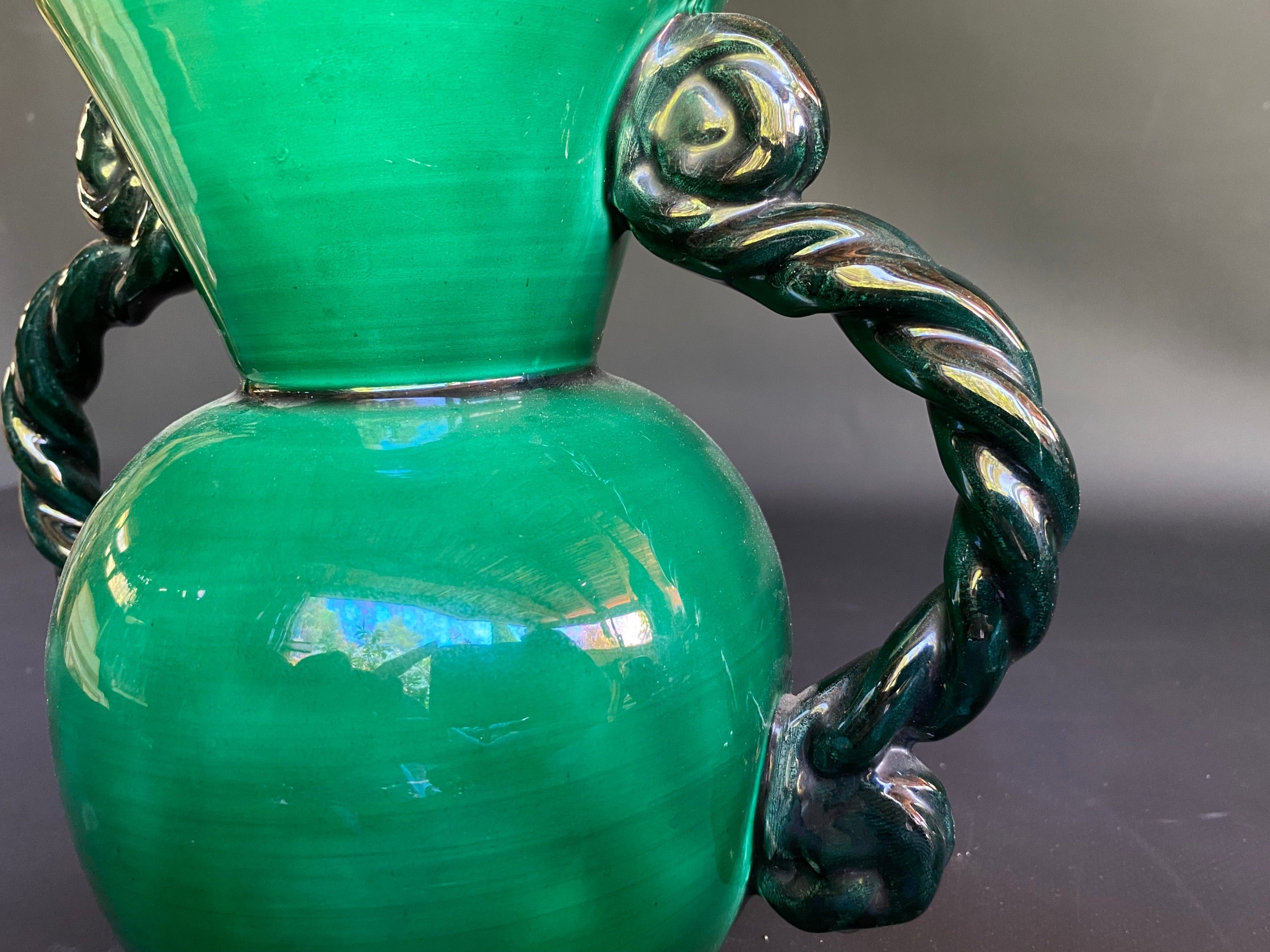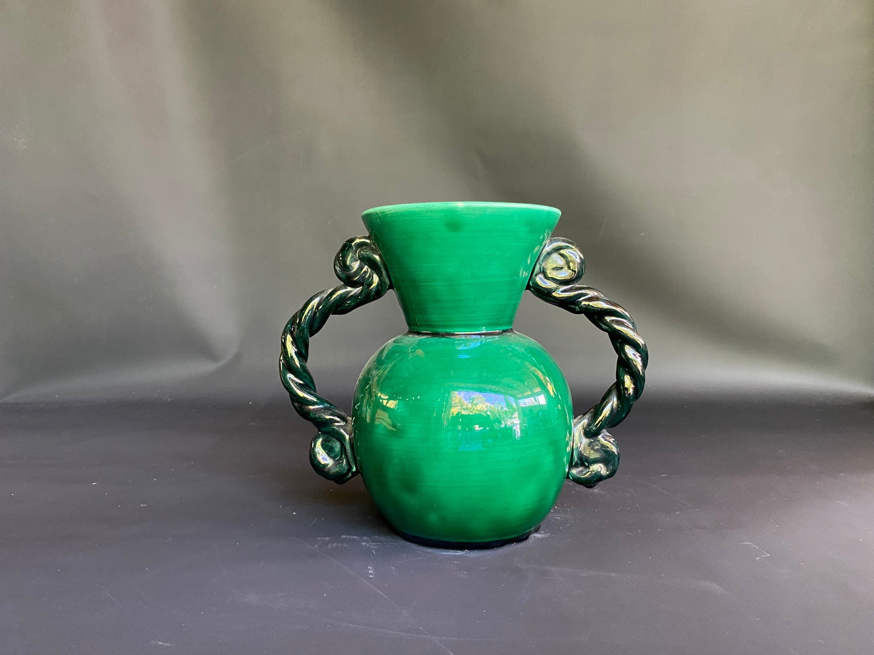 VALLAURIS , vase with handle in green barbotine h