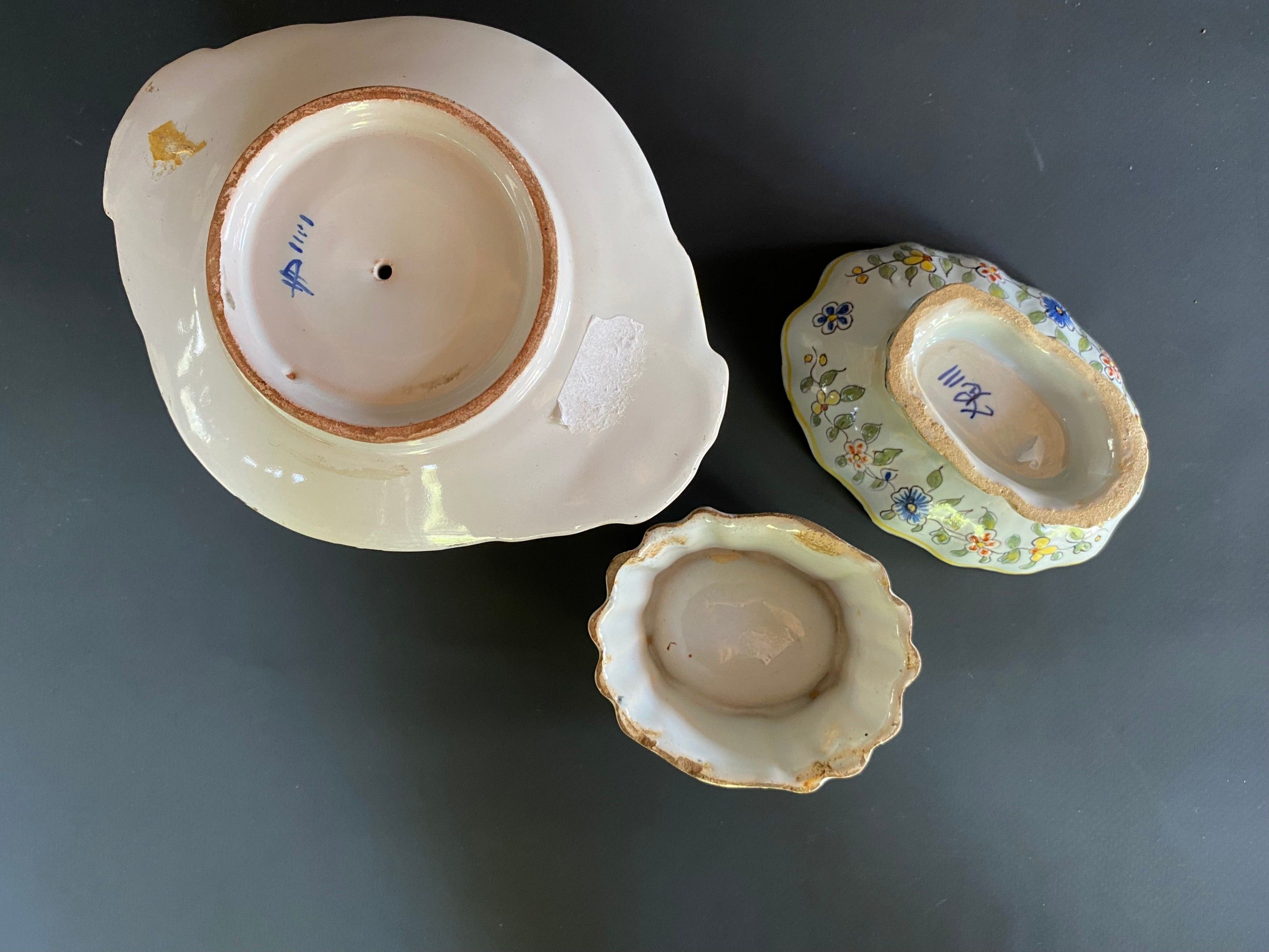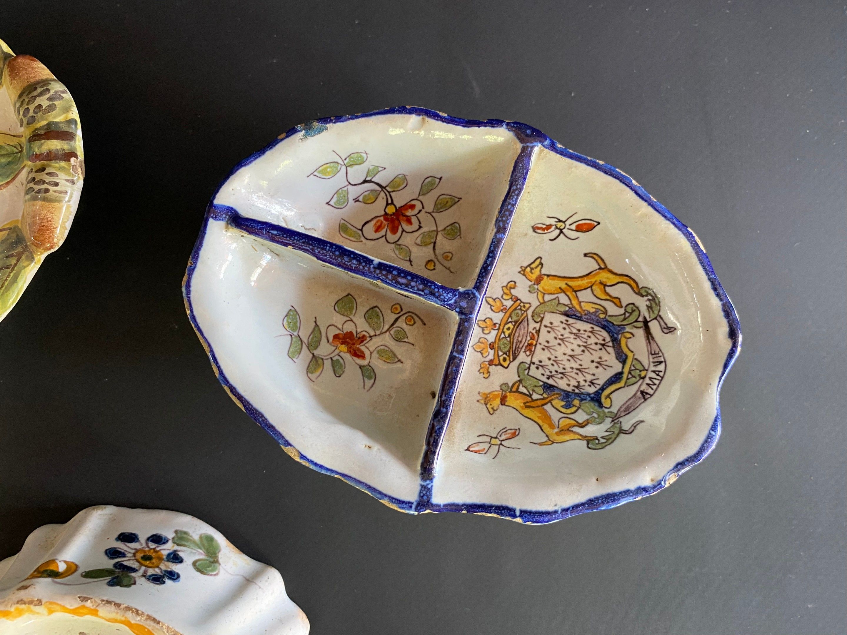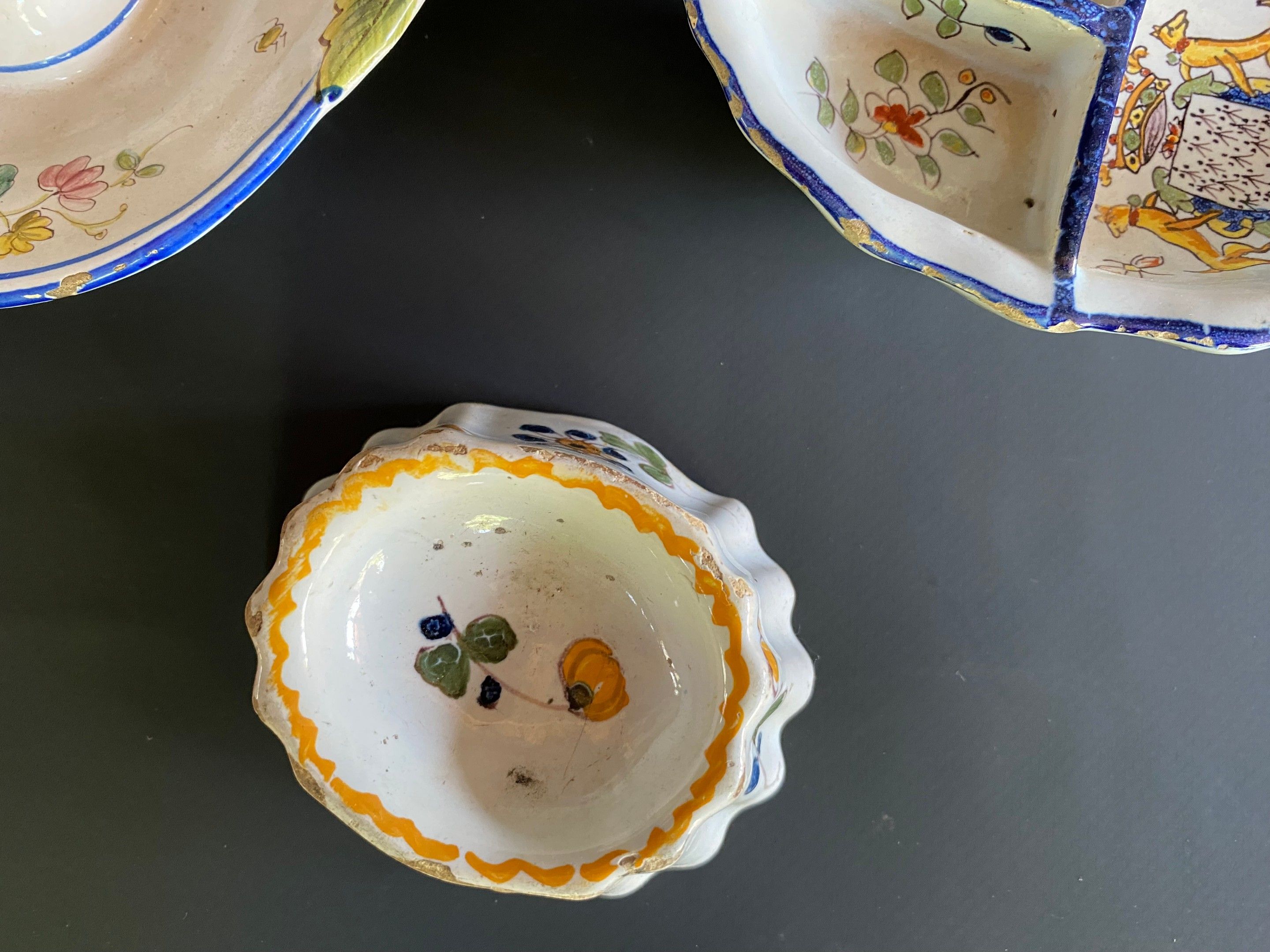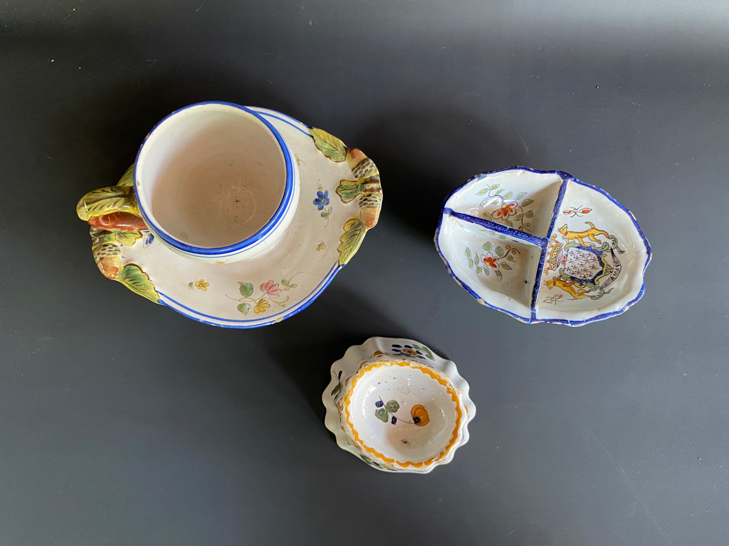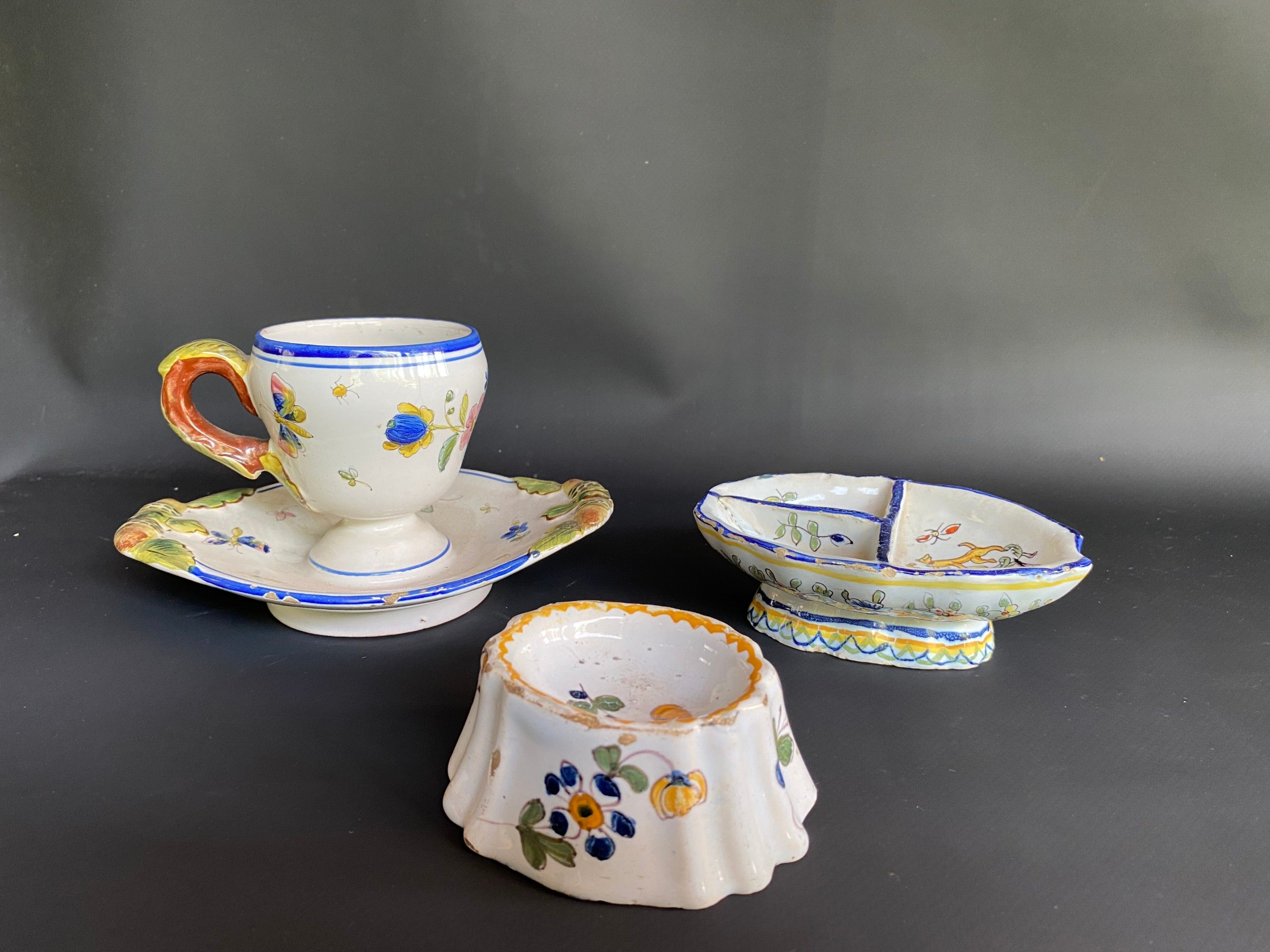 Set of earthenware including two salt cellars (Quimper and Nevers) and a mustard pot and its frame.