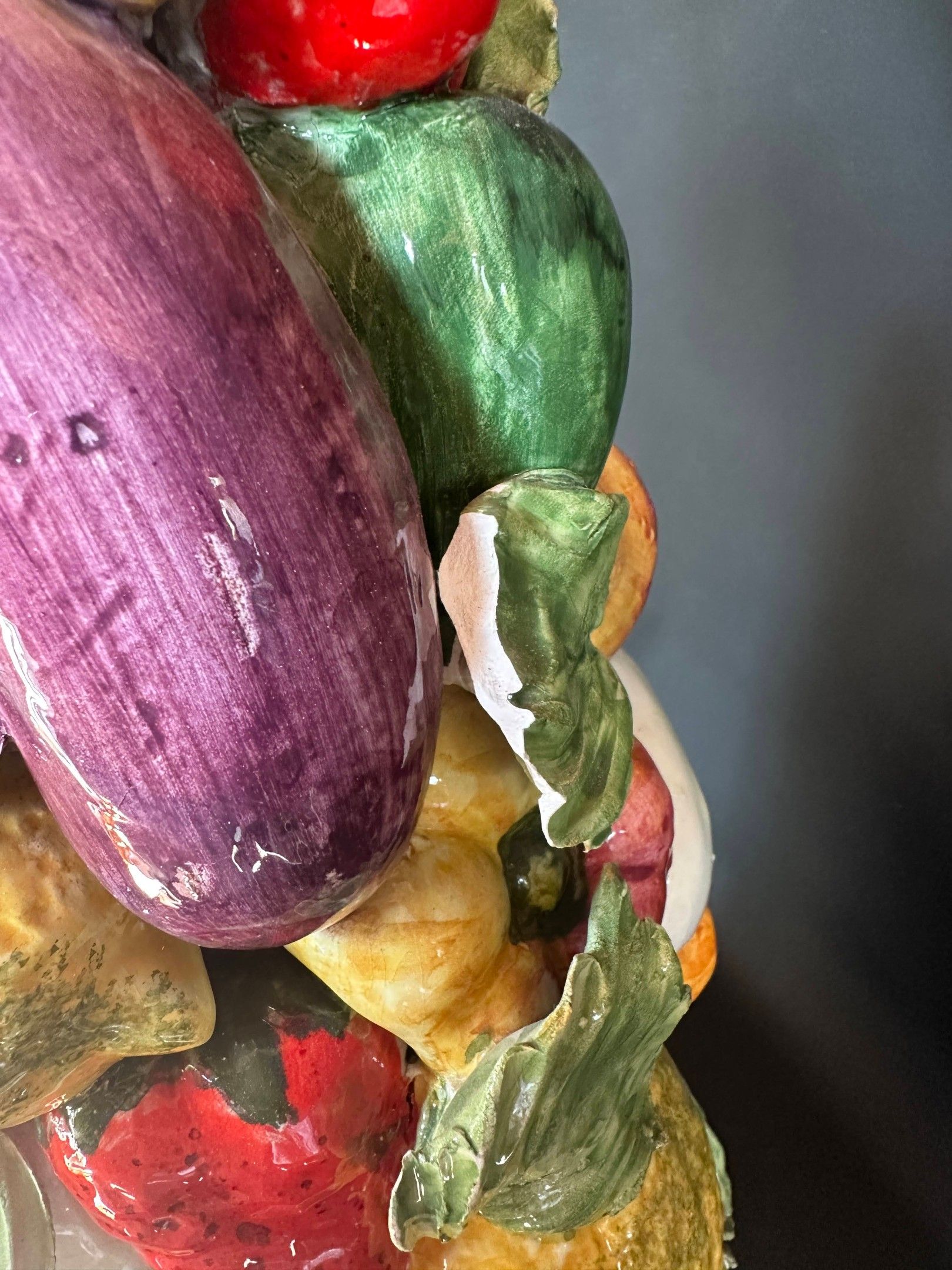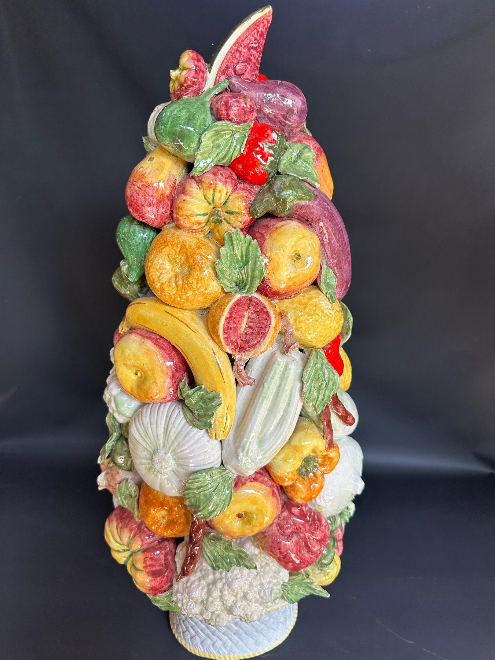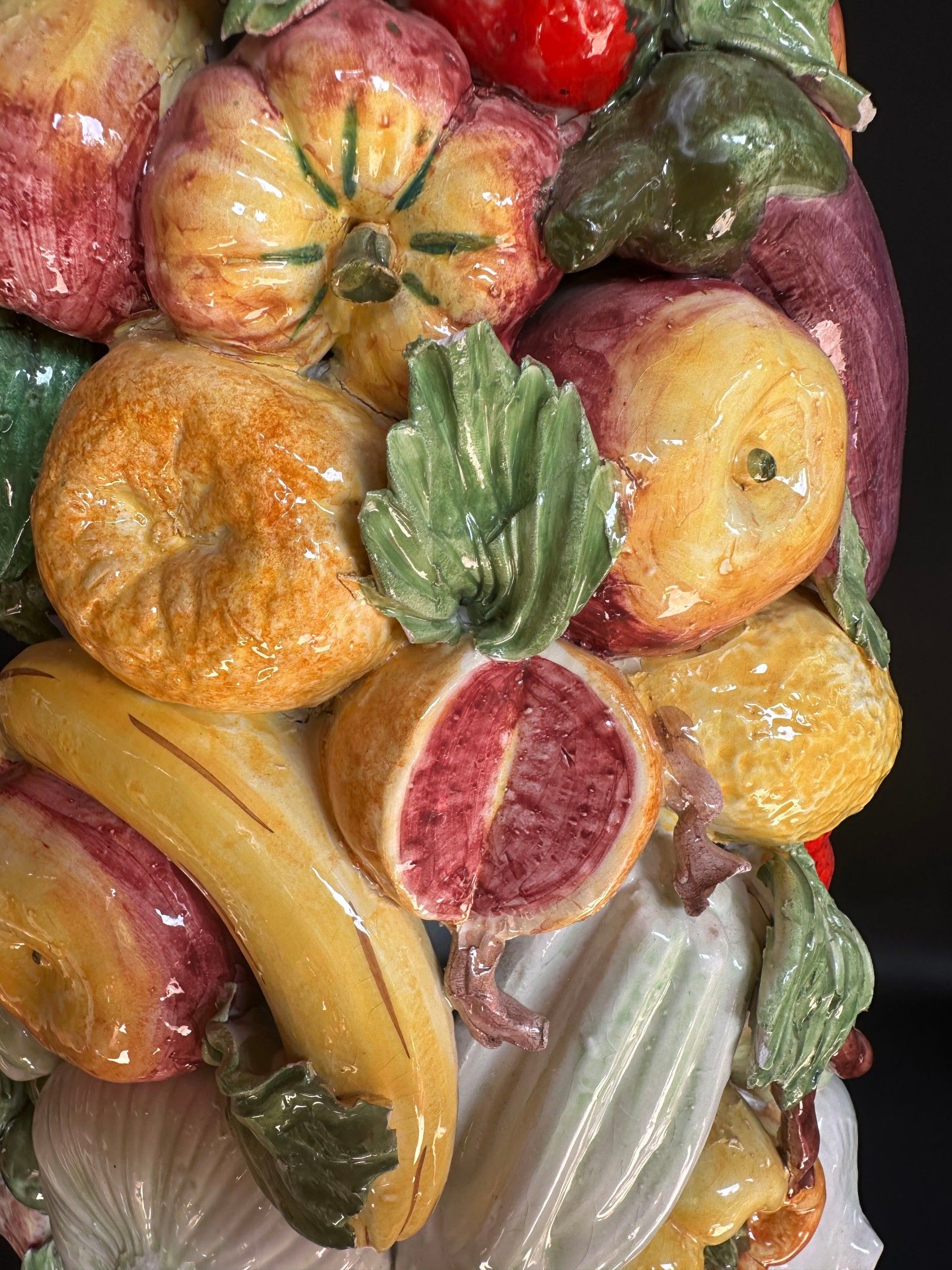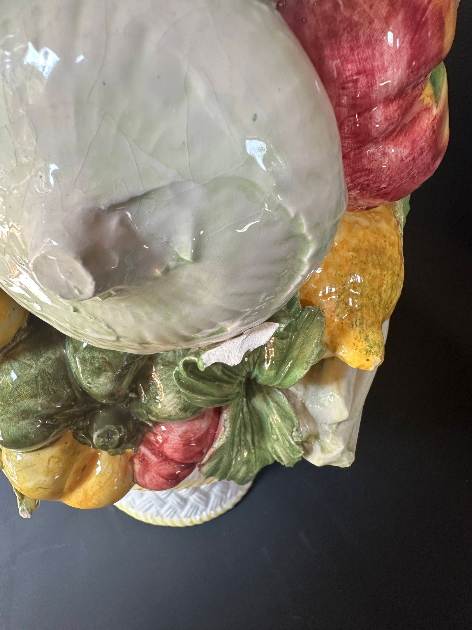 Monumental centrepiece in barbotine depicting a basket of fruit with lemons, pomegranates, apples and tomatoes, fennel, aubergines and cauliflowers ...