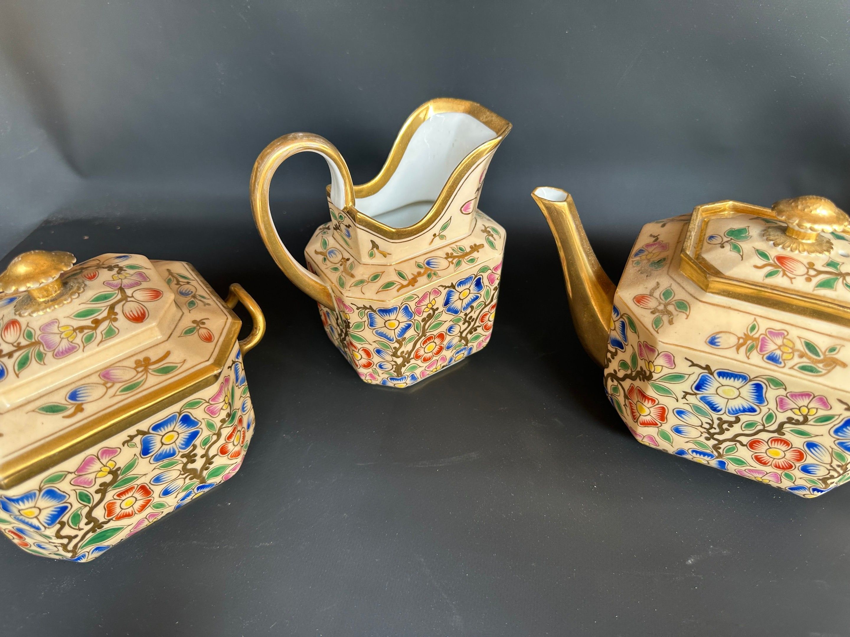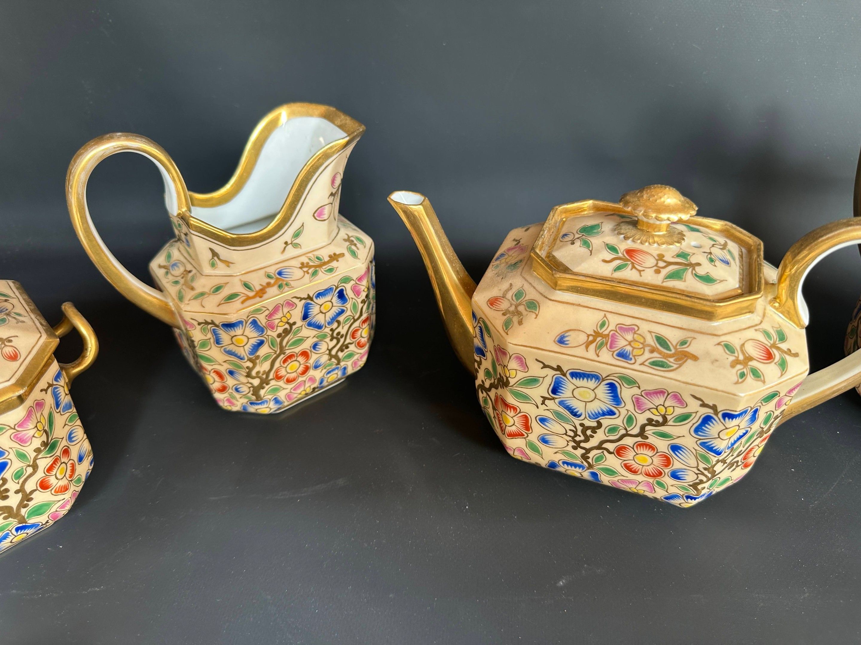 Tea service including two teapots (15 and 22 cm), a milk jug (16.5 cm) and a sugar bowl (14 cm) Cream background with floral decoration and gilding in Paris porcelain.