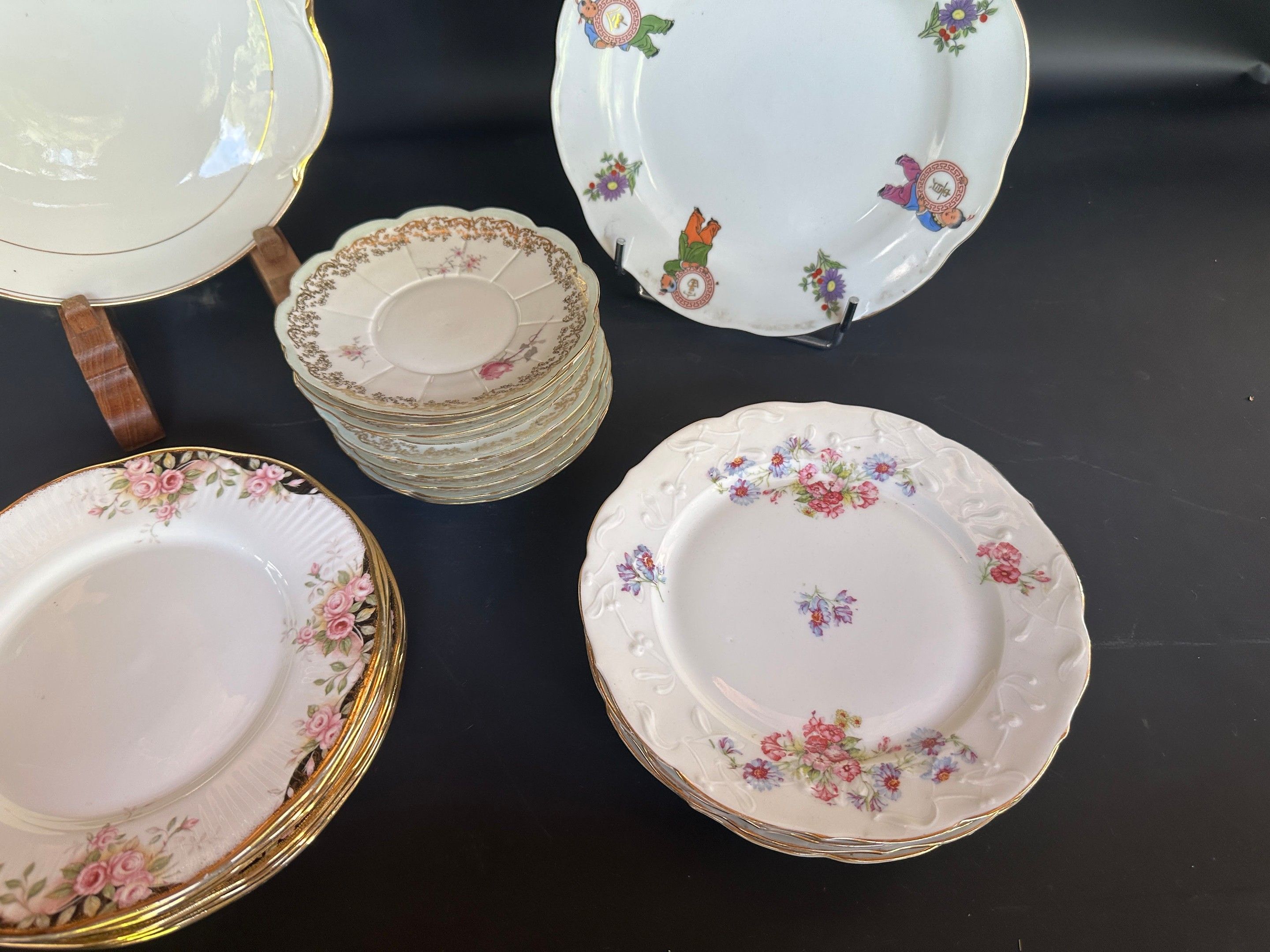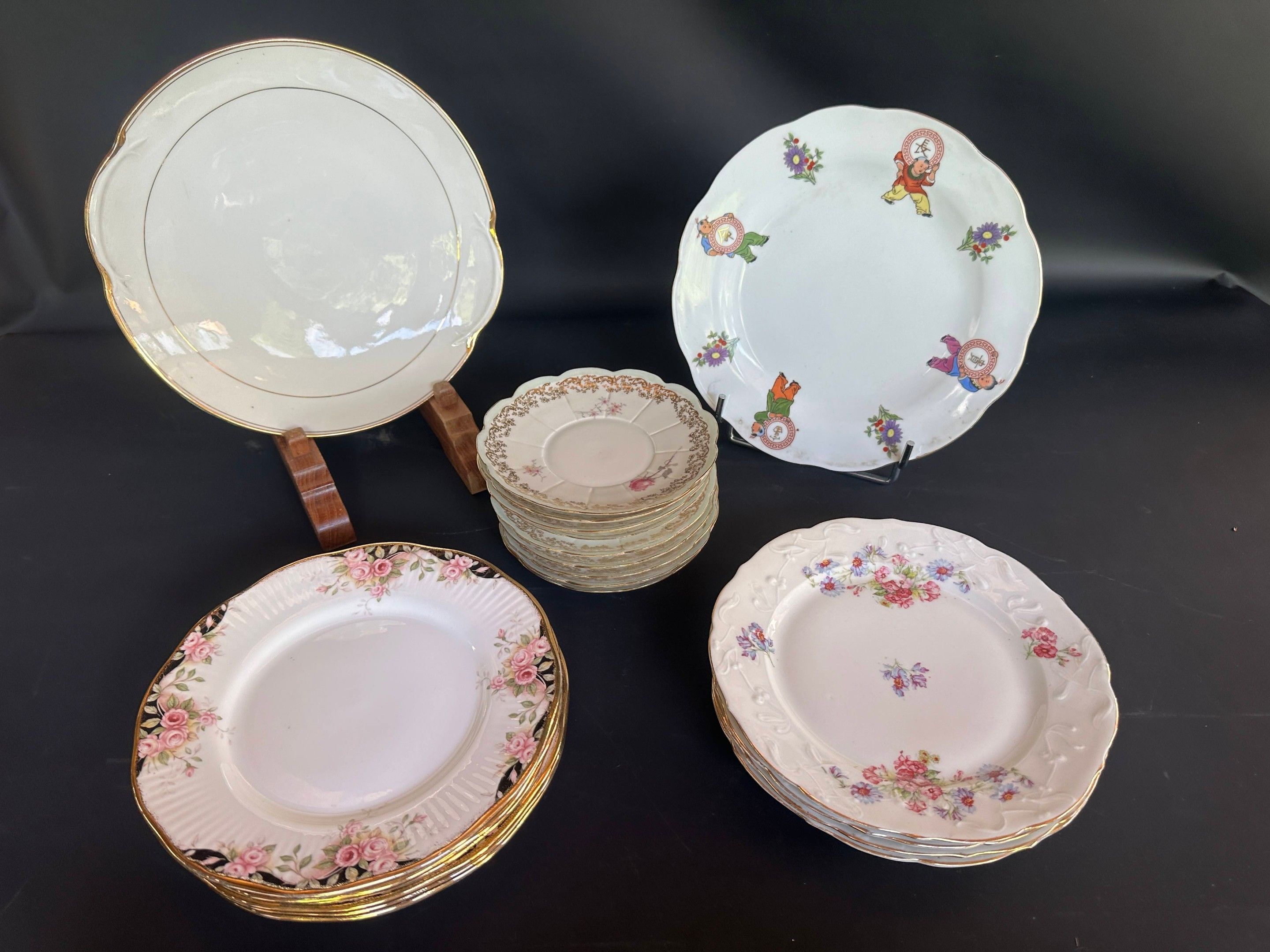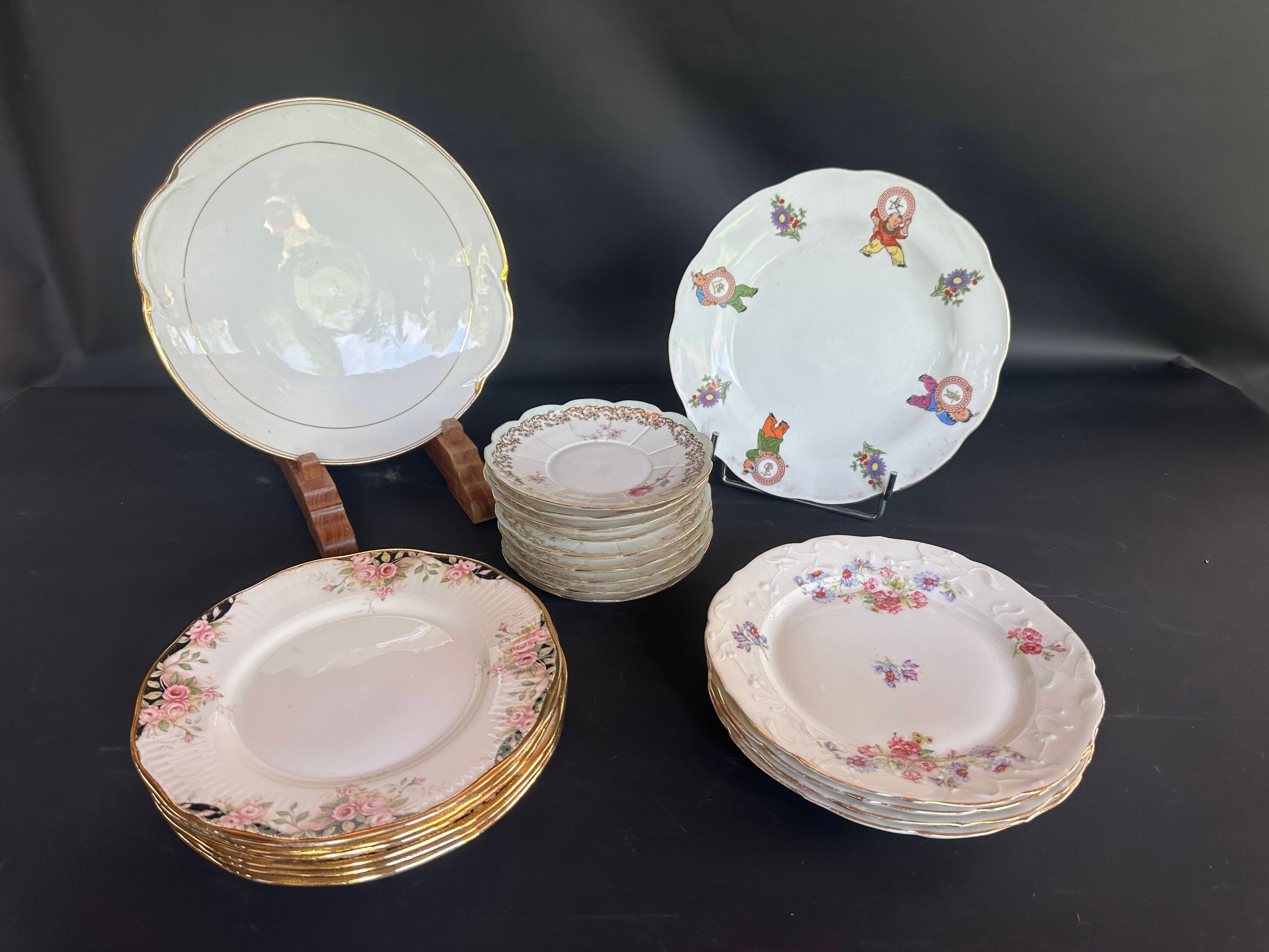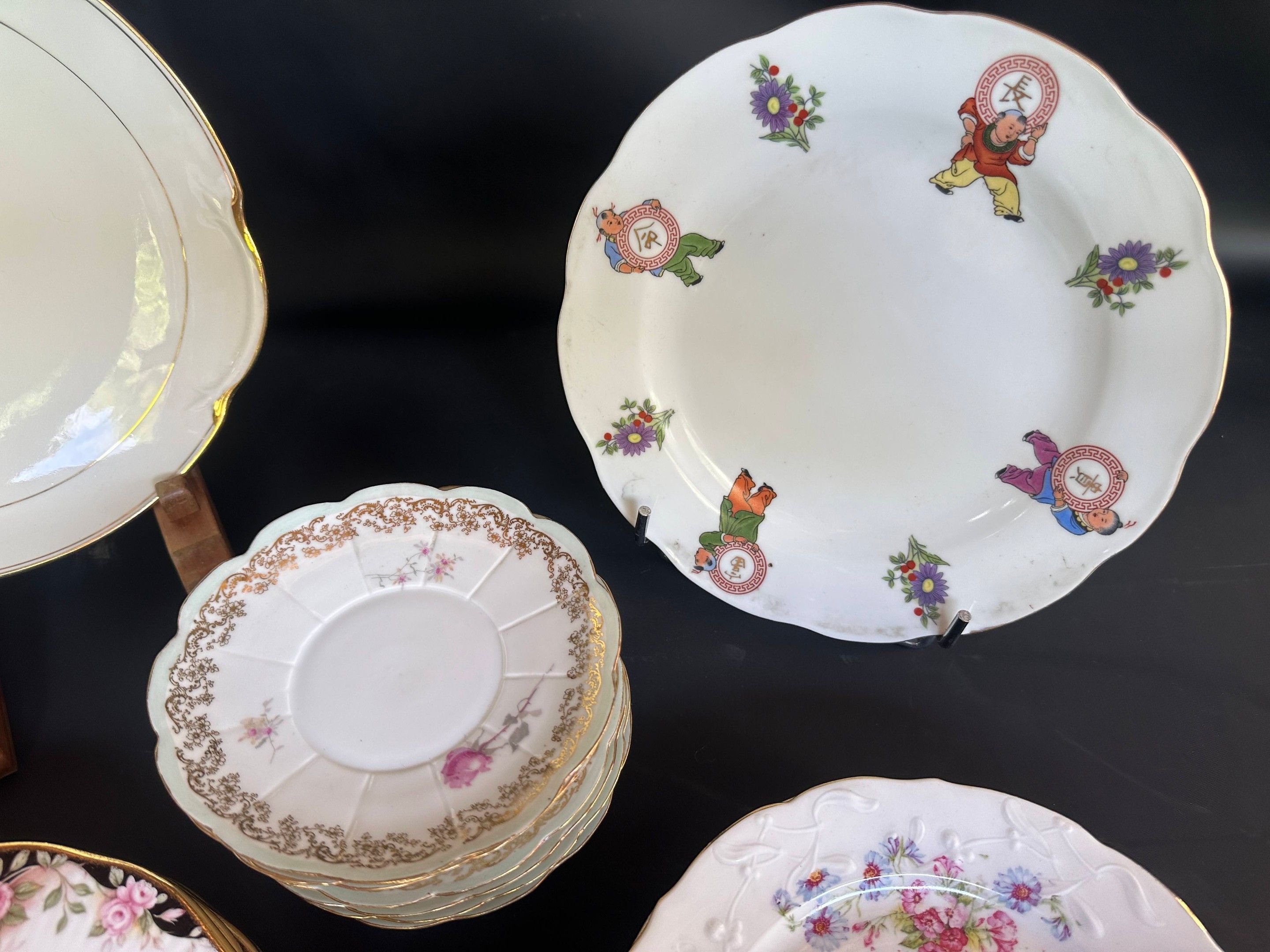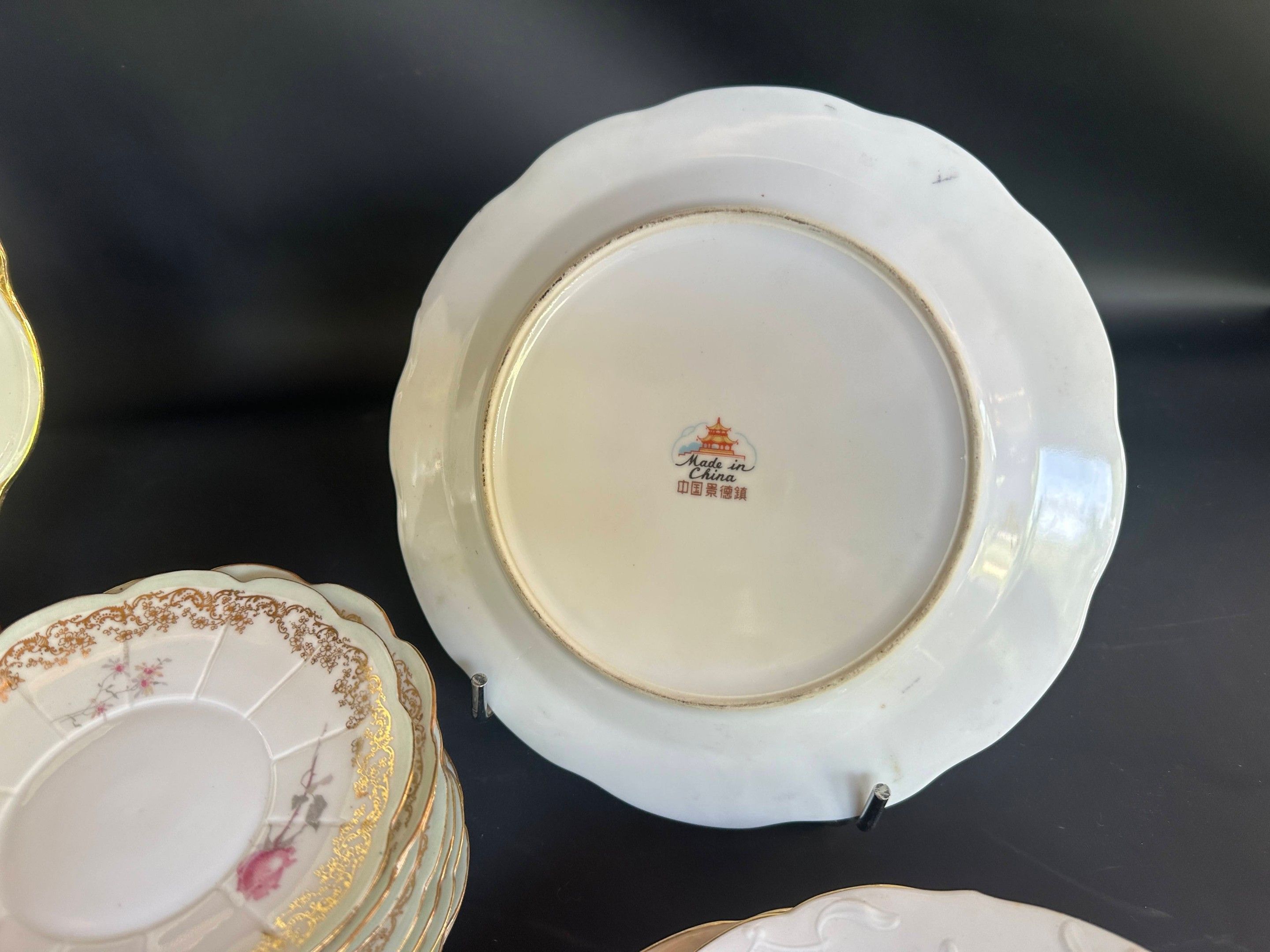 Lot of porcelain plates including 6 Queen's MODEL Midnight Rose, 4 porcelain plates, a Chinese design and a small dish, 9 porcelain saucers decorated with roses poly-lobed border and gilding enhancement