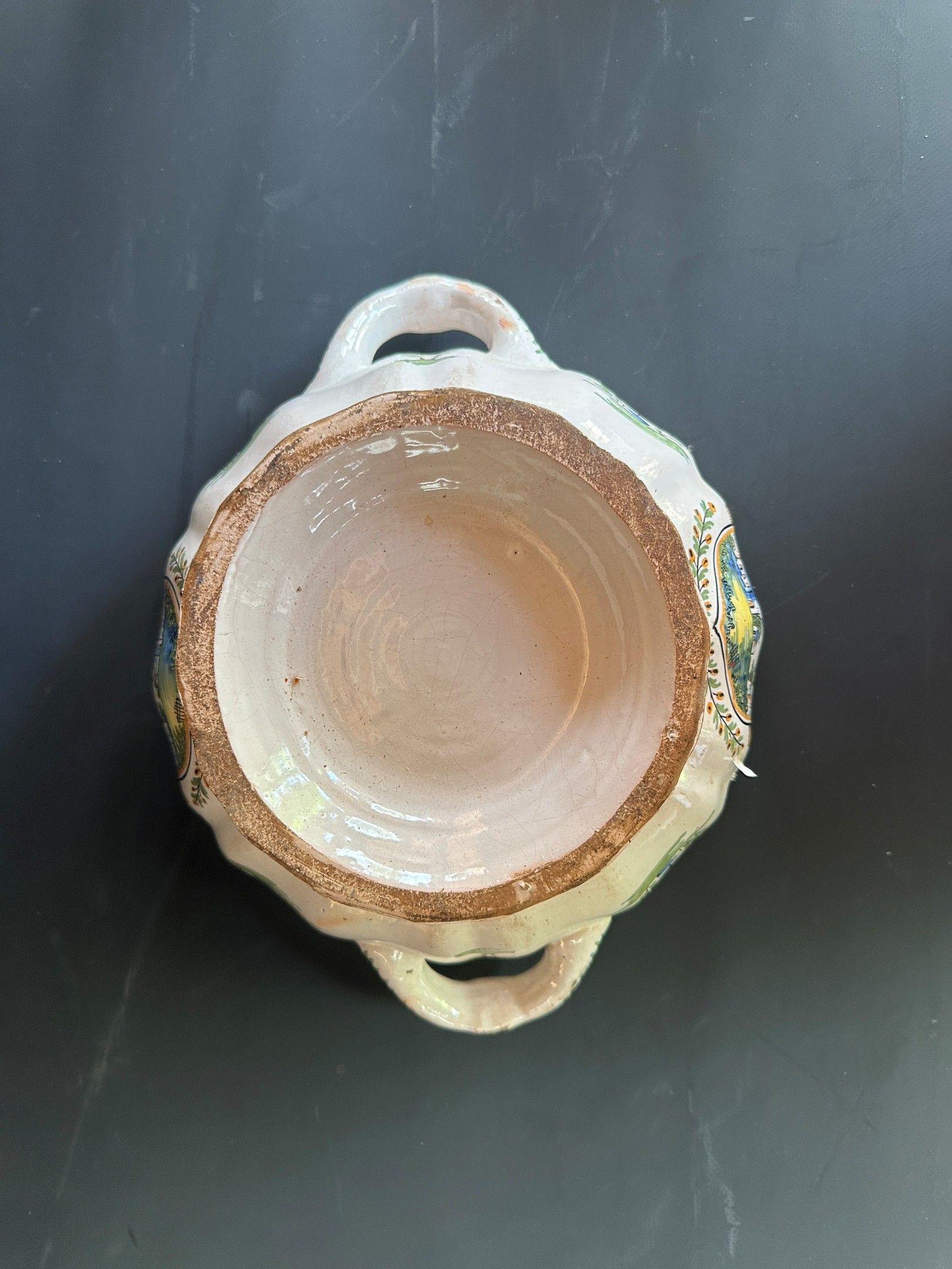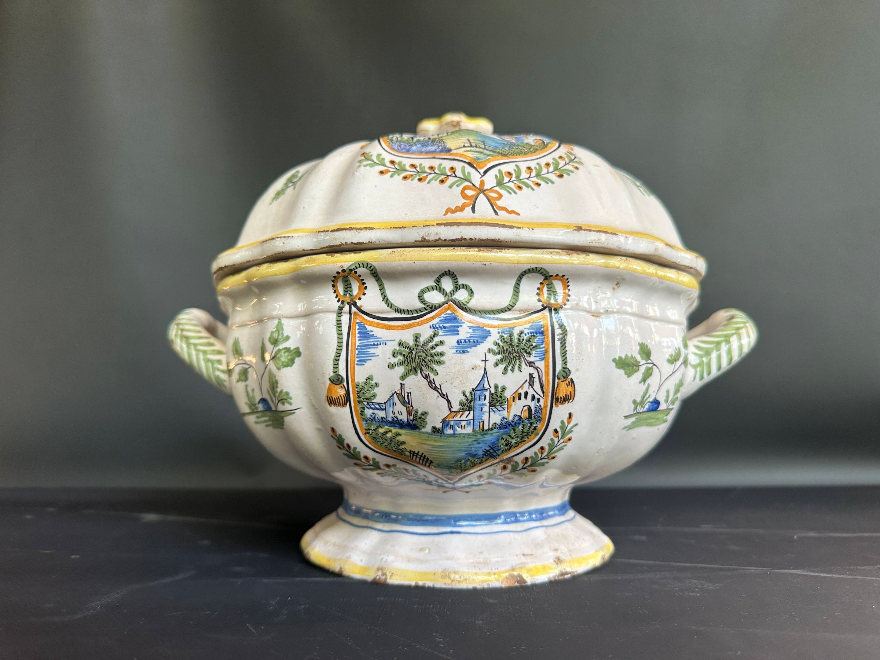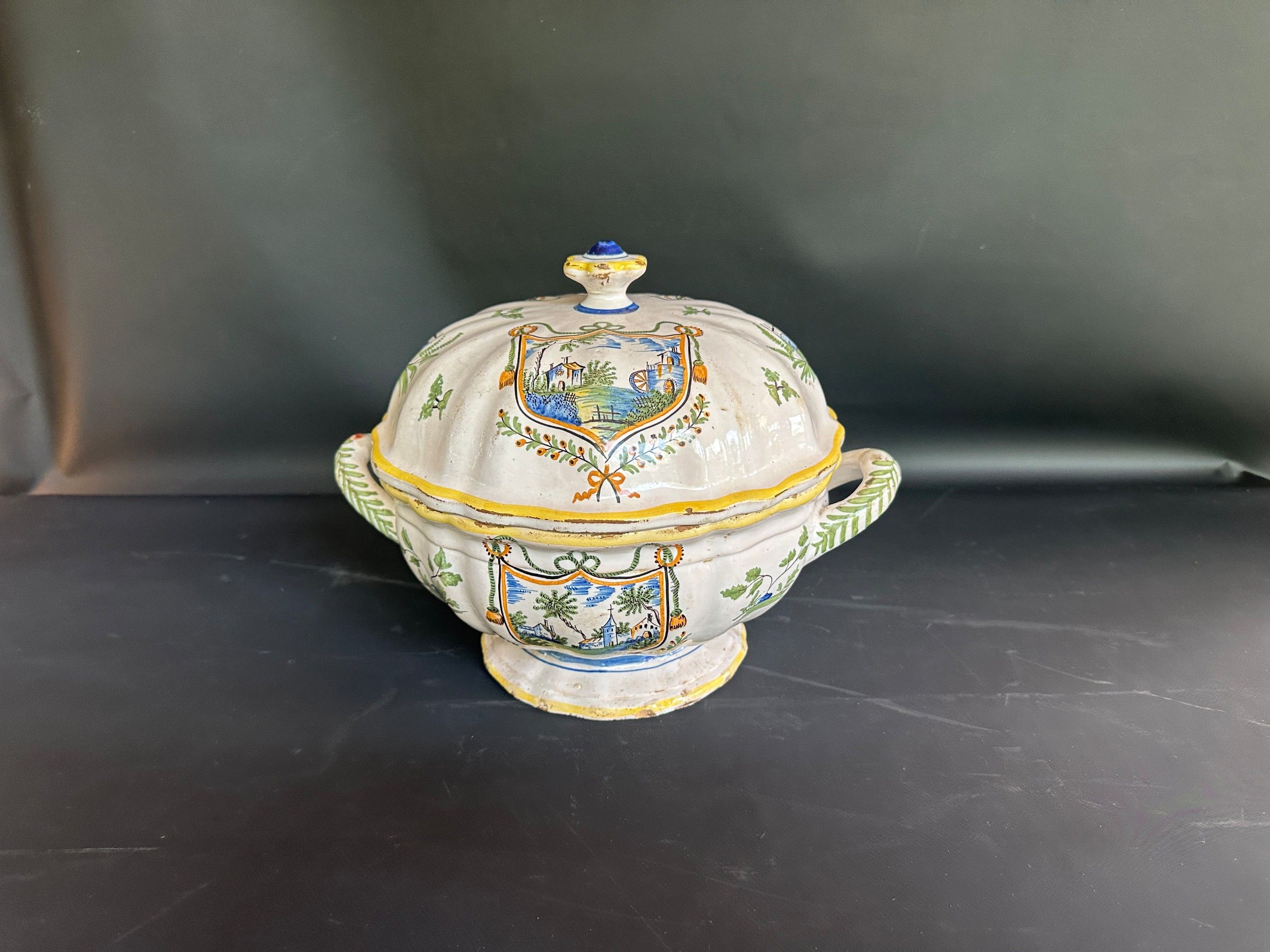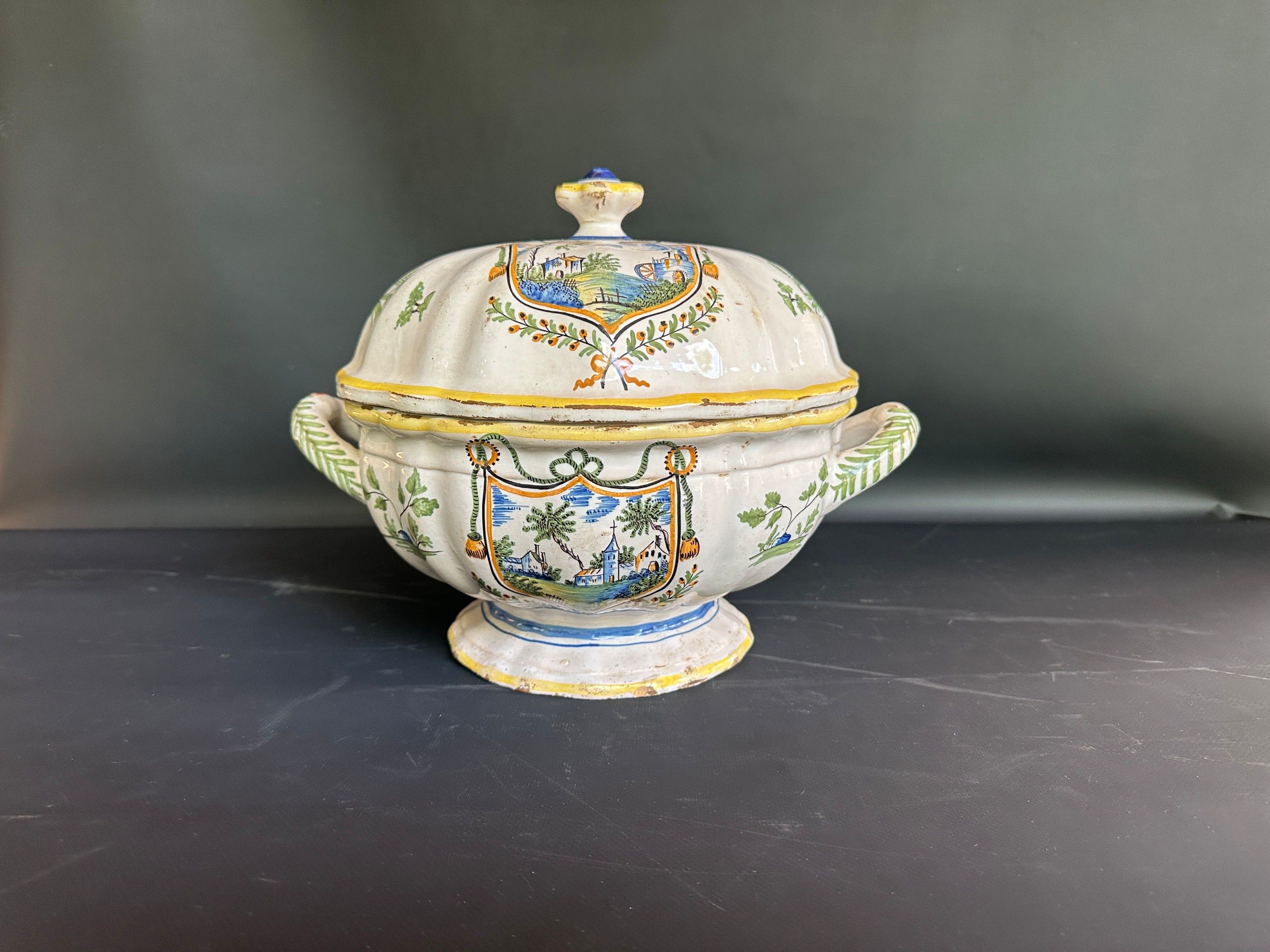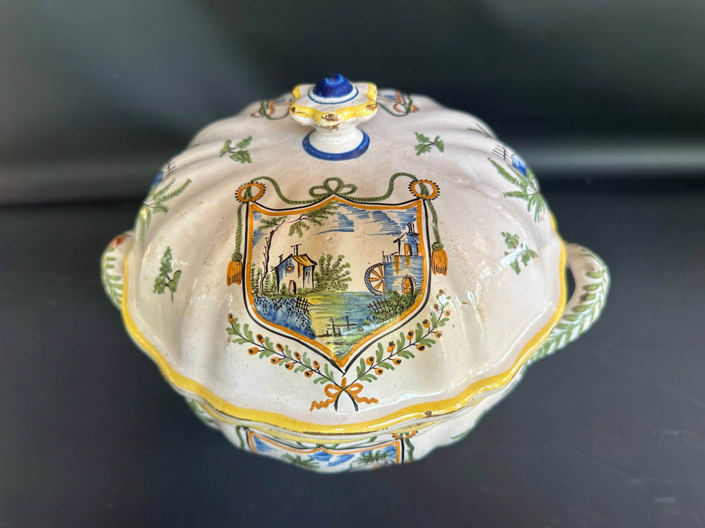 NEVERS Earthenware soup tureen decorated with a castle in escutcheons , 19th century earthenware , diameter without handle 25 cm height 24.5 cm , chips
