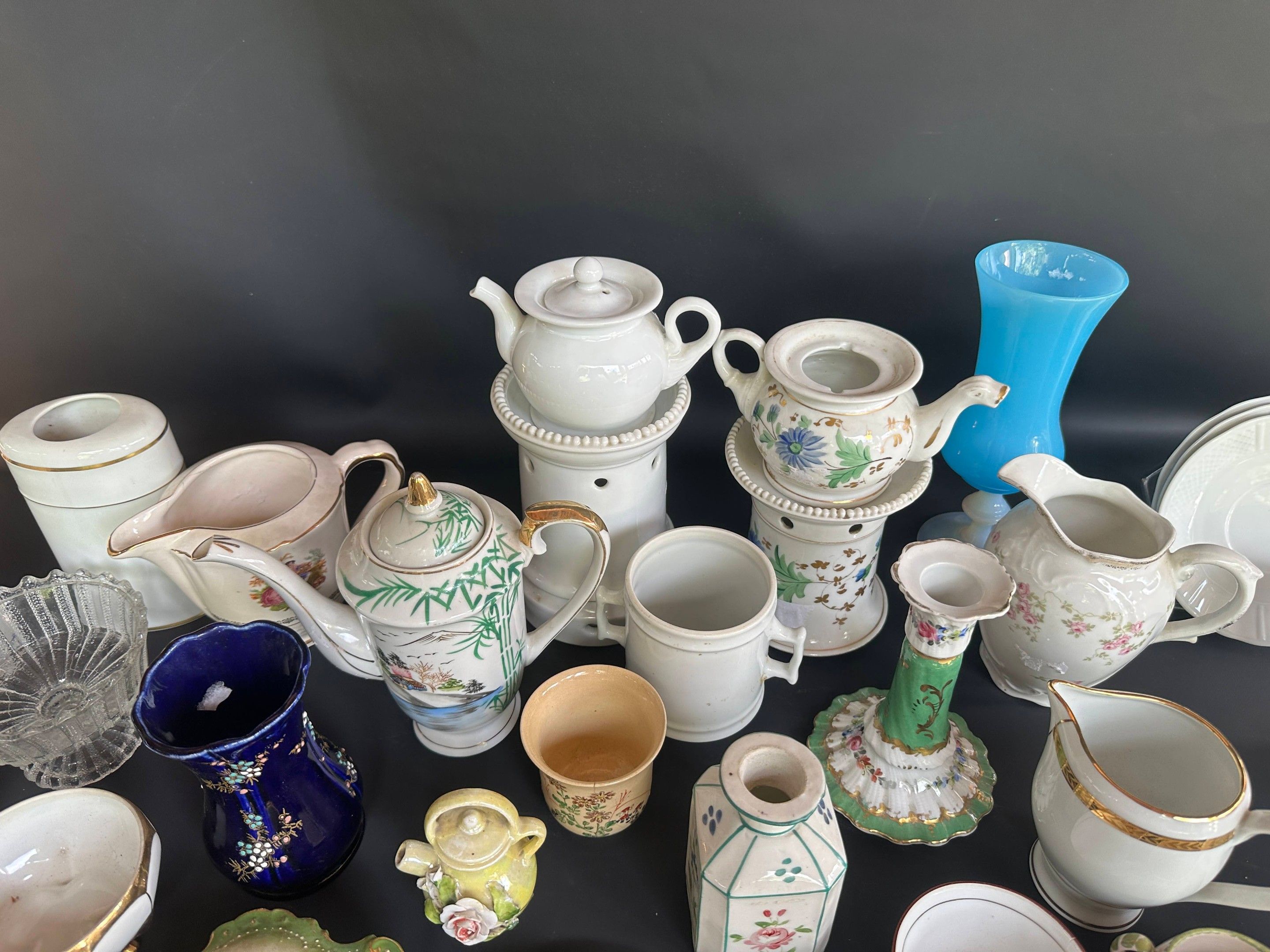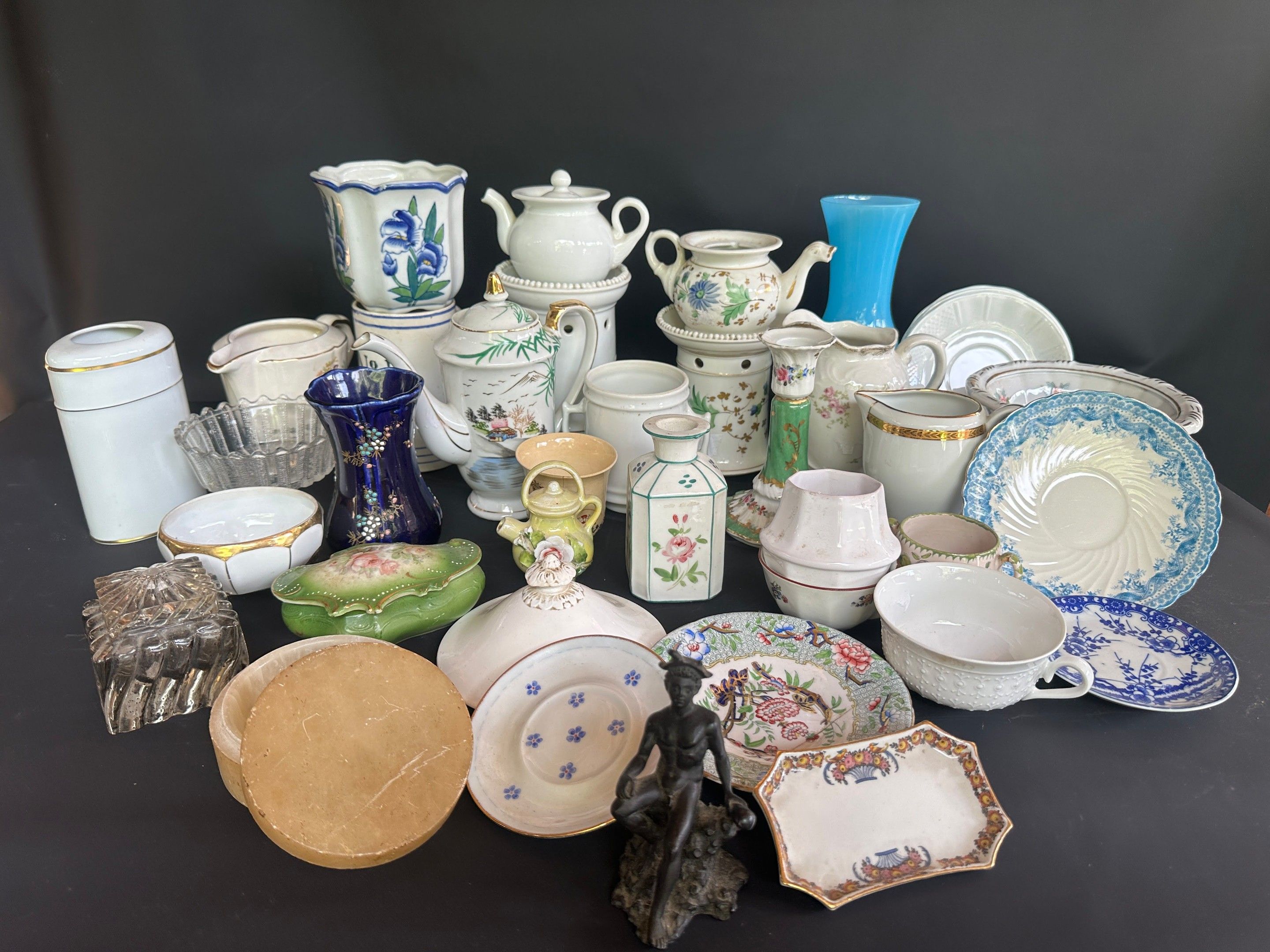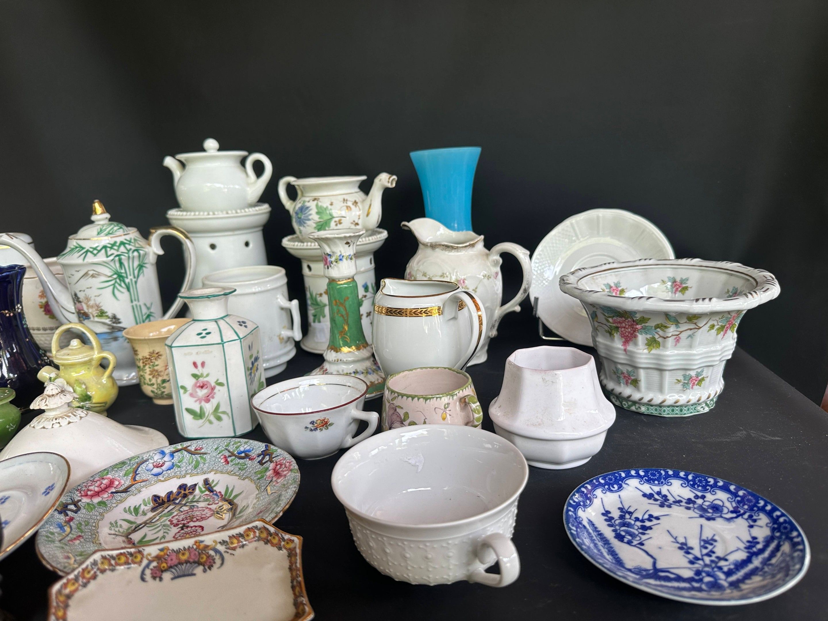 Important lot including , Tisanieres , pot , milk pot , vase , cups , statue , inkwell , pot cover and miscellaneous .