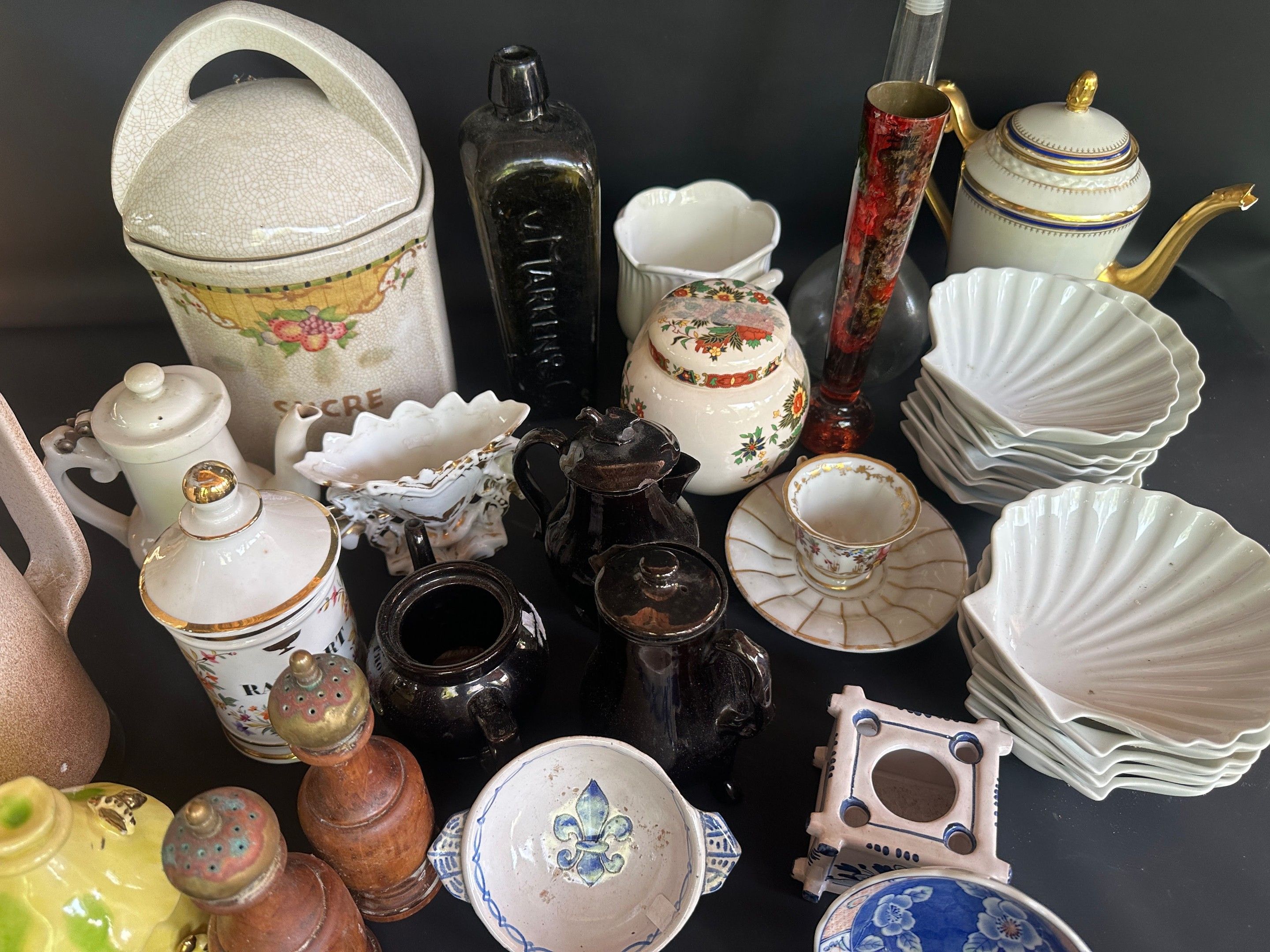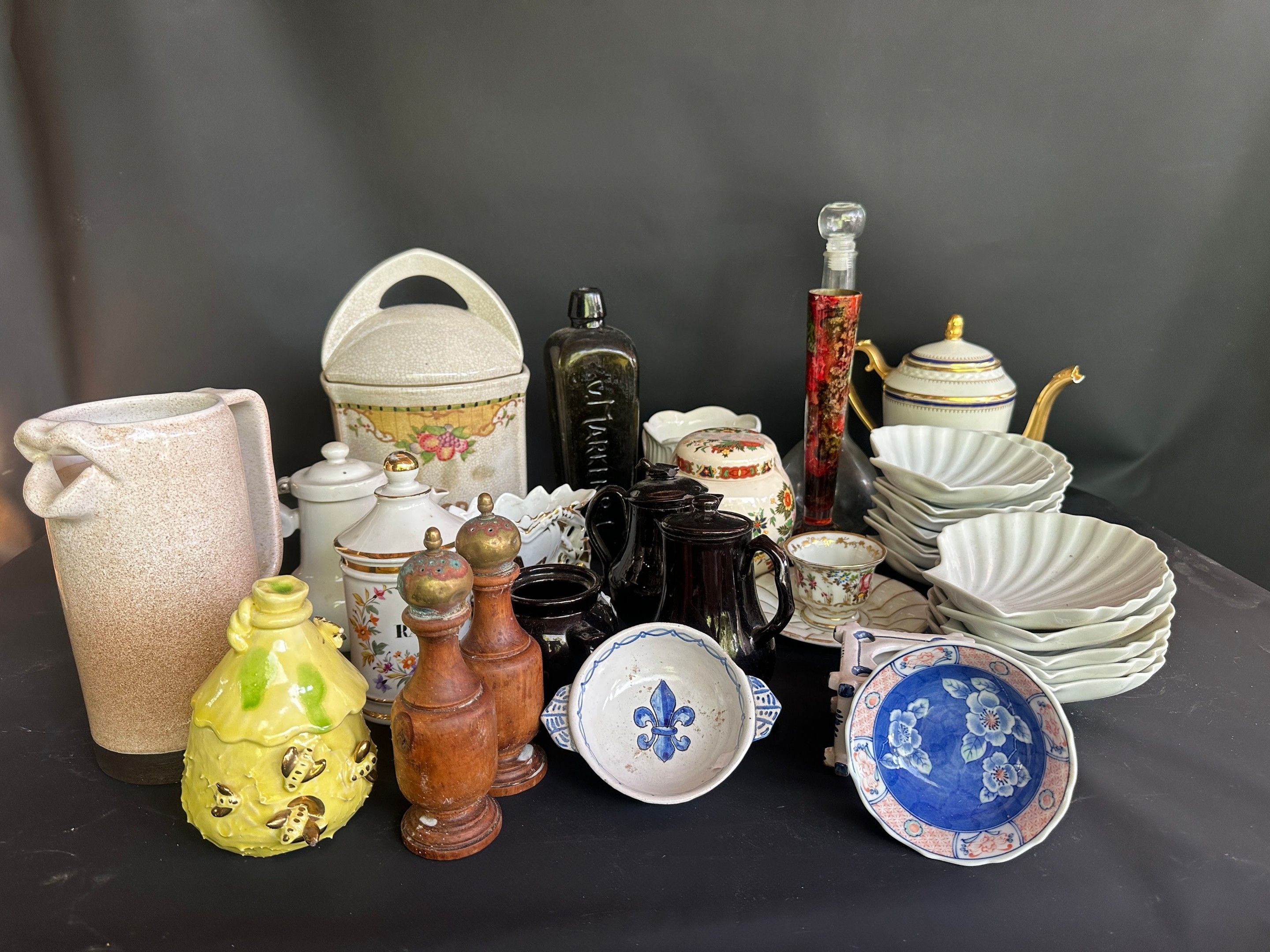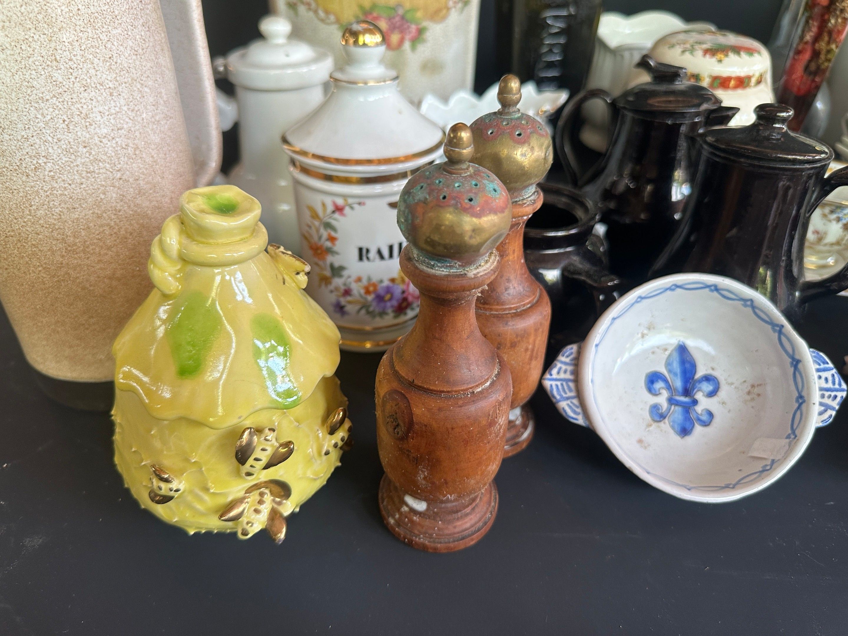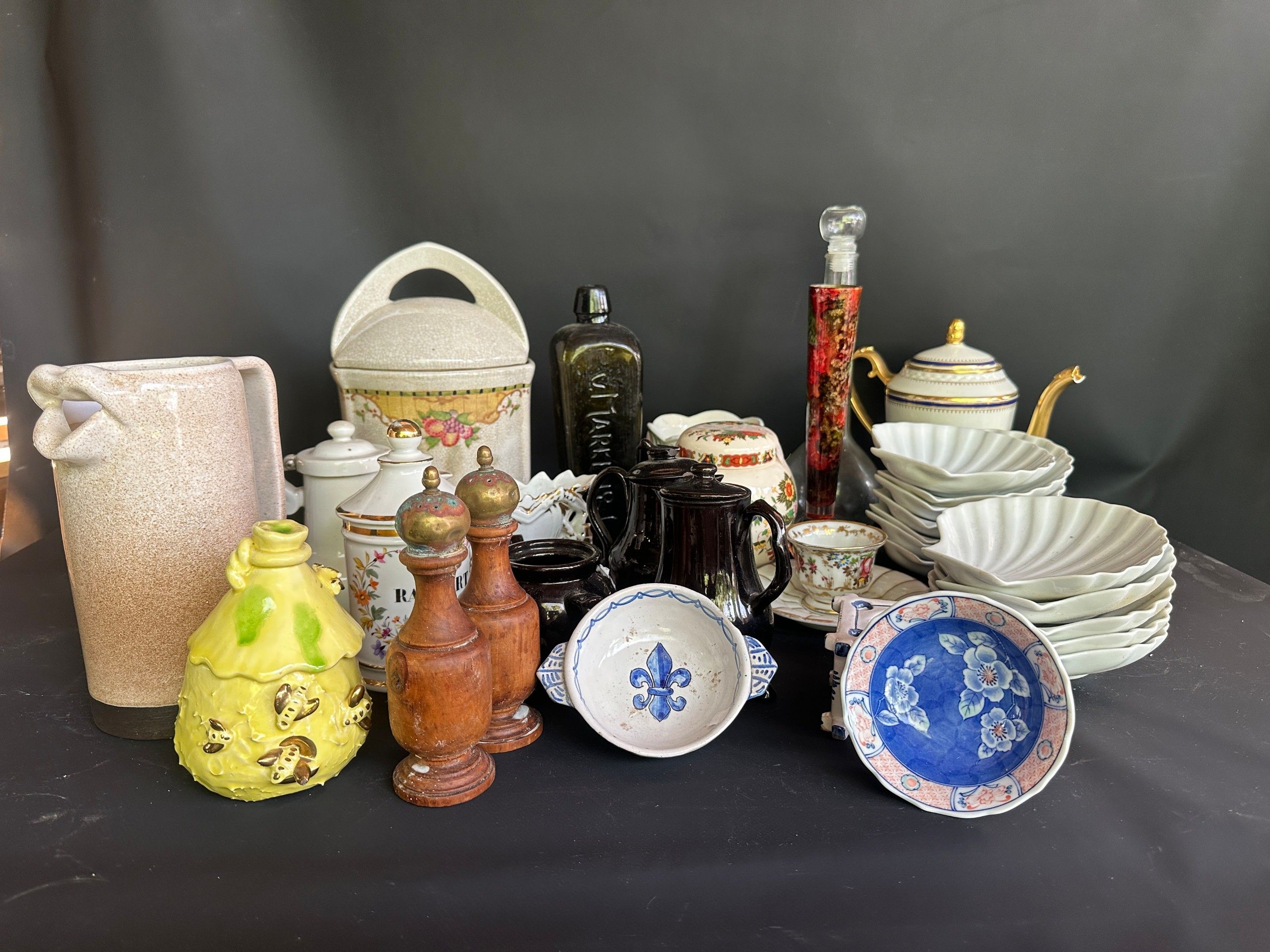 lot including sugar pot, scallop bowls, inkwell, soliflore, porcelain pourers, horseradish medicine pot, honey pot in barbotine, wedding vase, cup, jug, salt and pepper shaker in wood