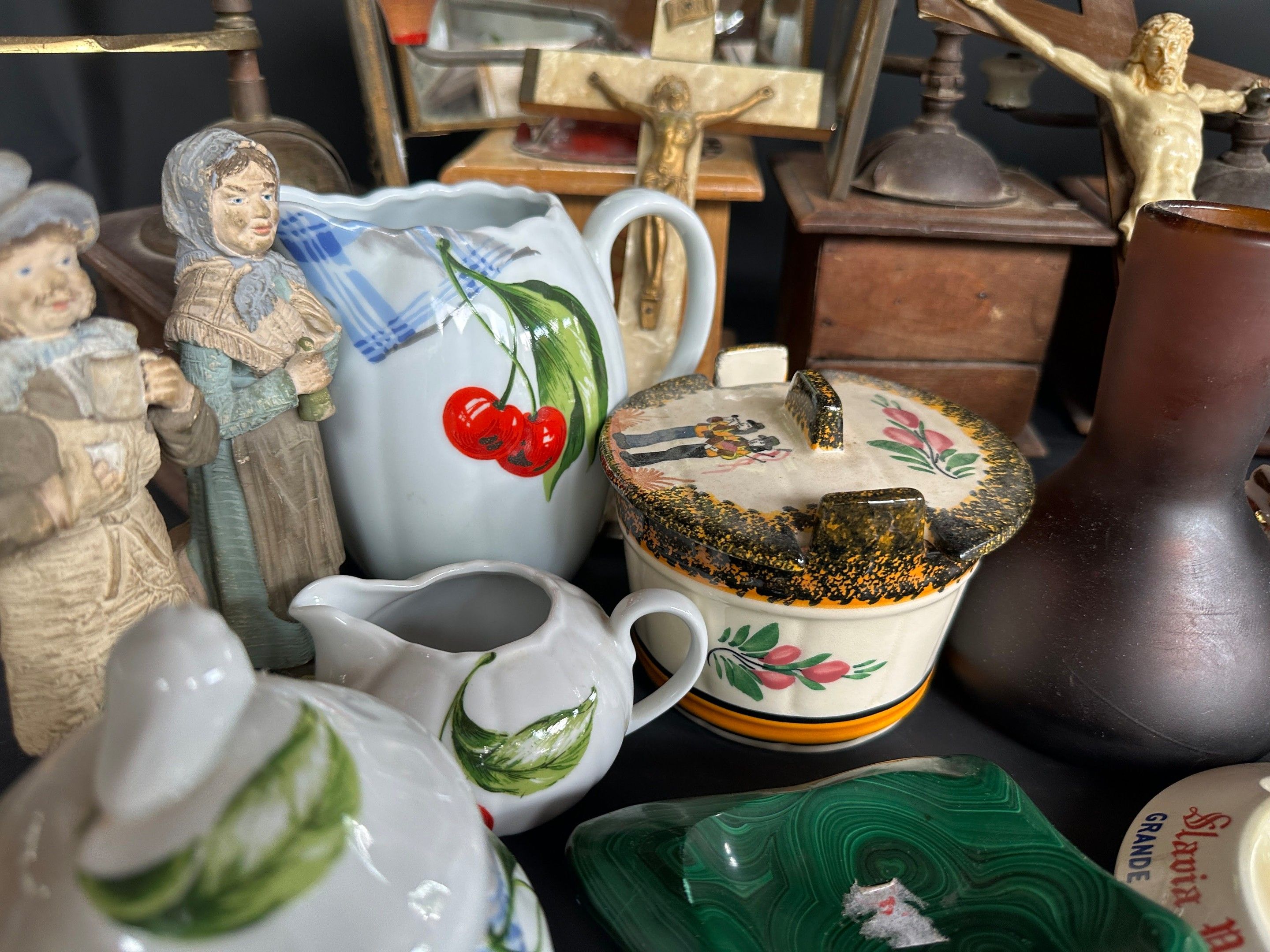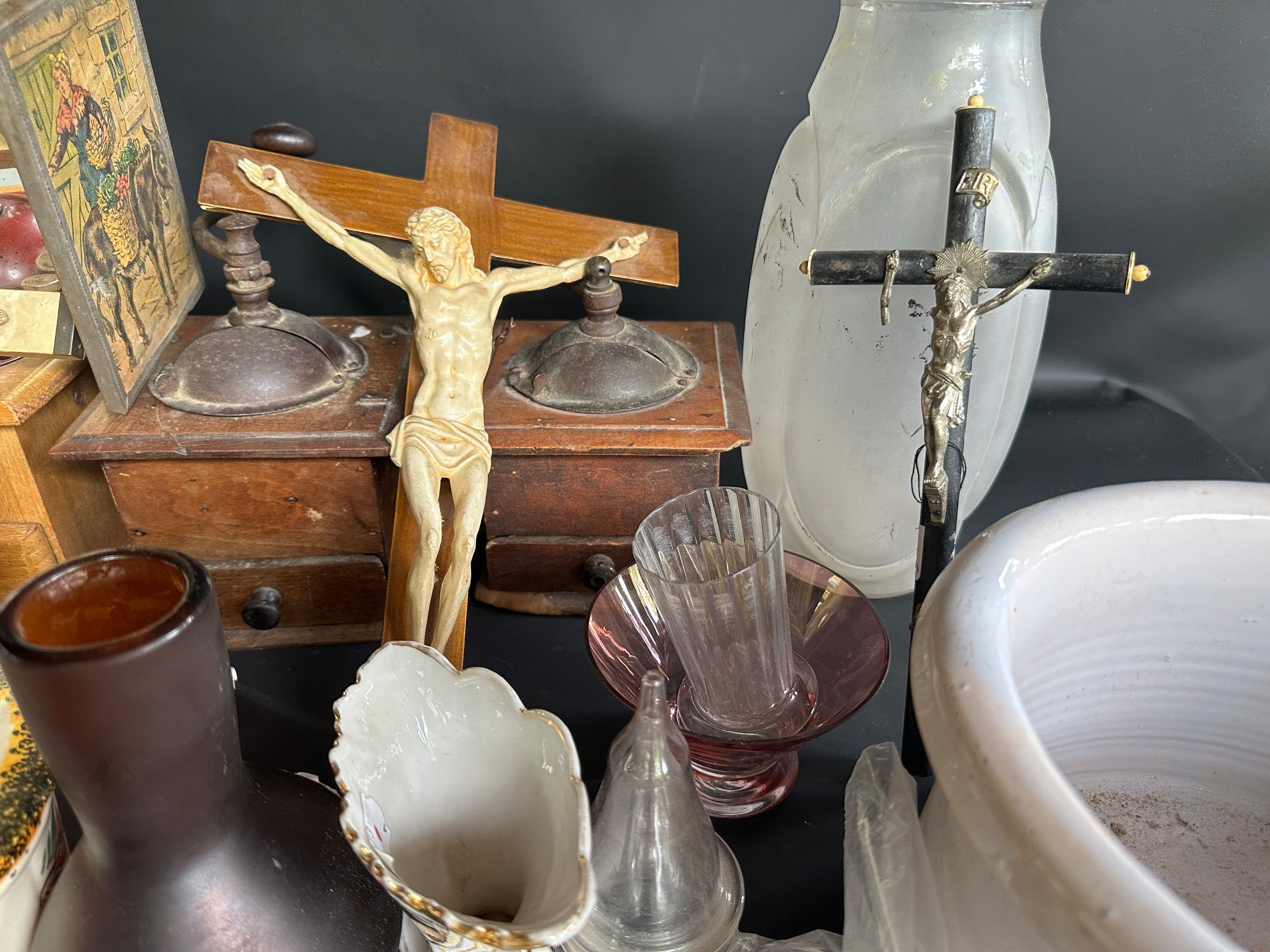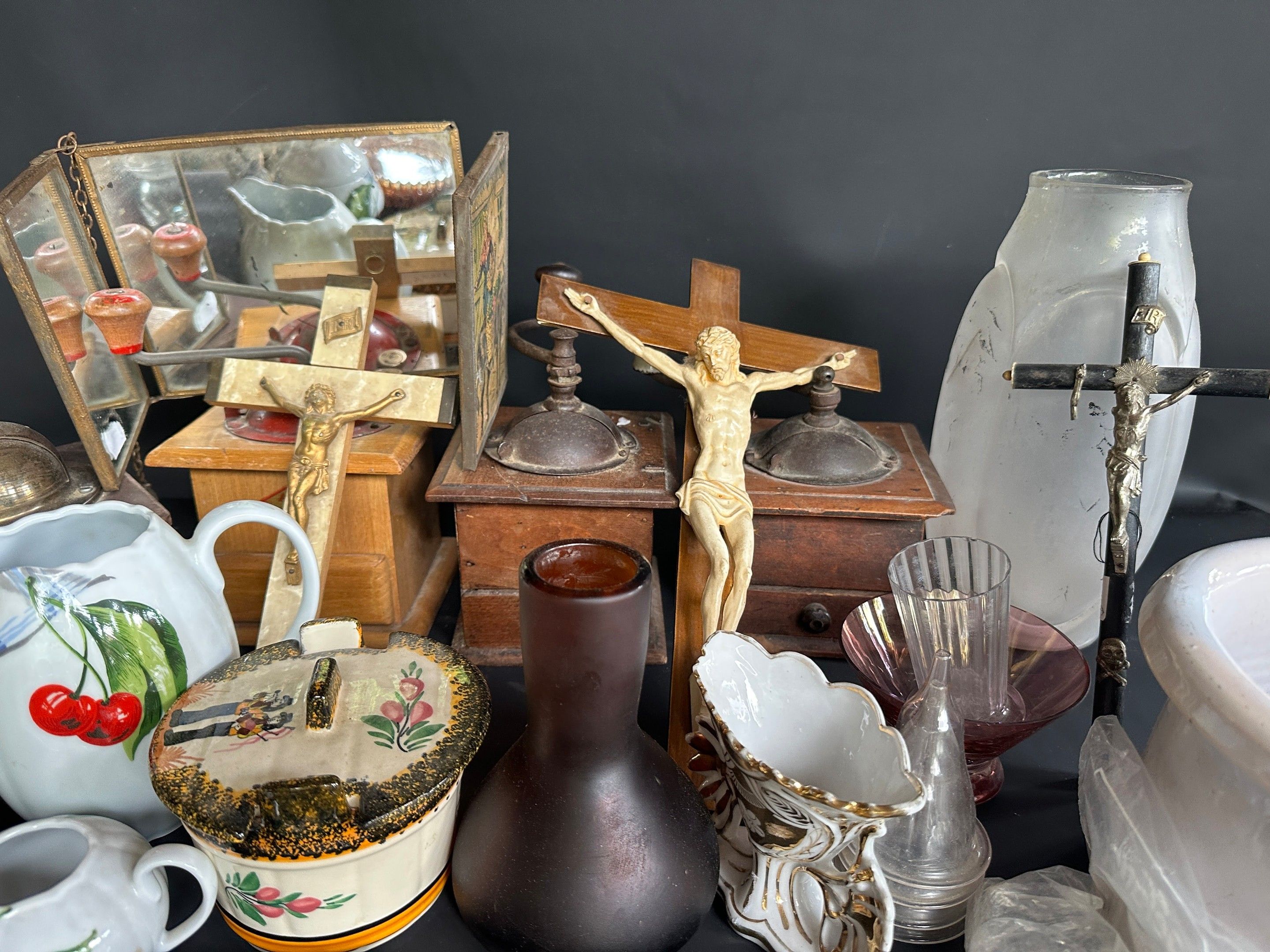 lot comprising 4 coffee grinders, wedding vase, mirror, three crucifixes, chandelier pendants, jacques cœur porcelain, chamber pot, malachite ashtray and miscellaneous.