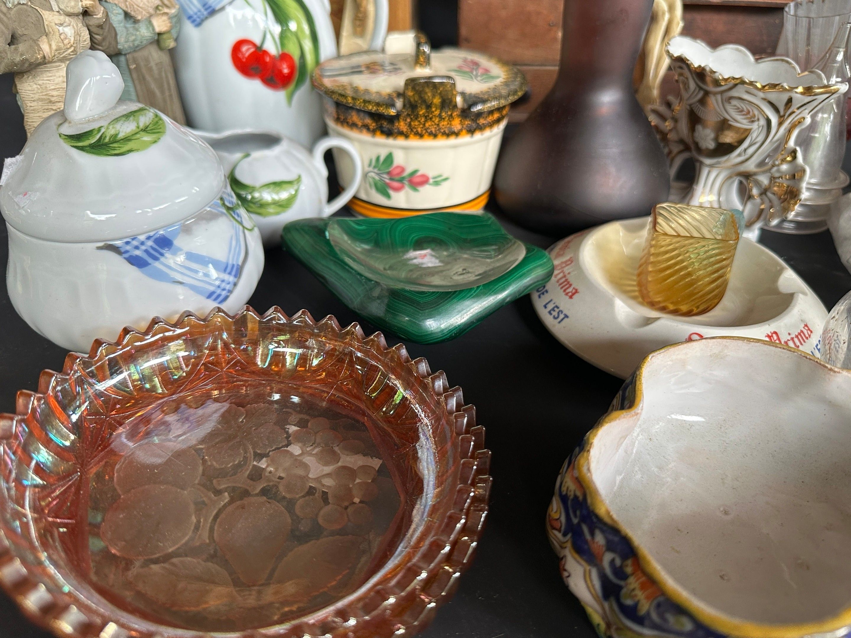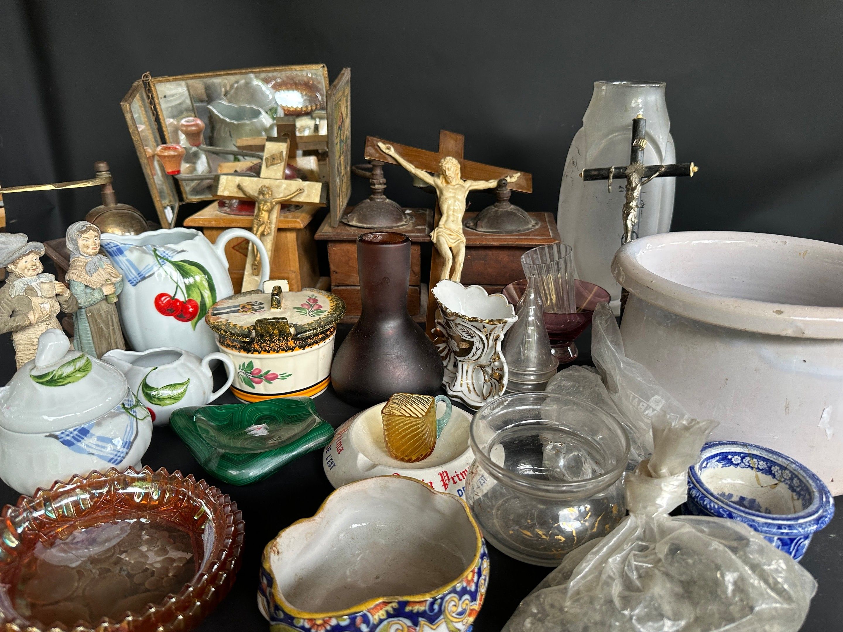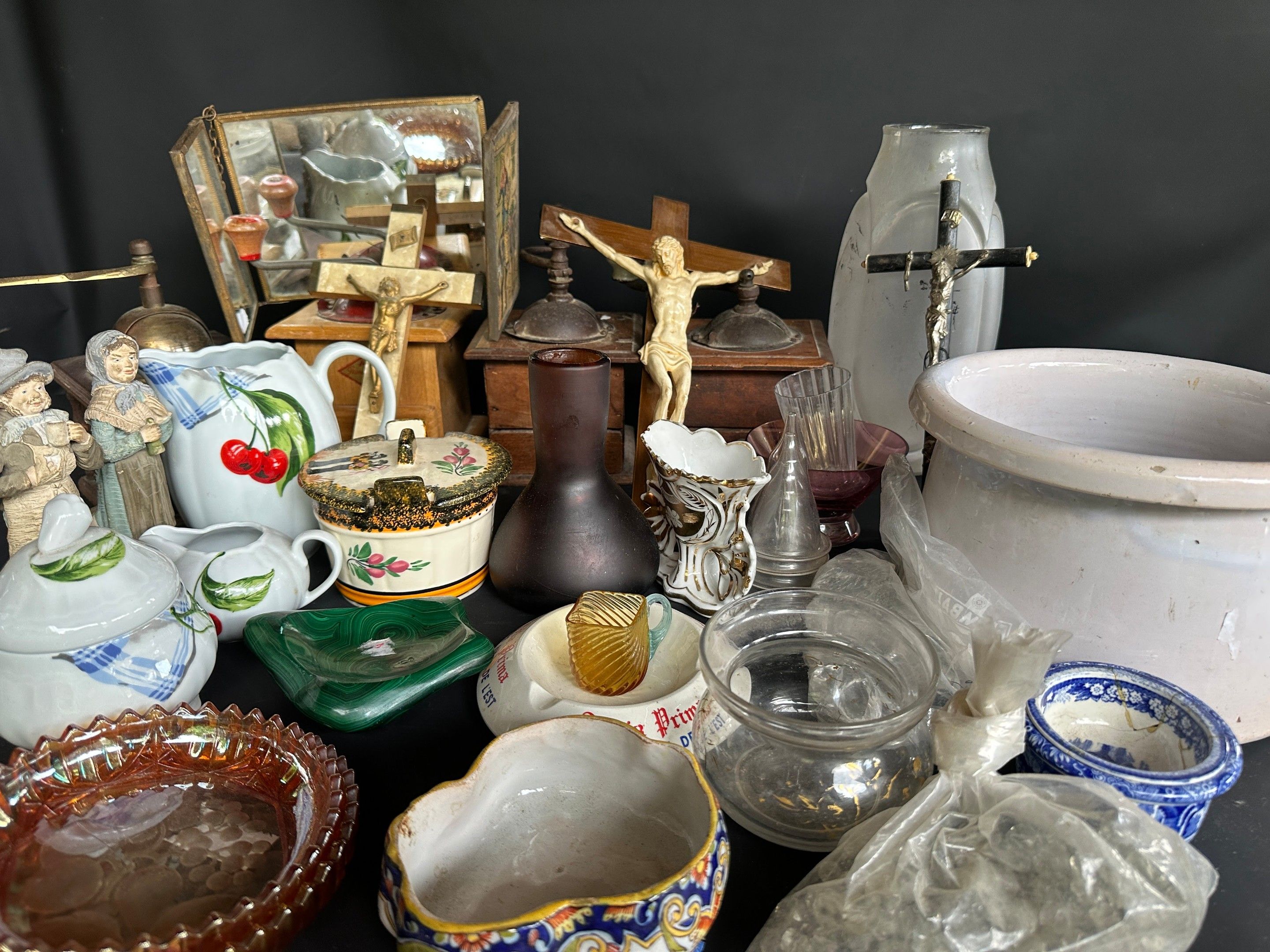 lot comprising 4 coffee grinders, wedding vase, mirror, three crucifixes, chandelier pendants, jacques cœur porcelain, chamber pot, malachite ashtray and miscellaneous.