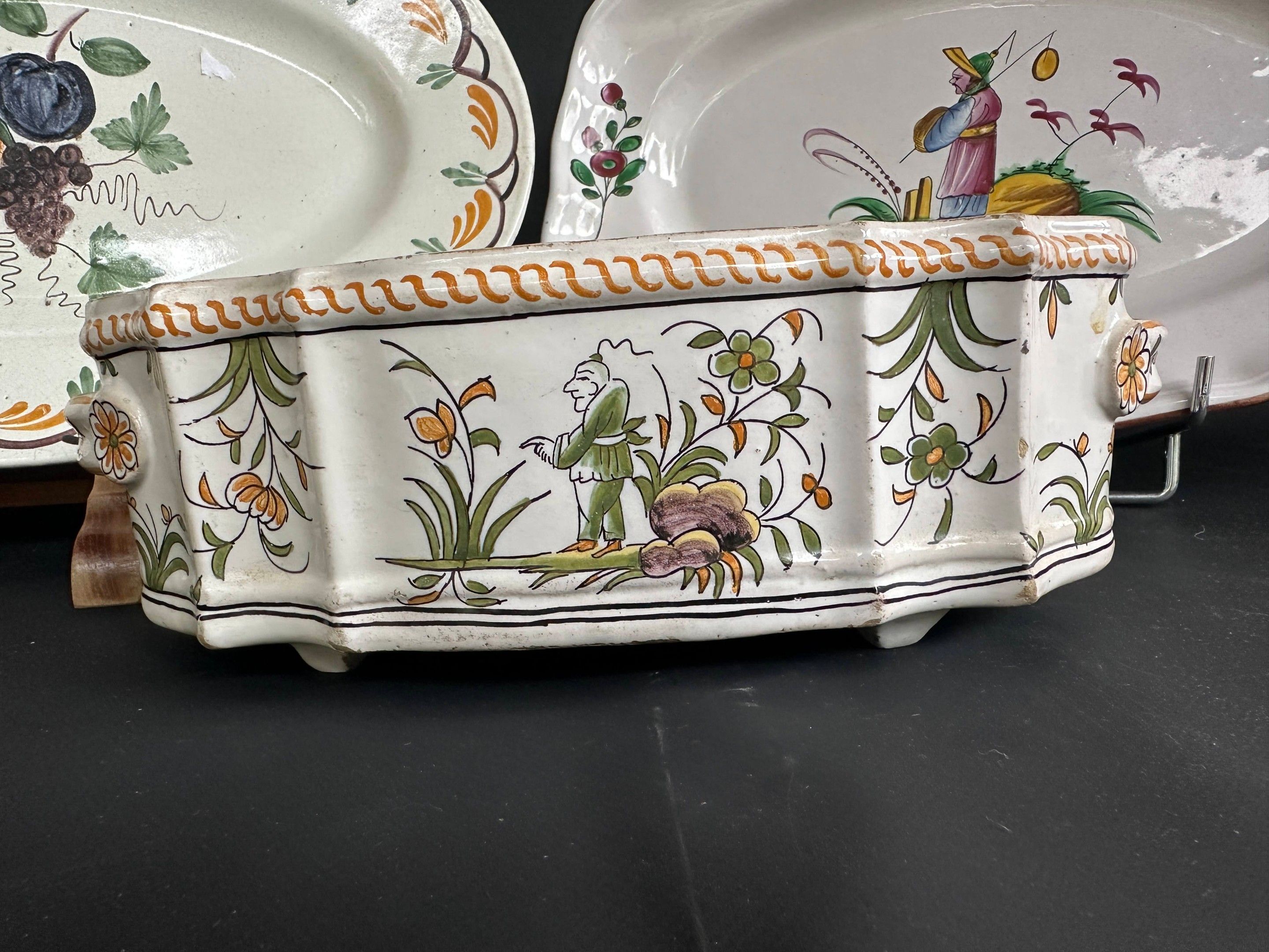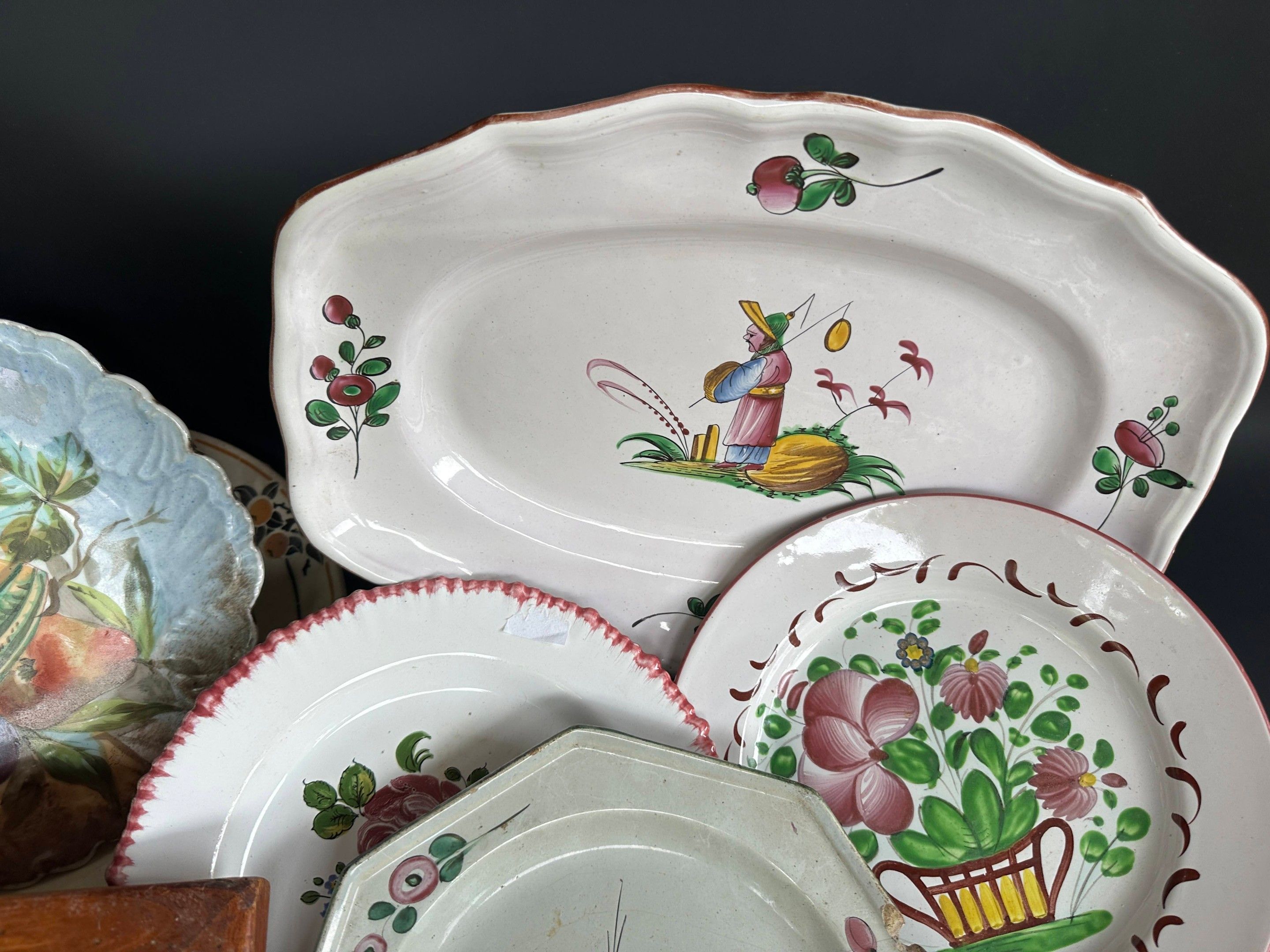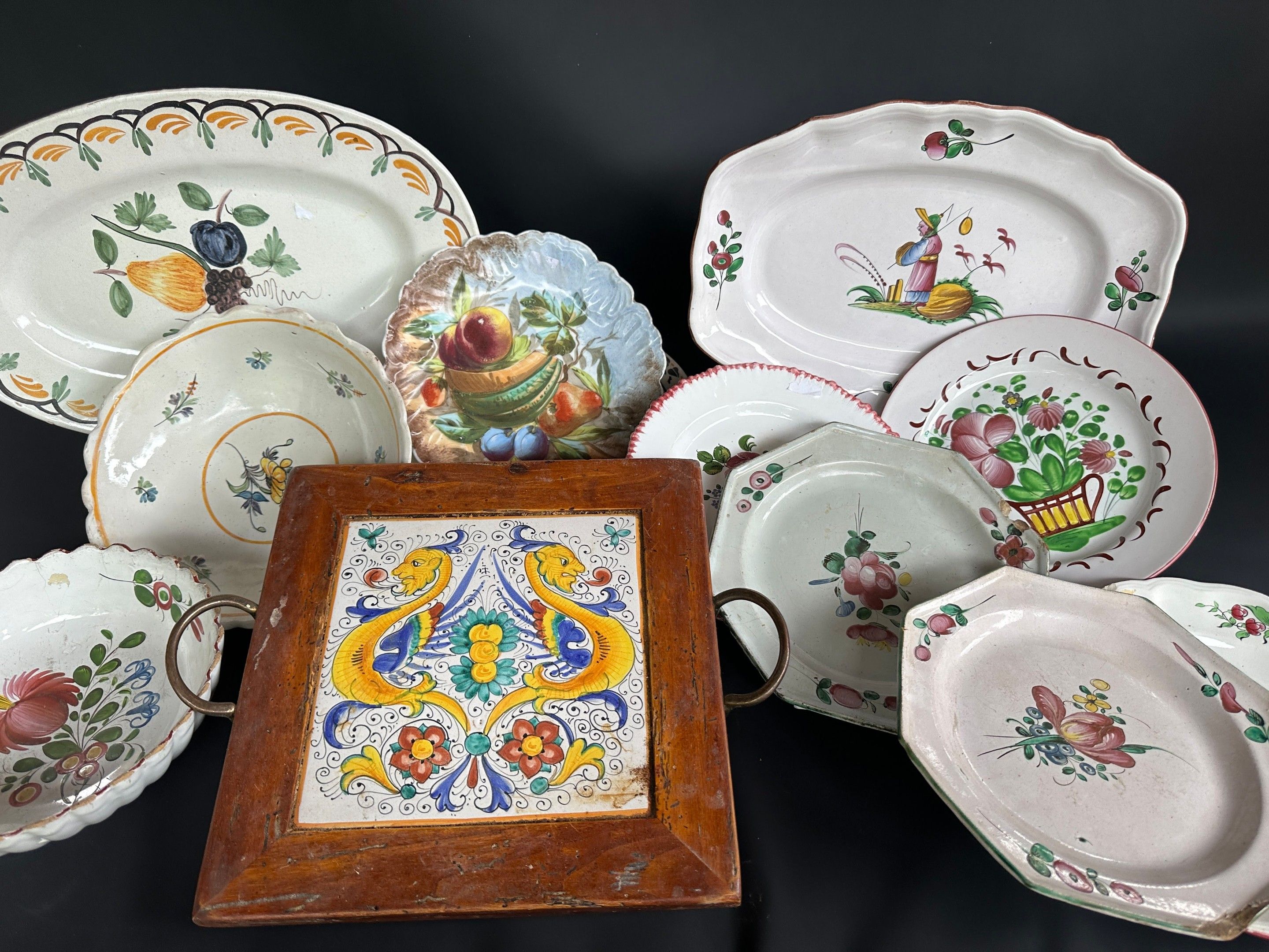 A lot of earthenware, dishes in eastern earthenware with Chinese and central decor, gadrooned cup, plates in eastern earthenware, Italian trivet, a jardinière and various barbotine.