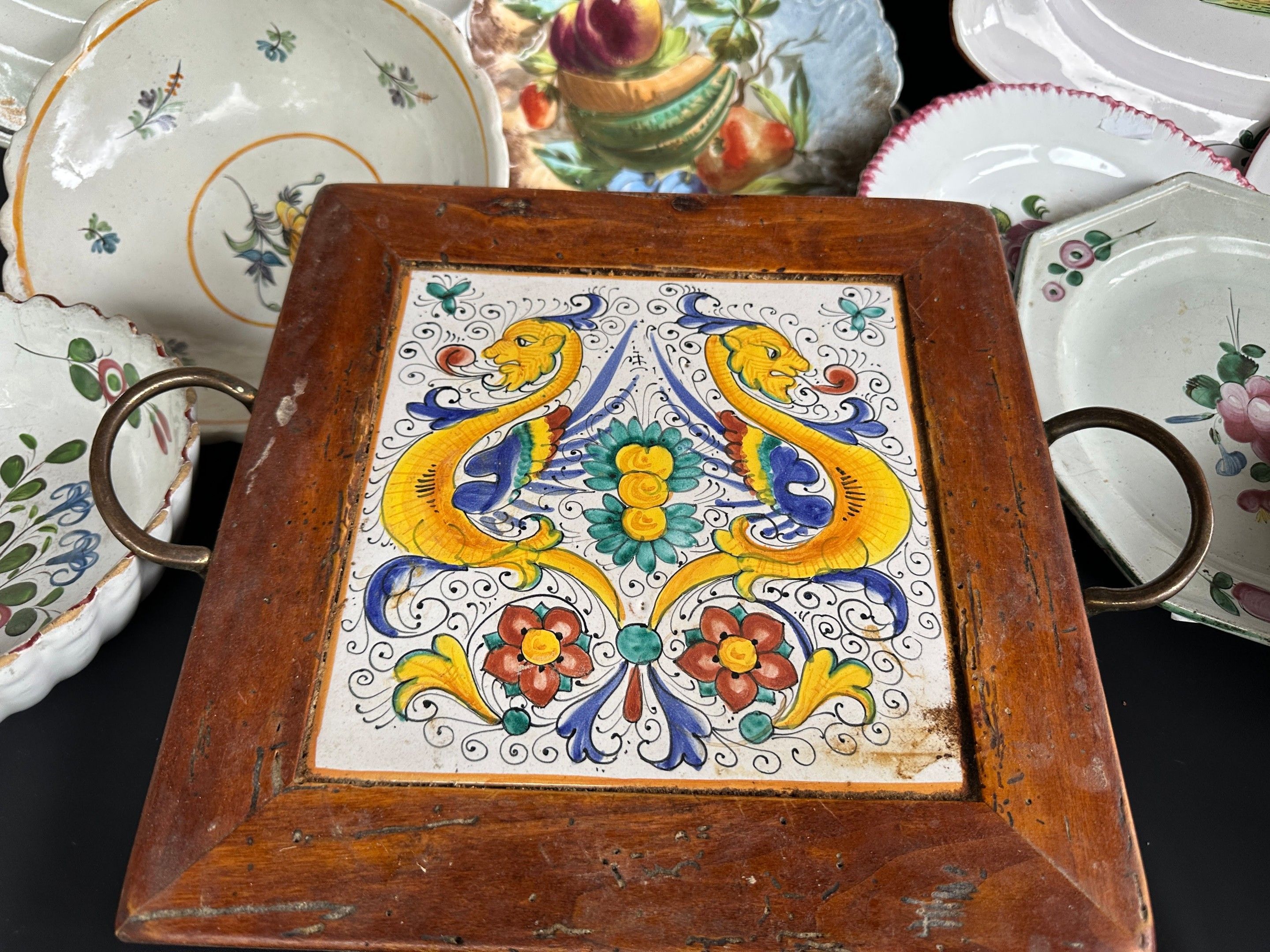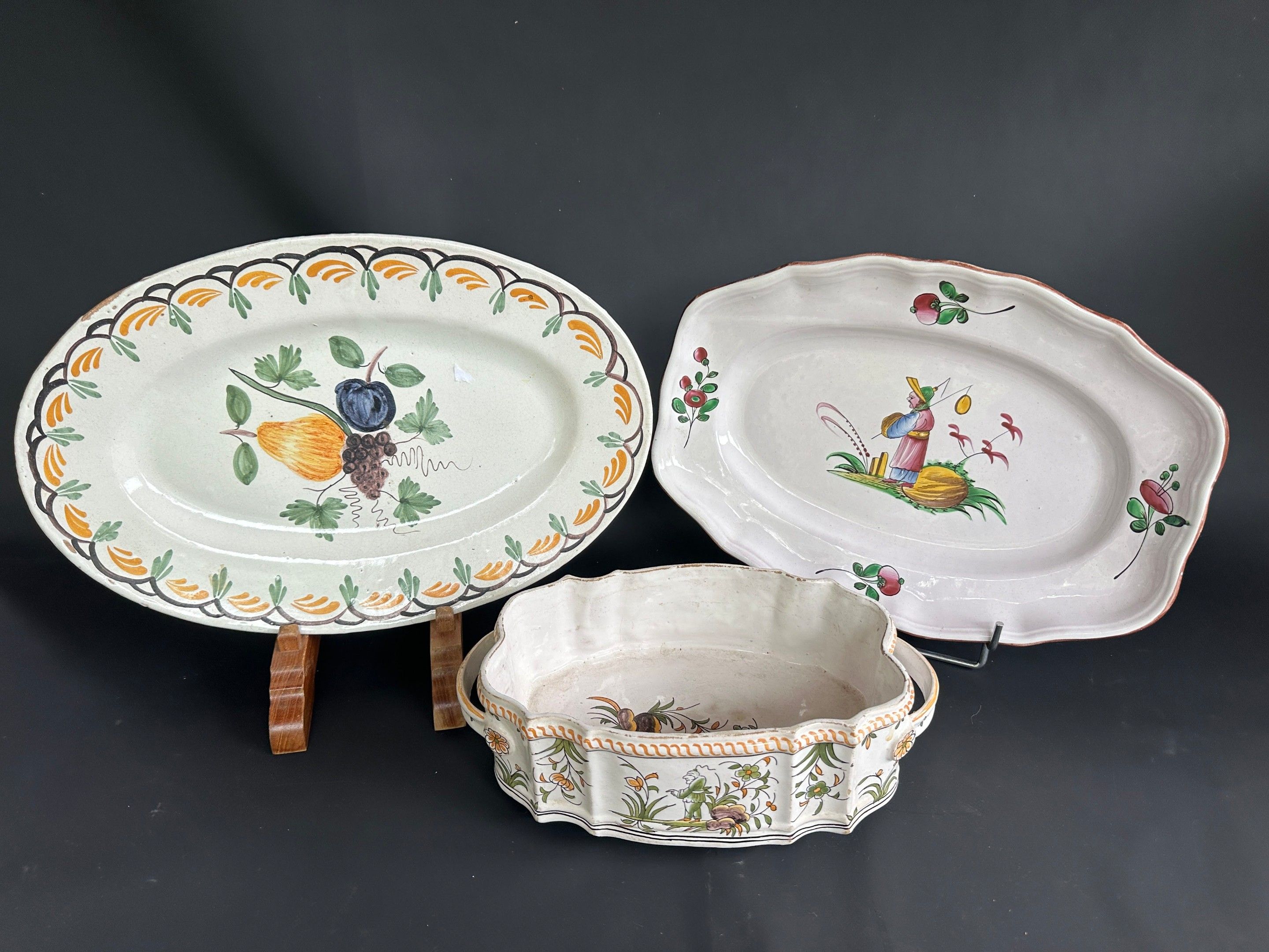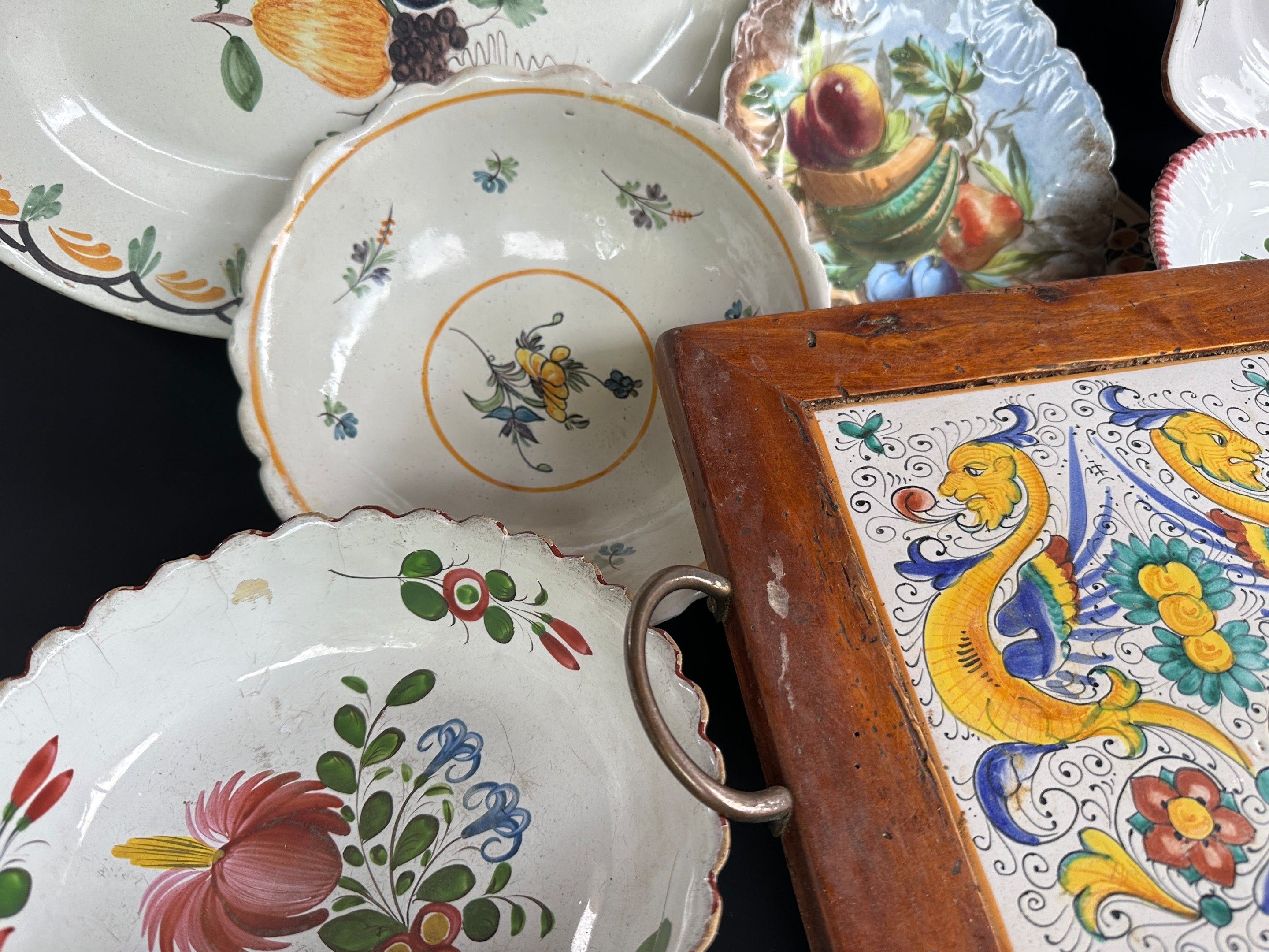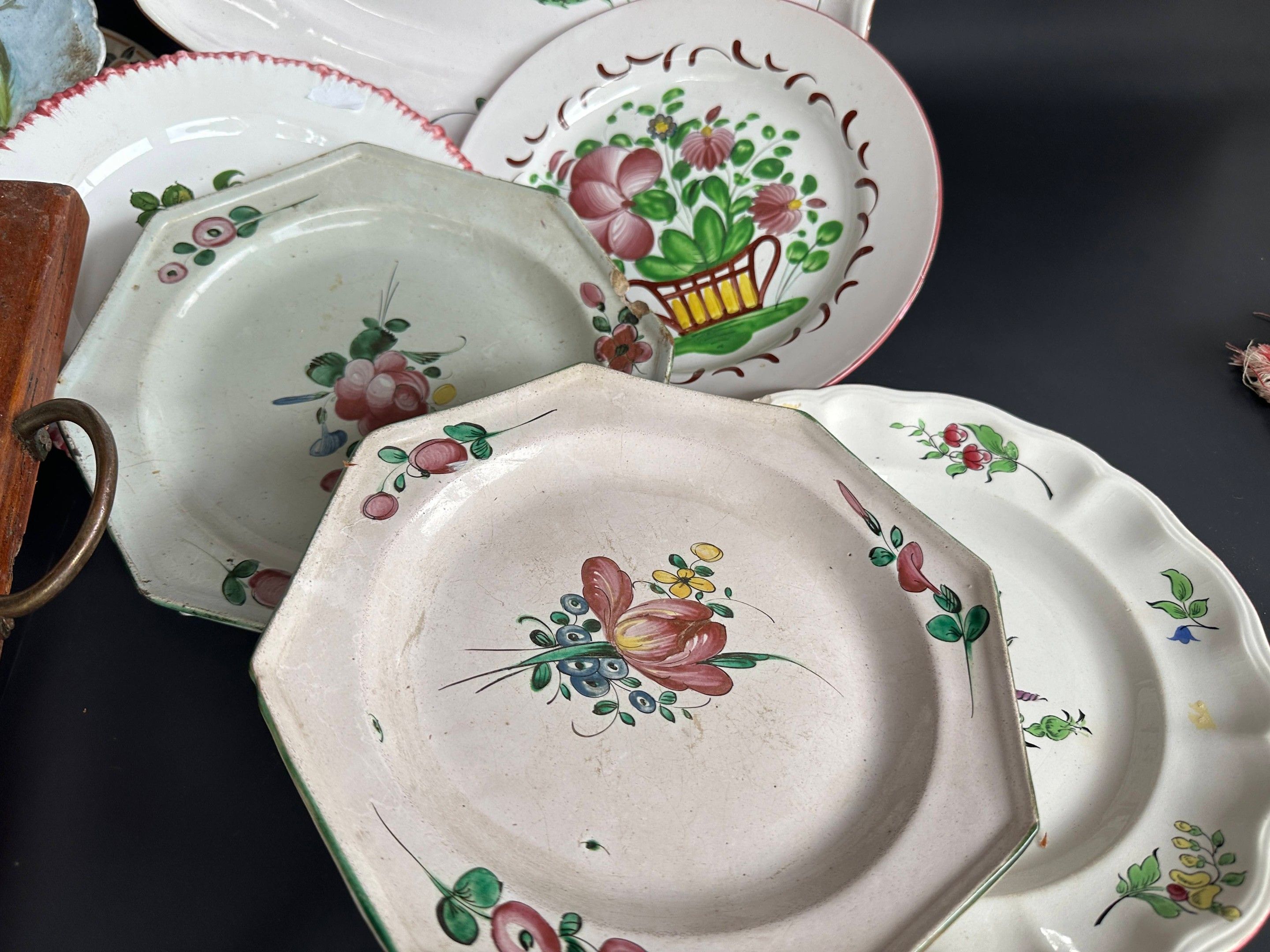A lot of earthenware, dishes in eastern earthenware with Chinese and central decor, gadrooned cup, plates in eastern earthenware, Italian trivet, a jardinière and various barbotine.