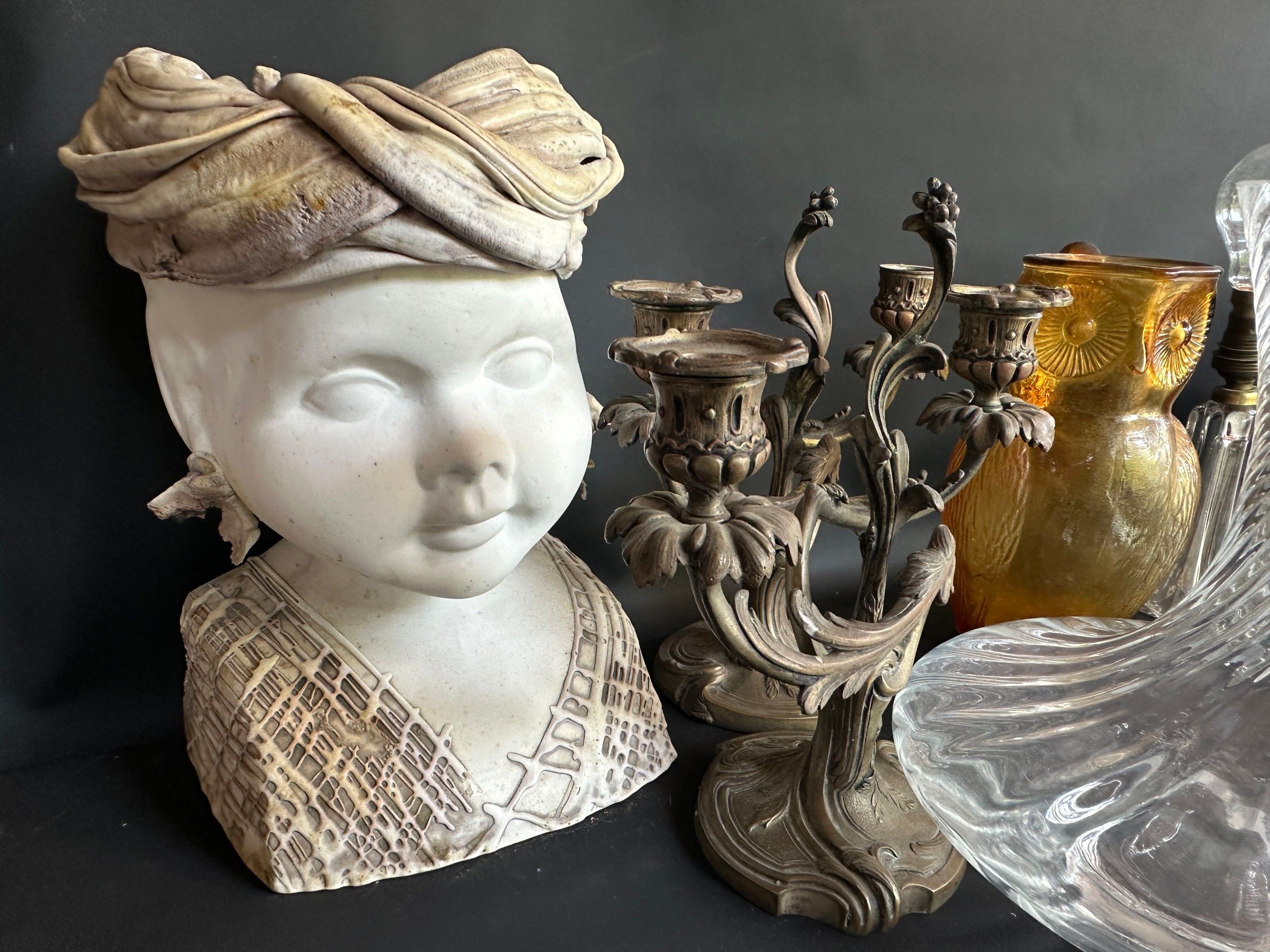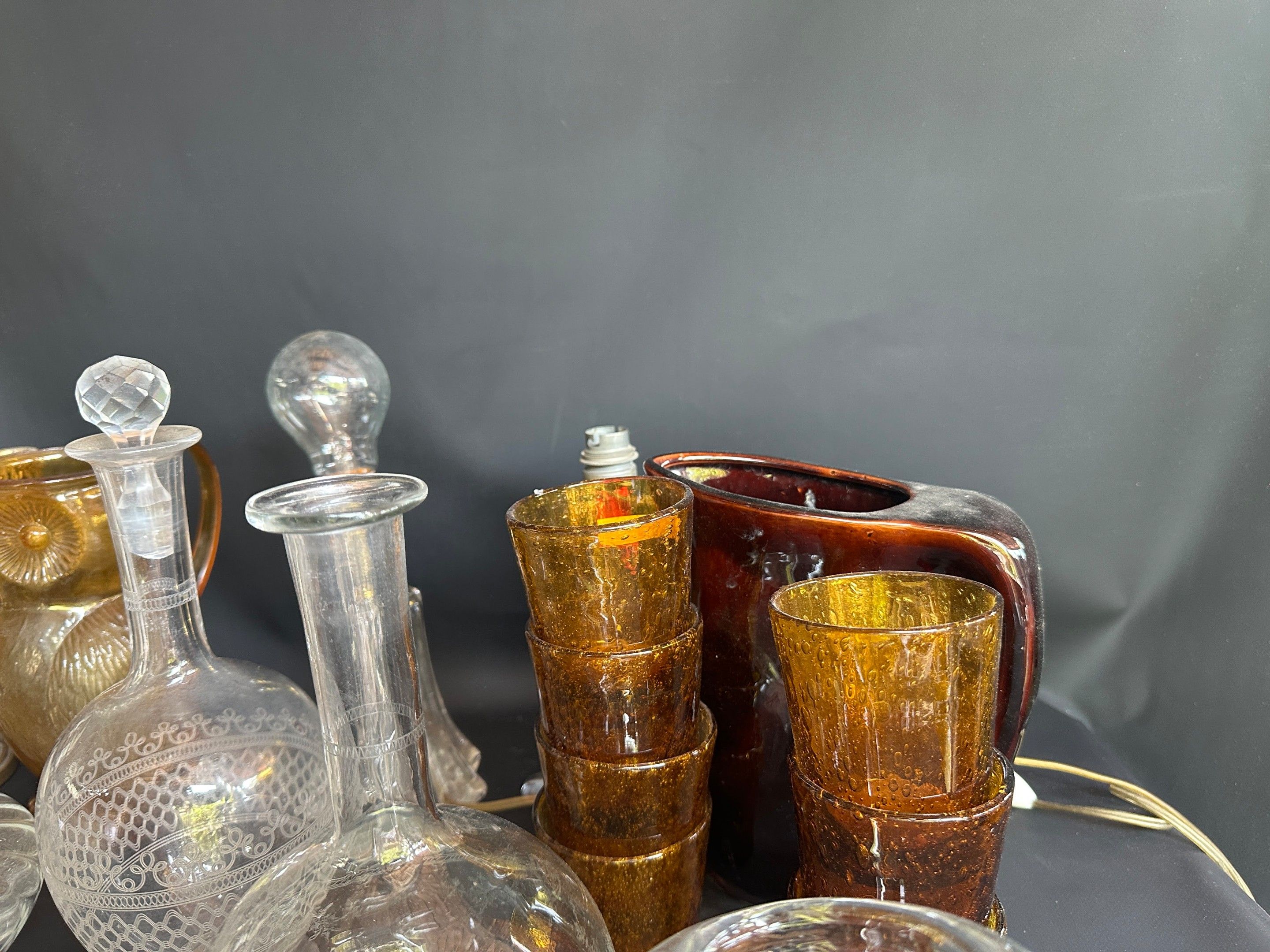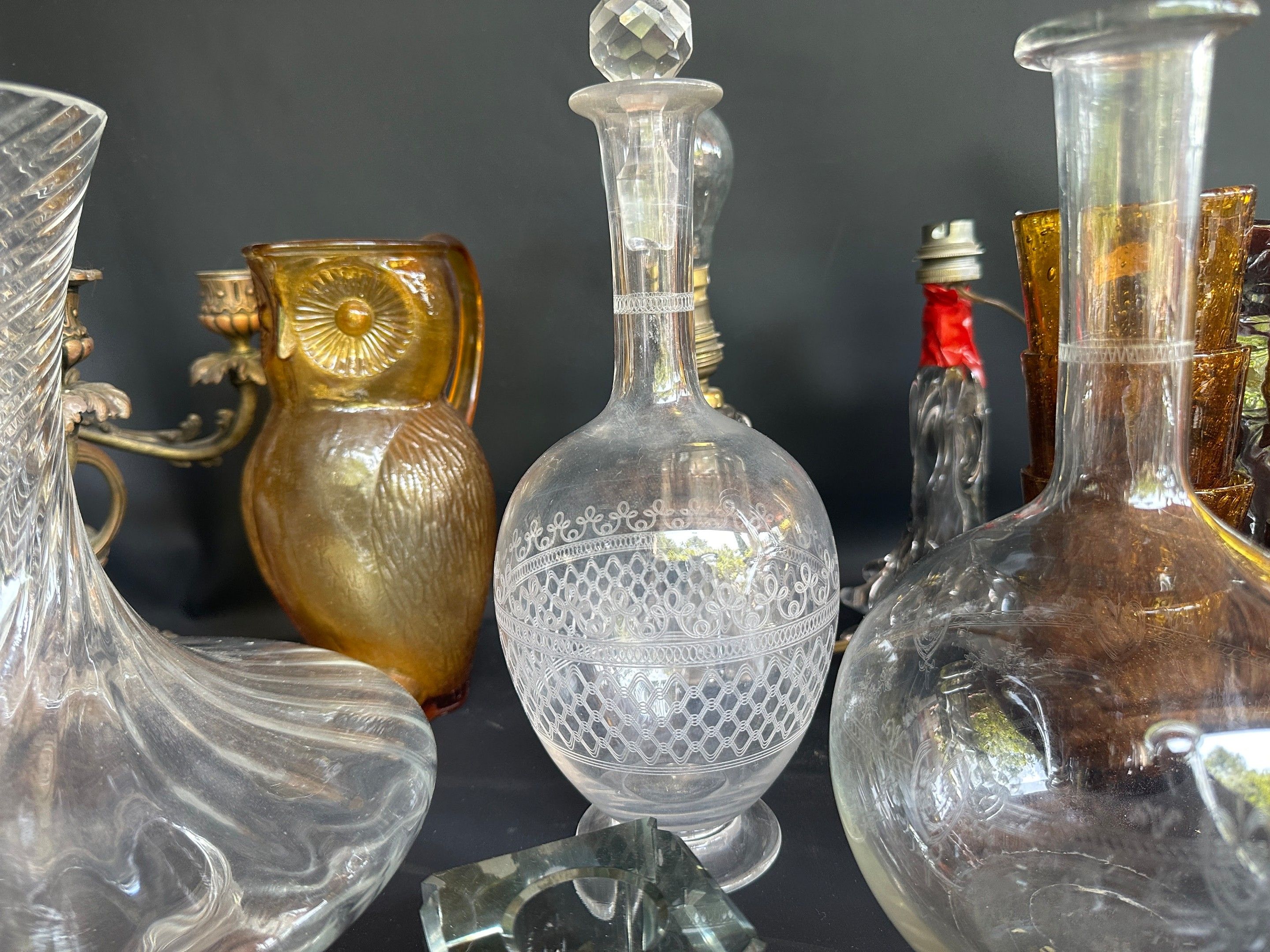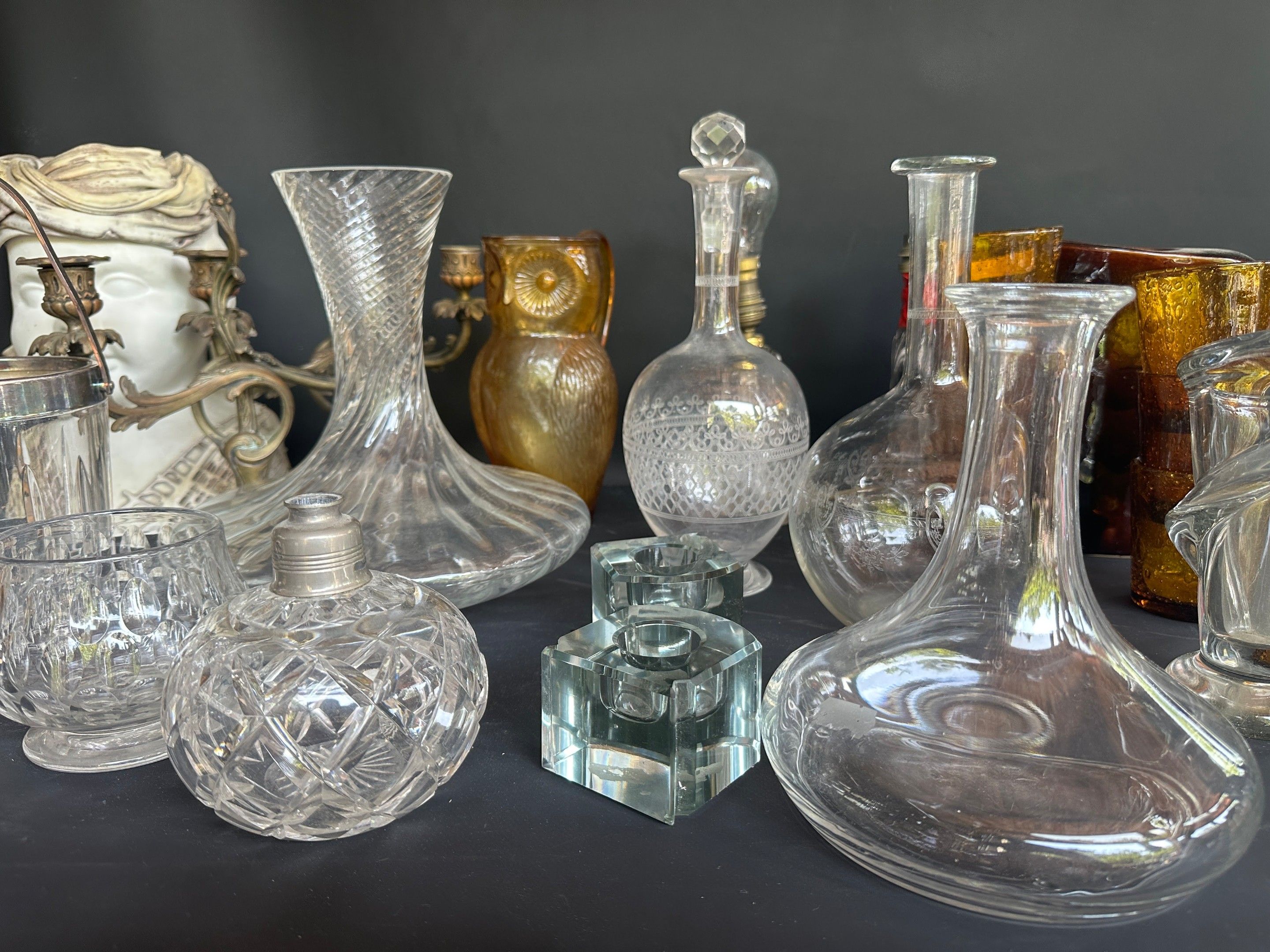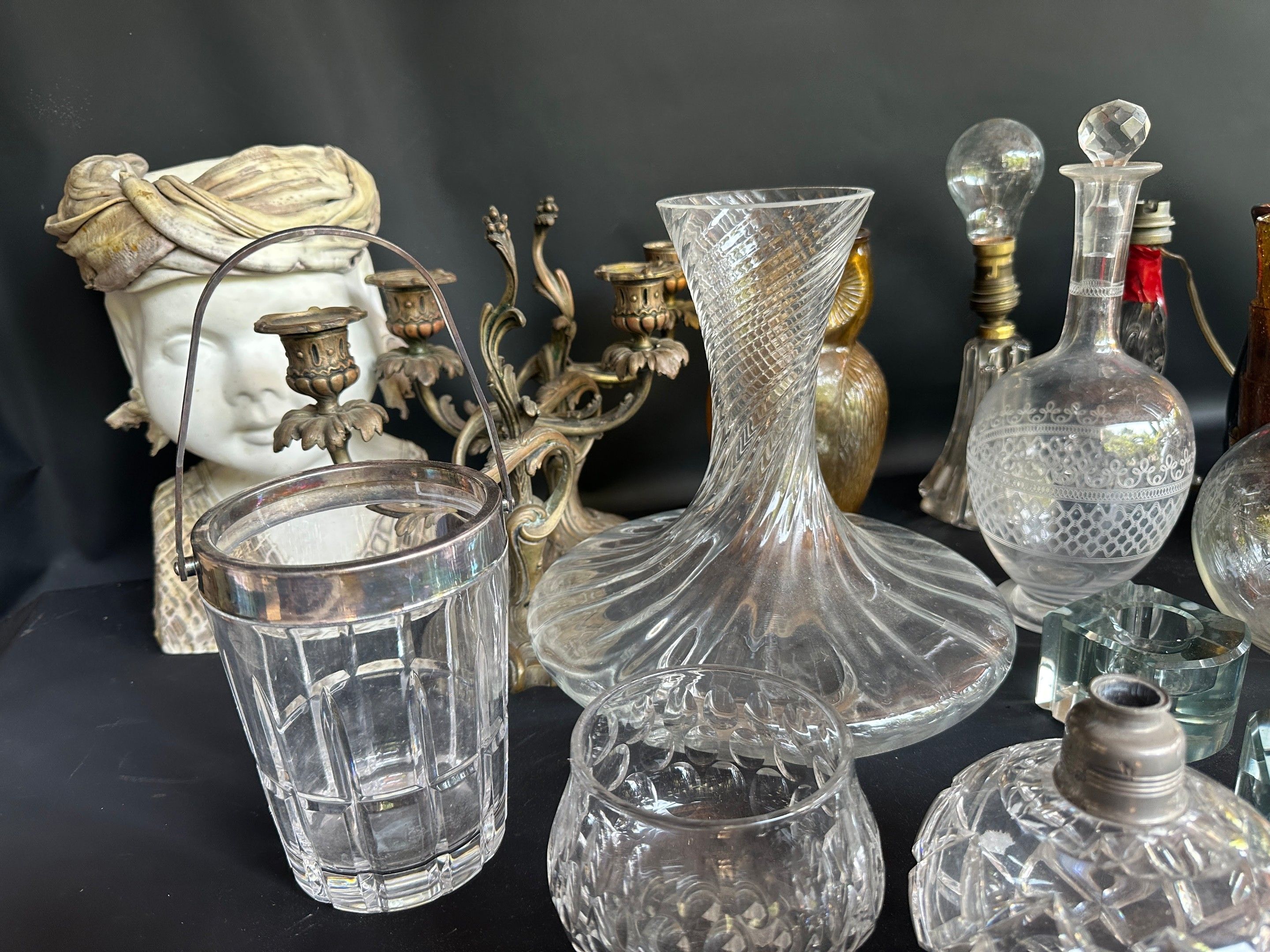 Lot comprising : Biot goblet glasses, ice bucket, pair of rocaille style candlesticks, crystal inkwells, owl carafe, carafes, decanters, wheel-engraved carafes, 50s lamps, crystal pot and miscellaneous