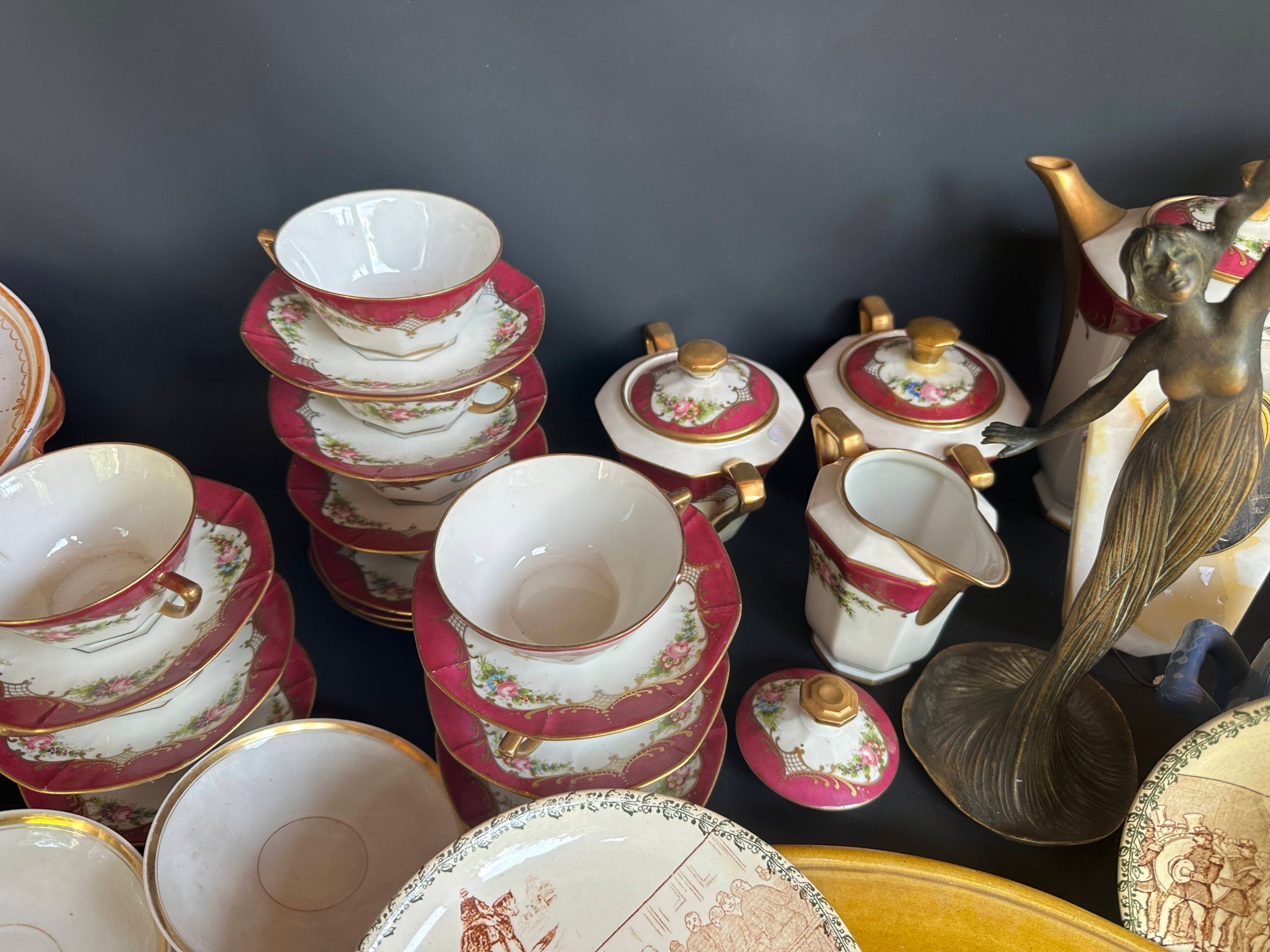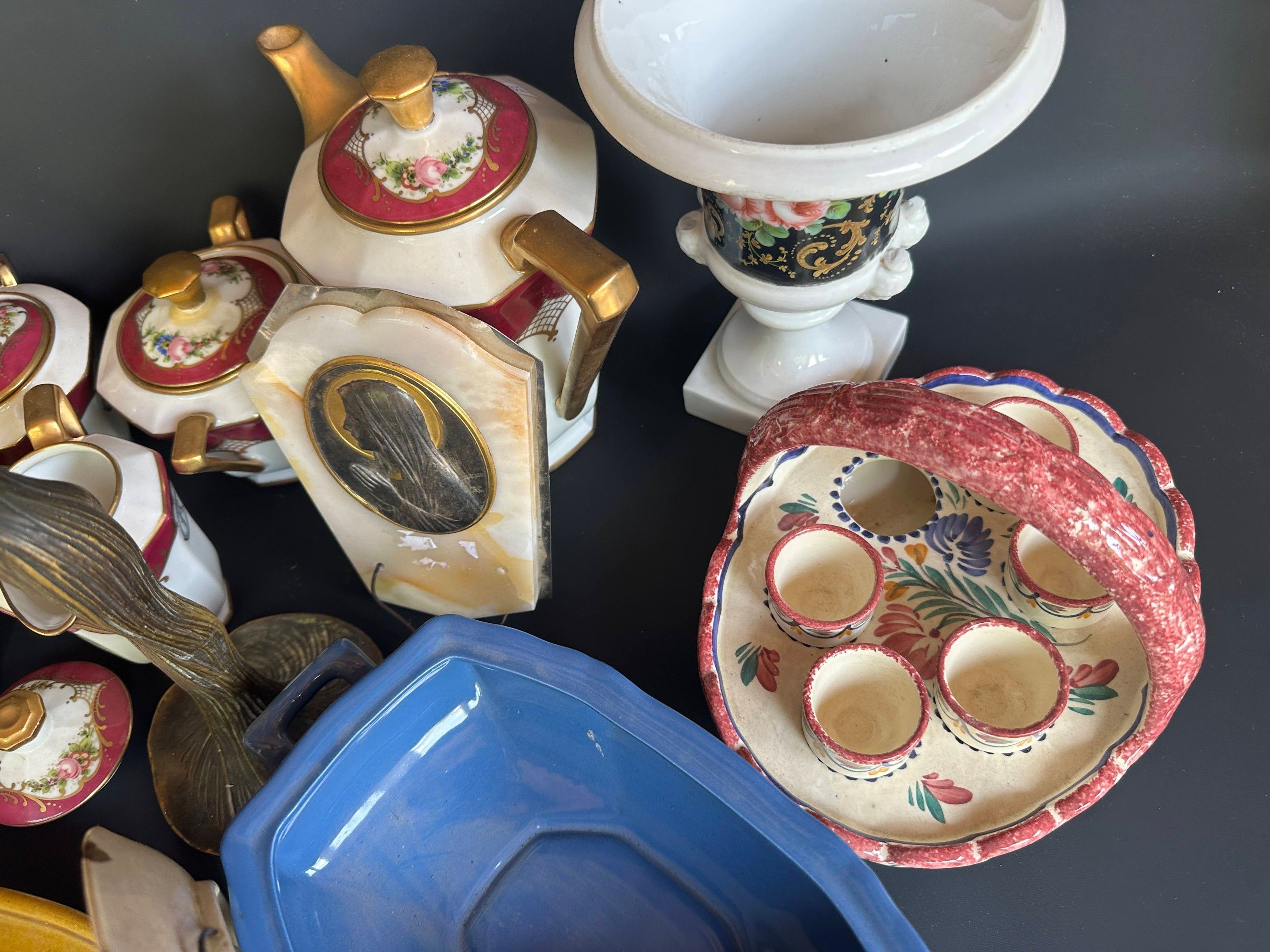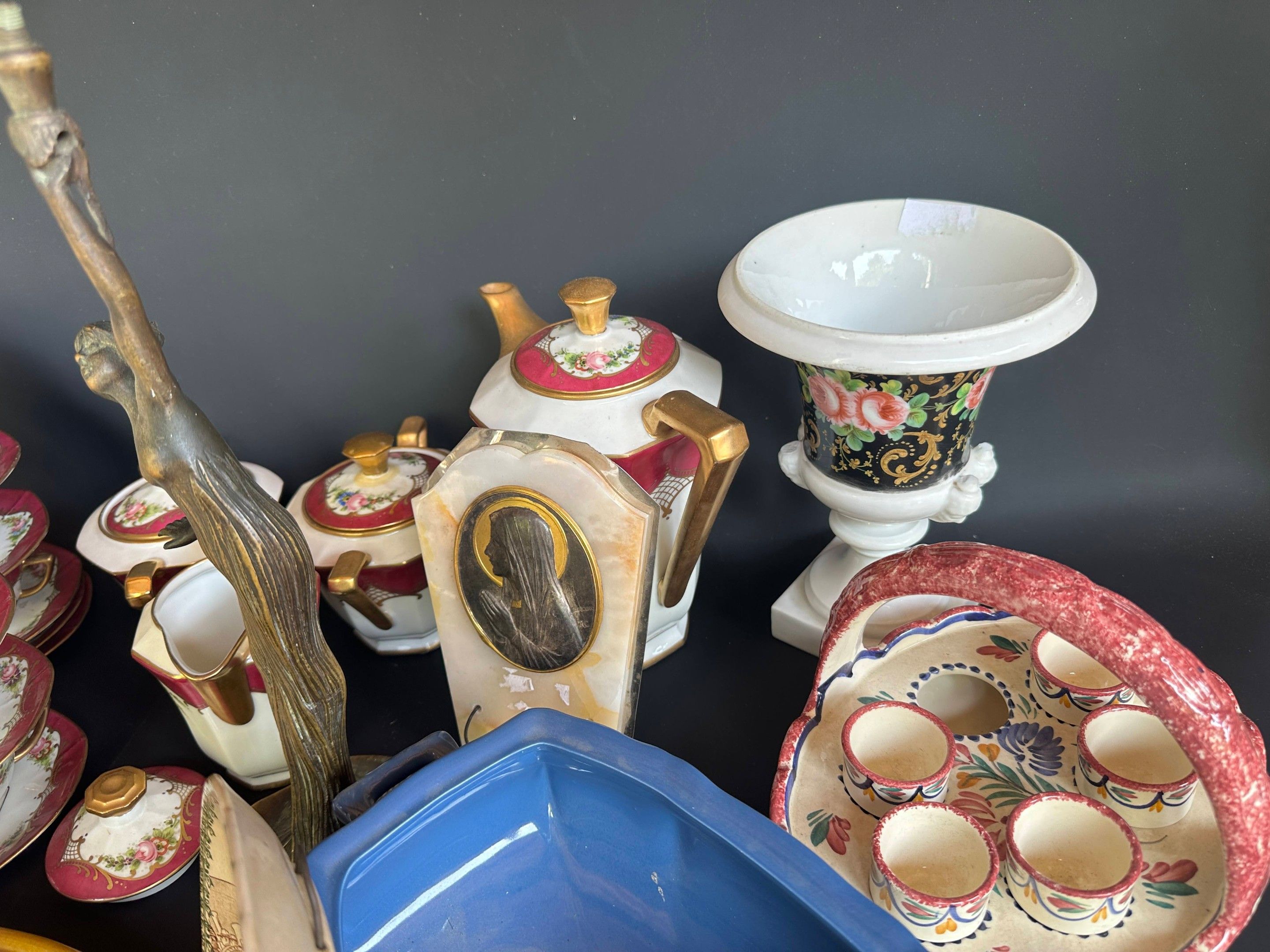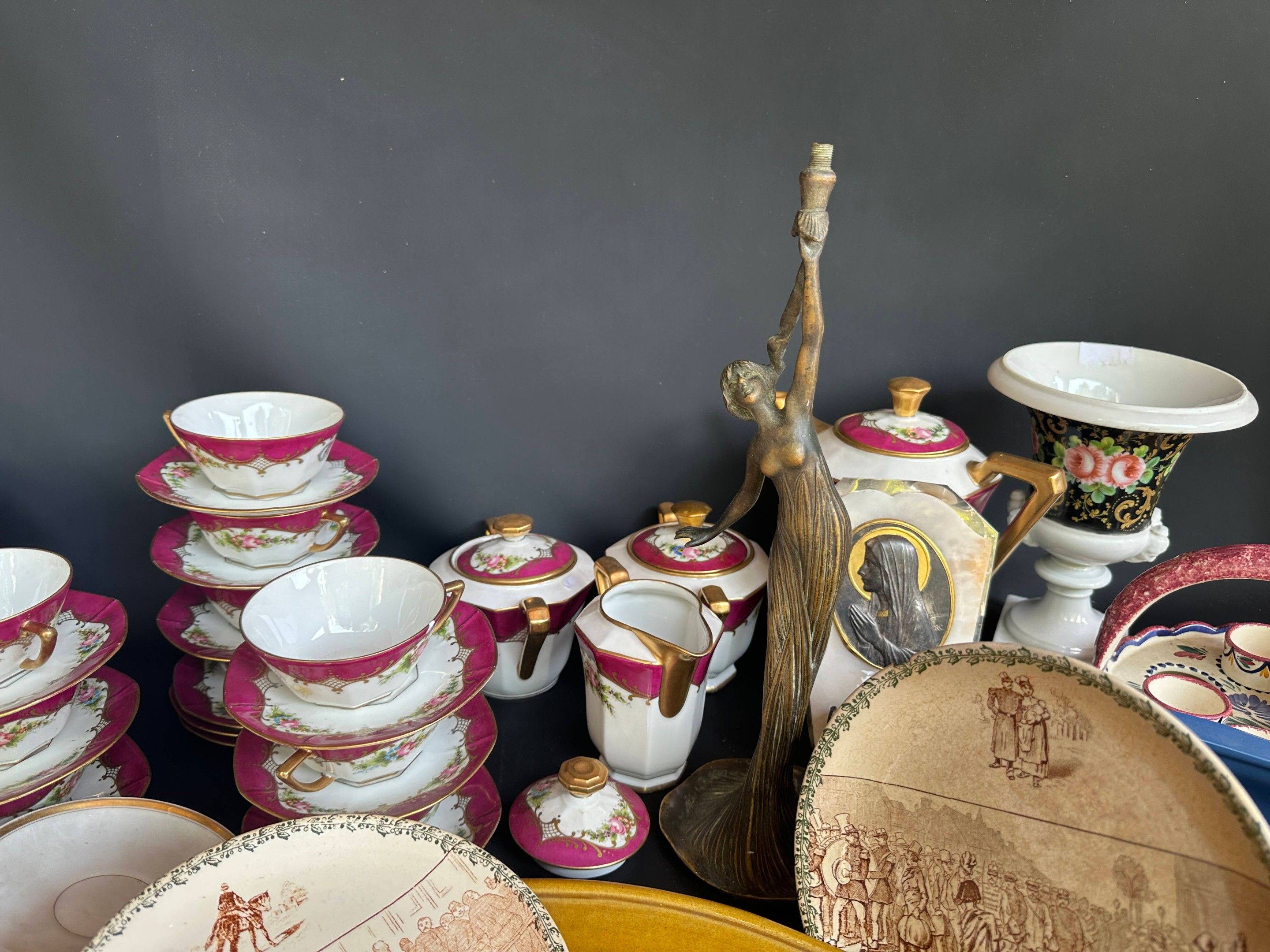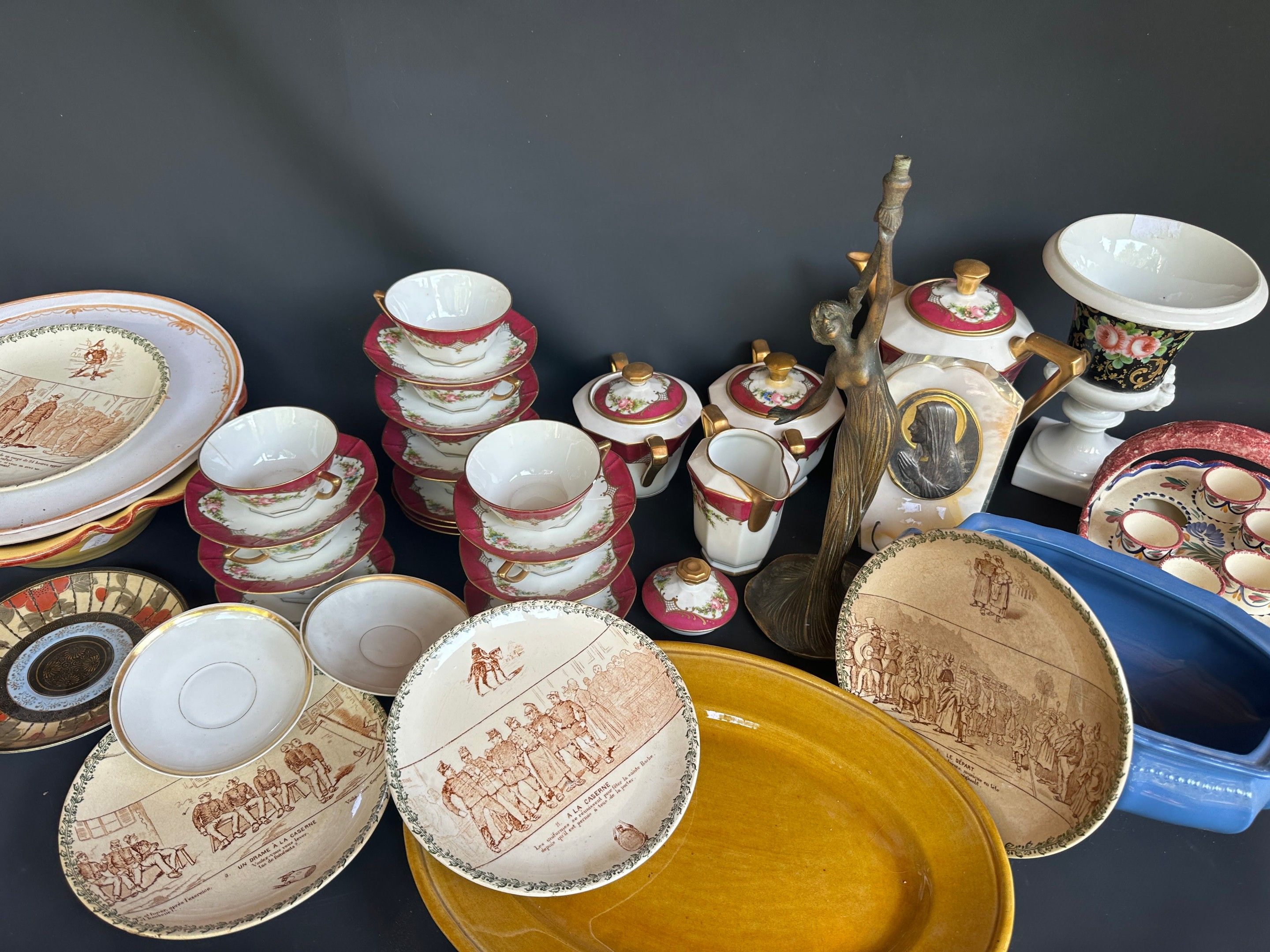 Bronze lamp base in the style of Raoul Larche (37 cm) Part of a porcelain coffee service with hand-crafted decoration and CR numerals (10 cups and saucers, Provence dish, stoup, Quimper egg cup holder (incomplete), Médicis vase).