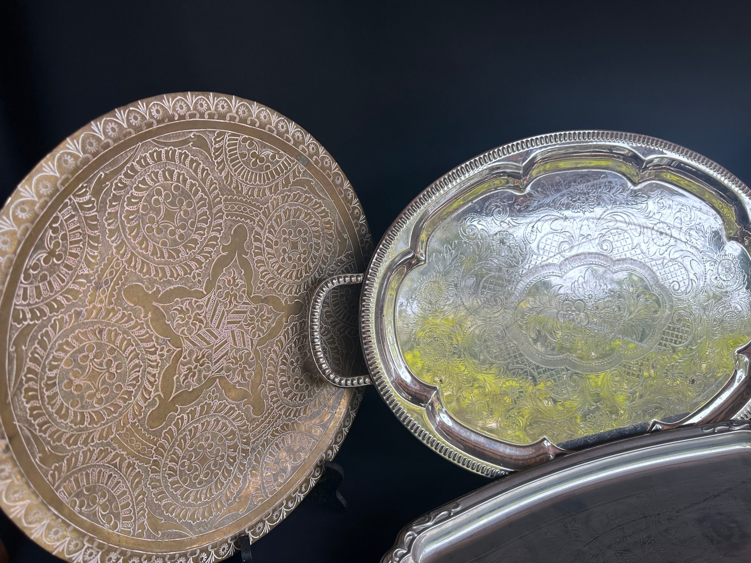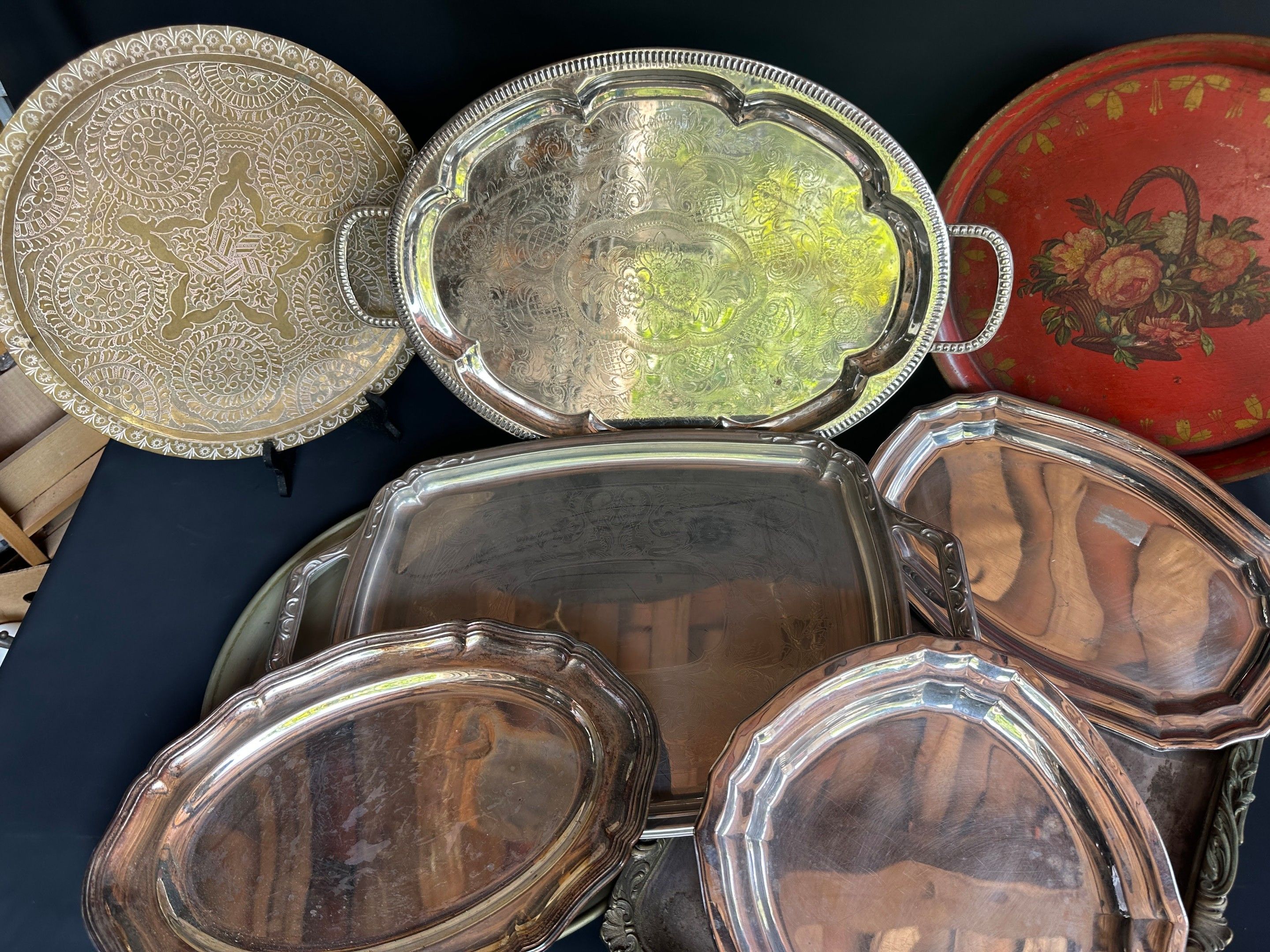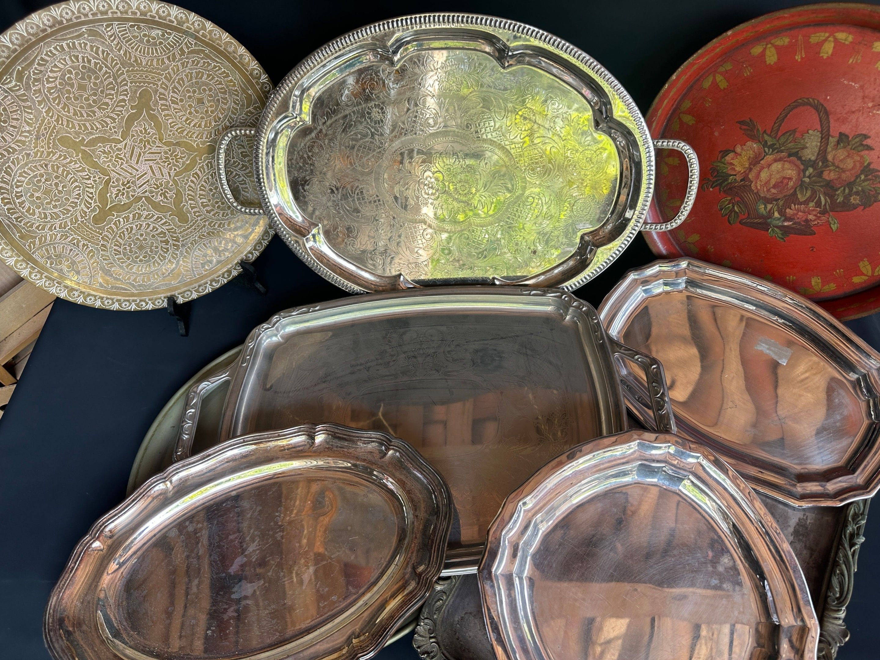 Set of silver plated dishes and trays, sheet metal and various metals, 3 oval, 4 round, 2 rectangular