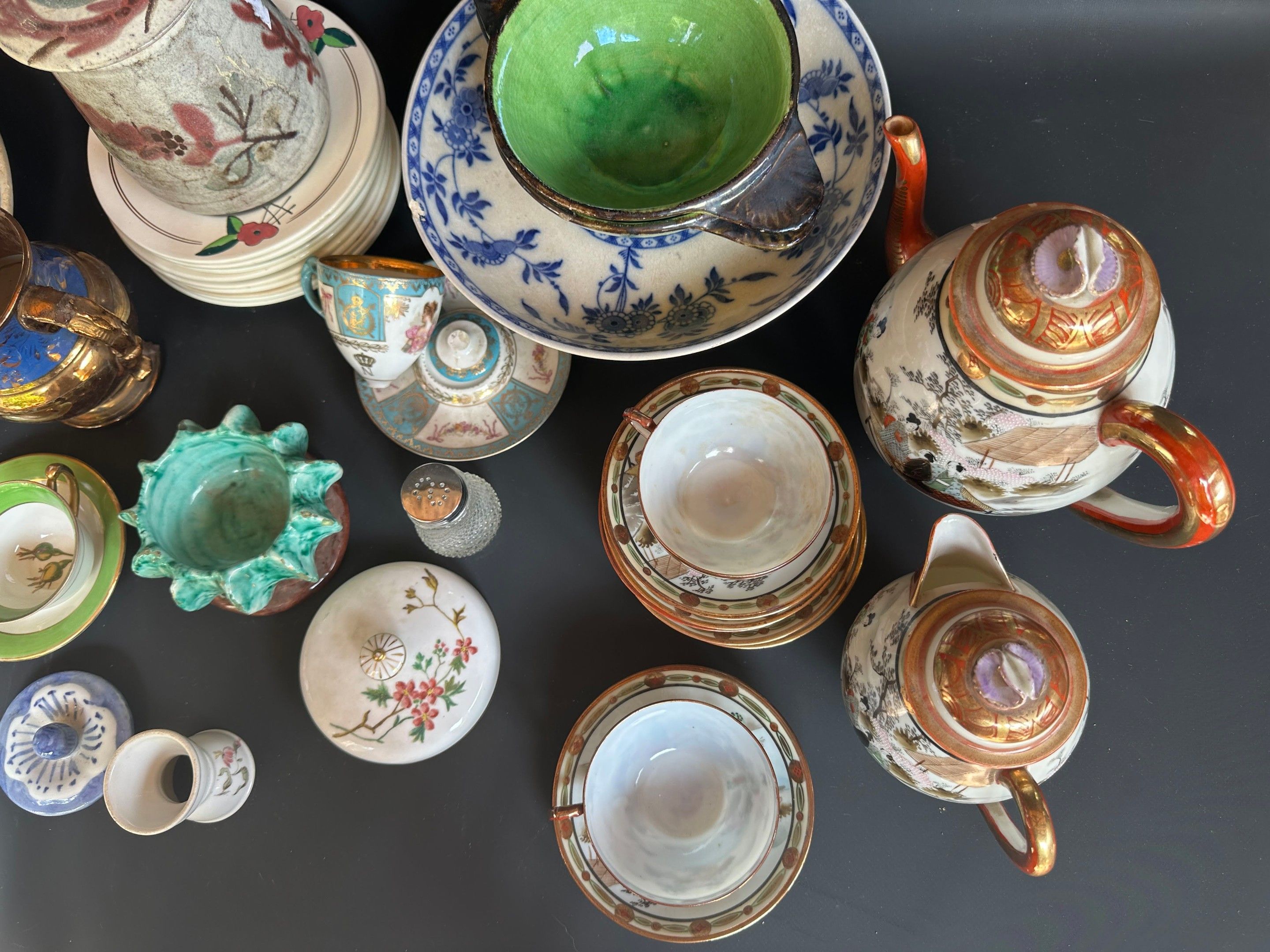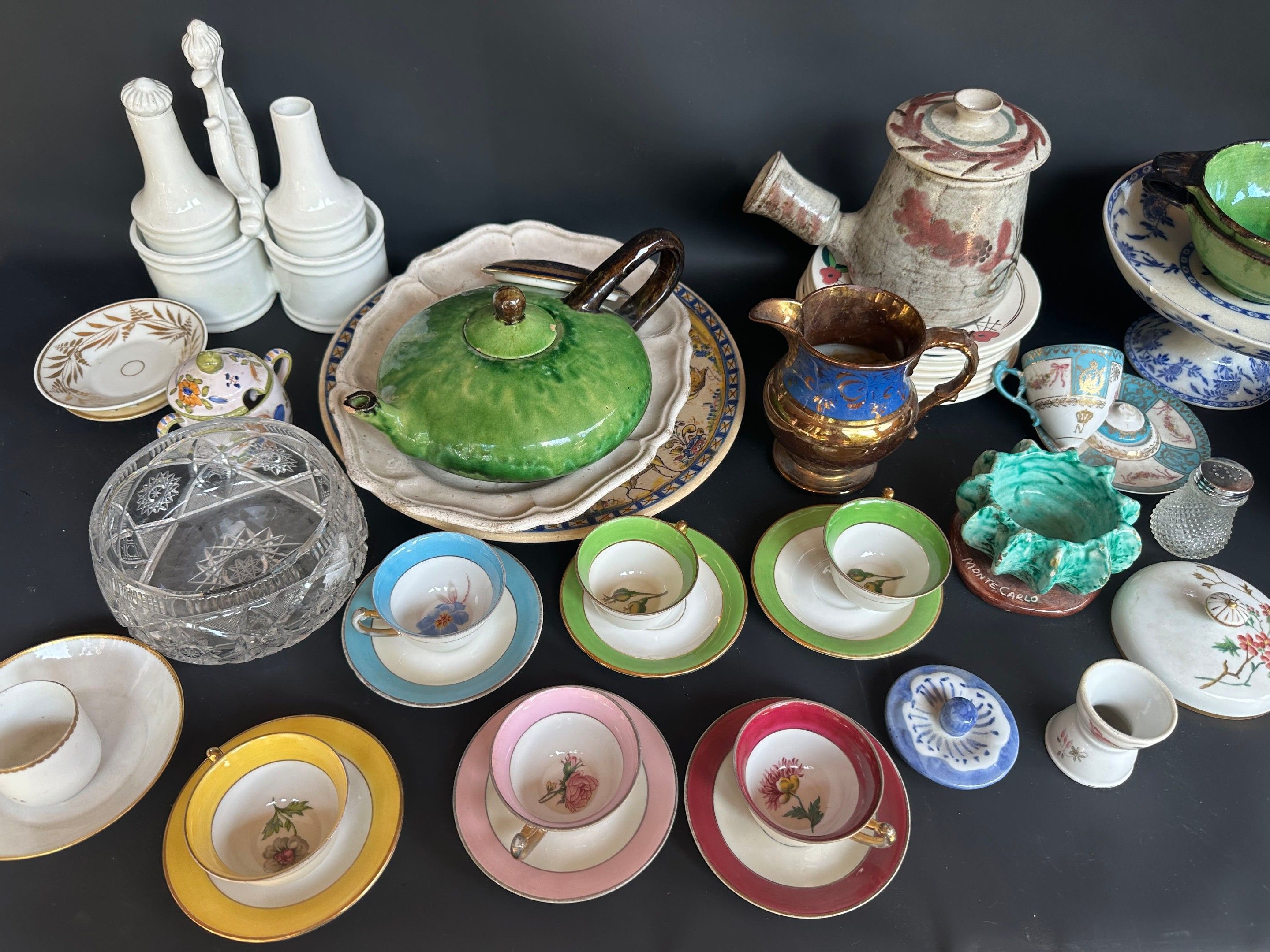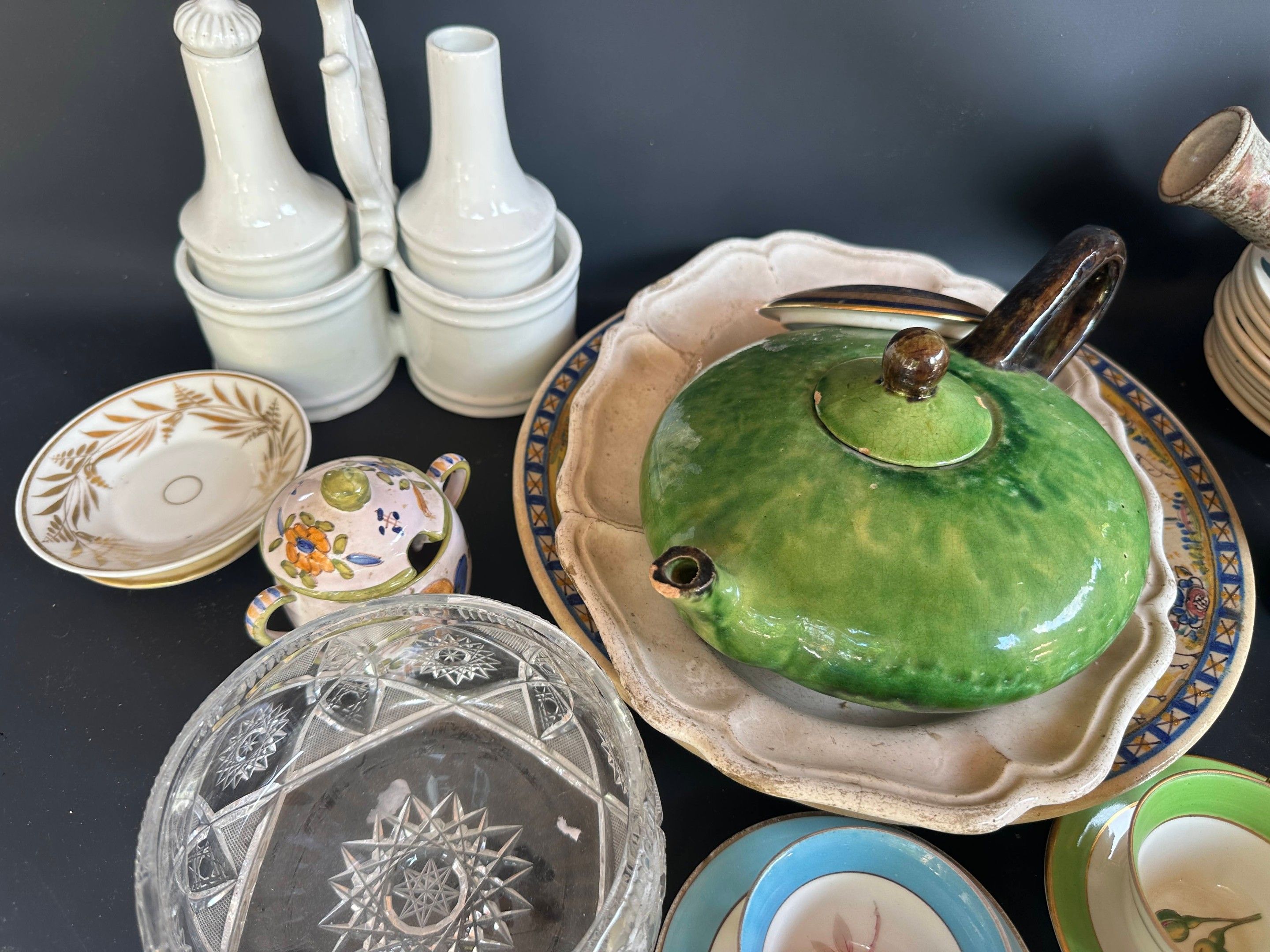 lot including cut crystal cup, jersey pot, ashtray in barbotine from Monte Carlo and suite of coffee cups and saucers, Japanese porcelain service including saucers, milk pot, teapot, Provençal earthenware