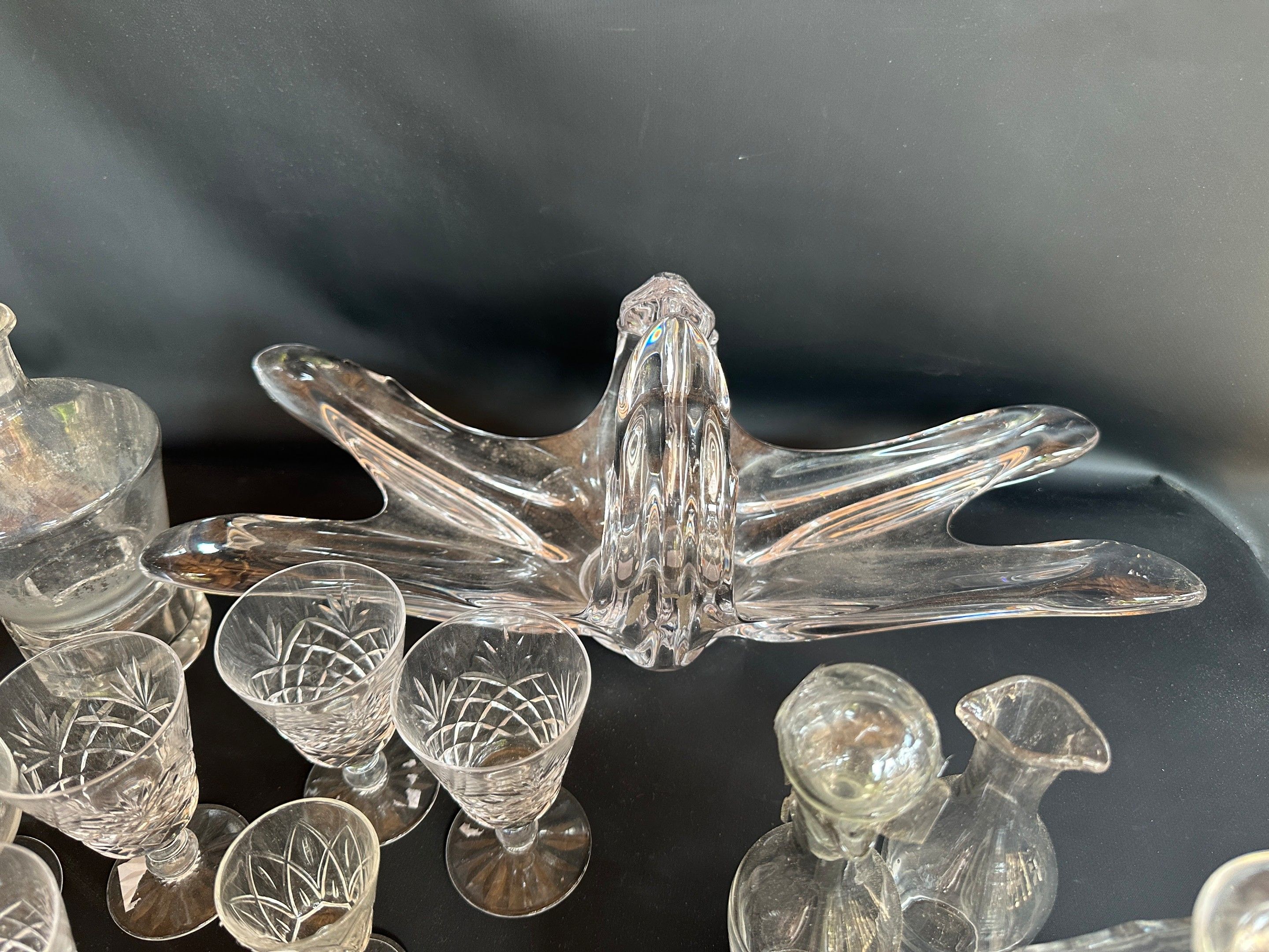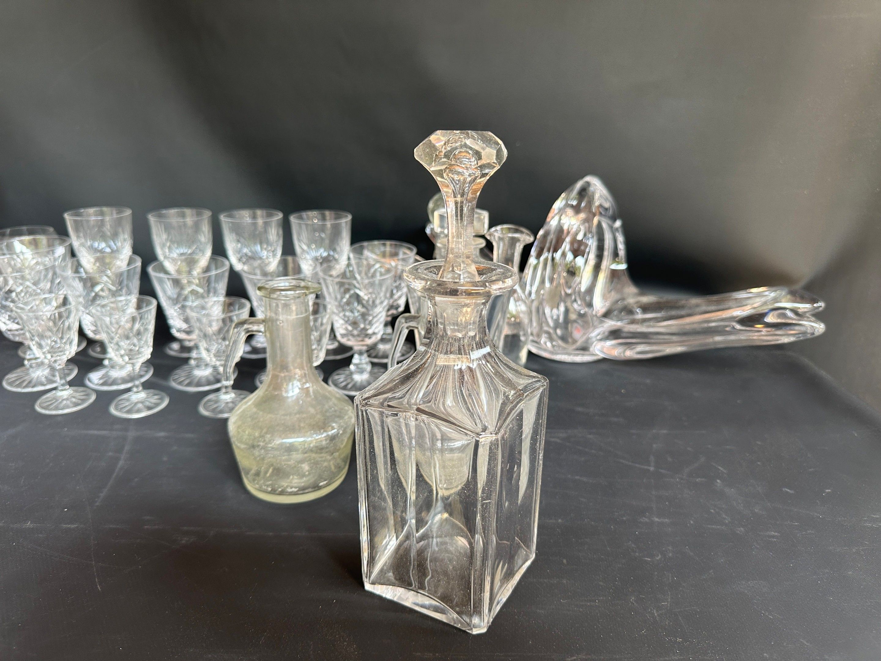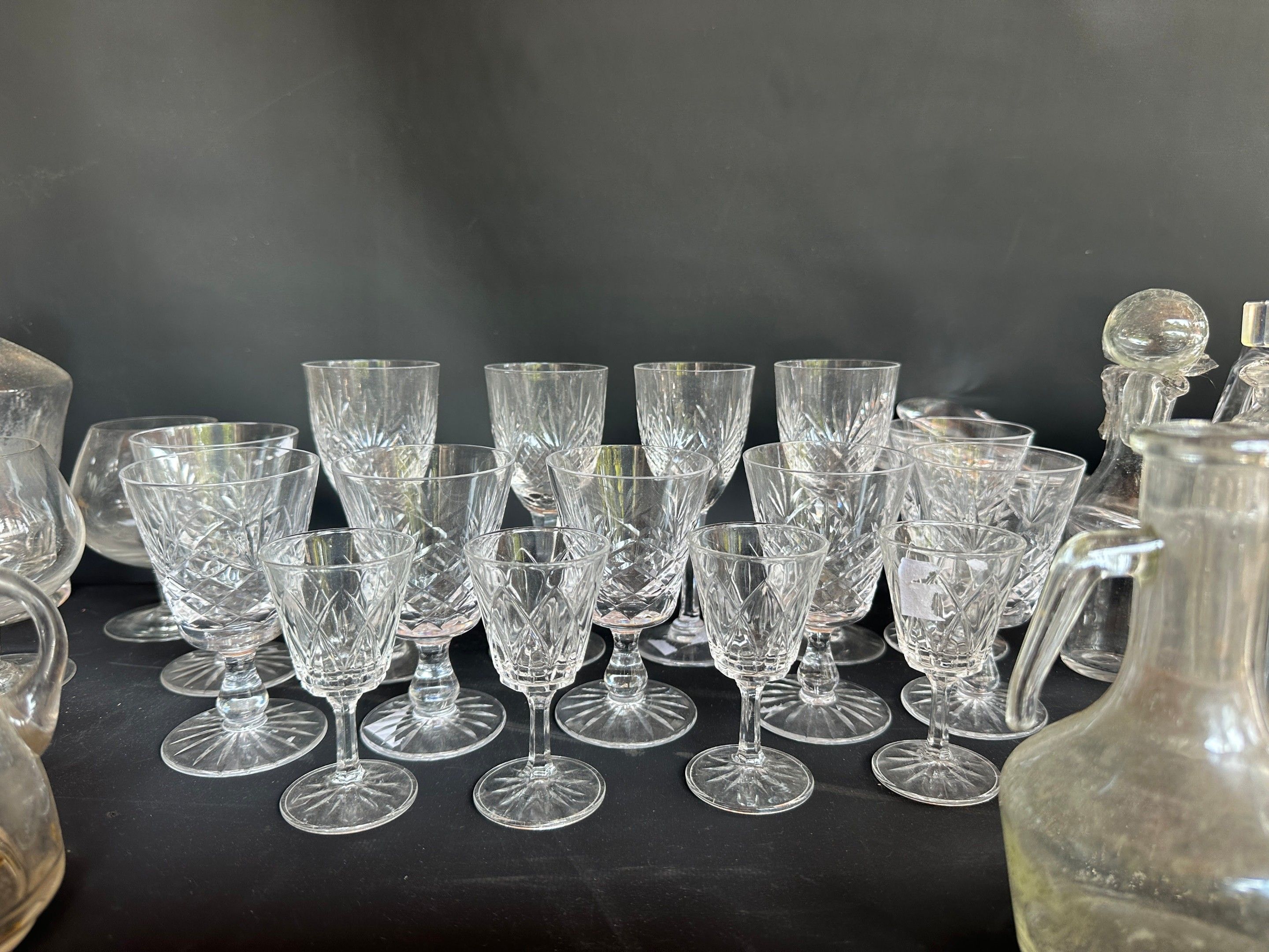 Lot of glassware, including a large fruit bowl from the 1970s, a pair of crystal decanters, carafes, part of a set of cut crystal glasses, two Puget oil cruets, and an old vinegar cruet.