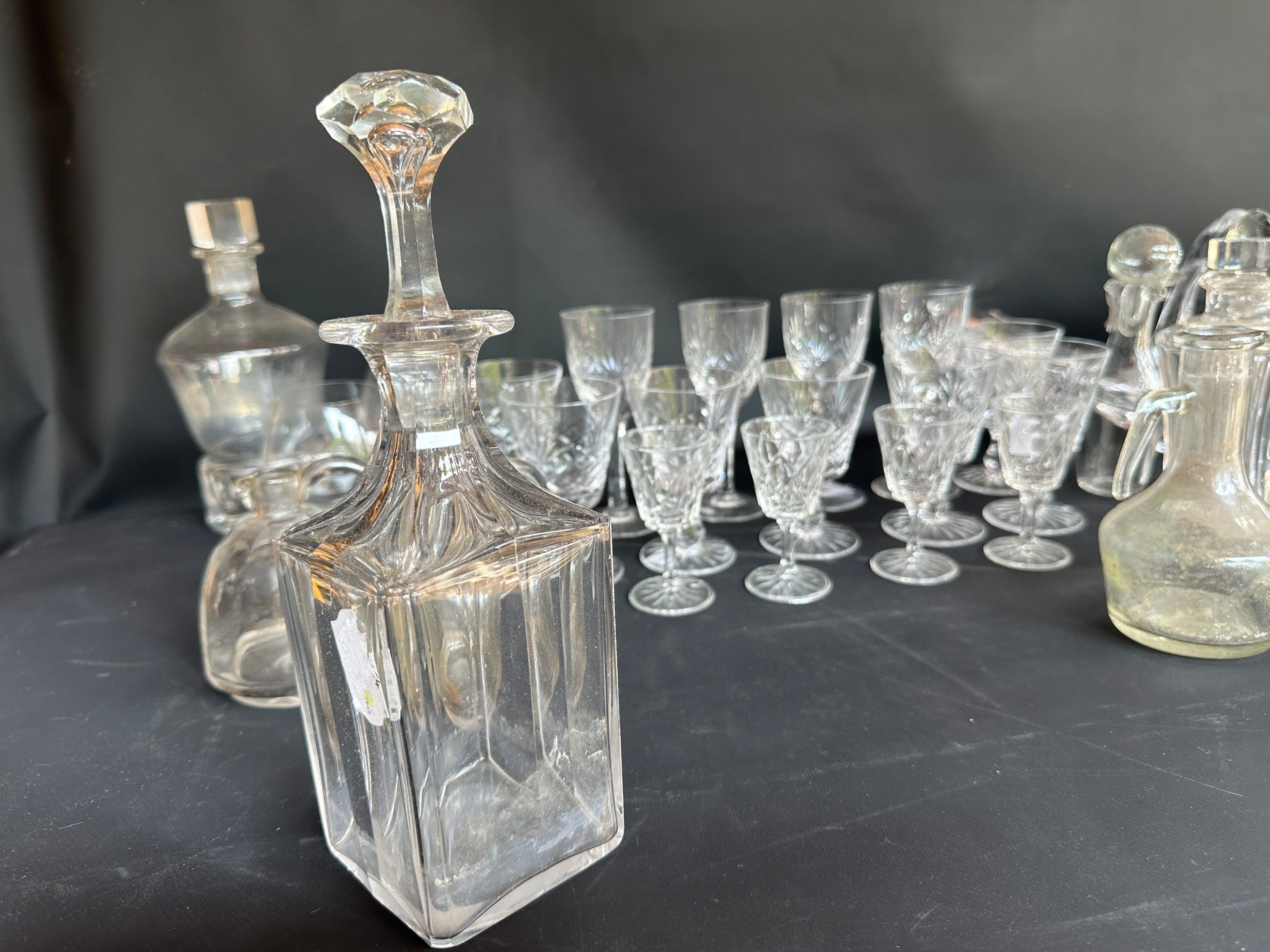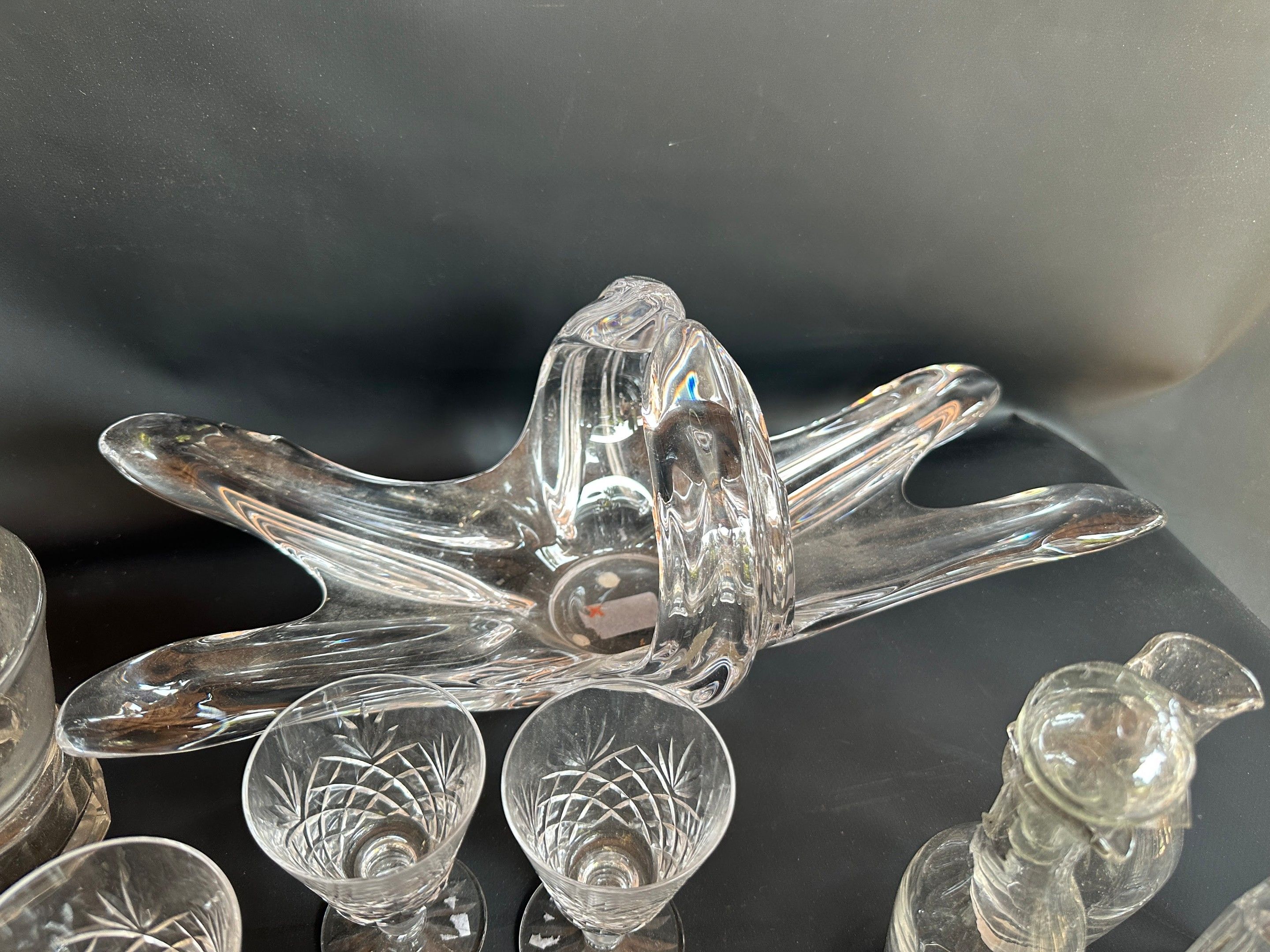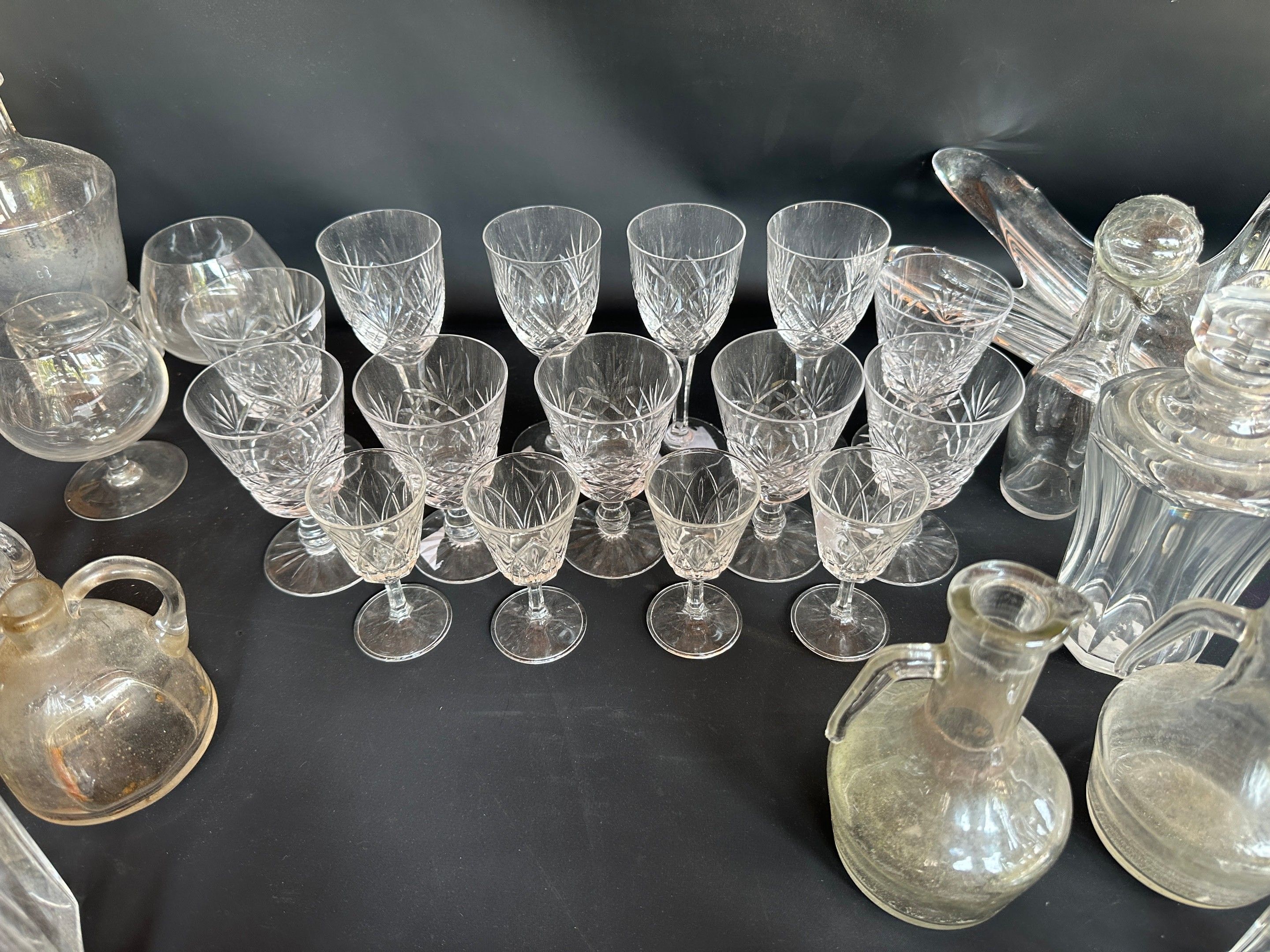Lot of glassware, including a large fruit bowl from the 1970s, a pair of crystal decanters, carafes, part of a set of cut crystal glasses, two Puget oil cruets, and an old vinegar cruet.