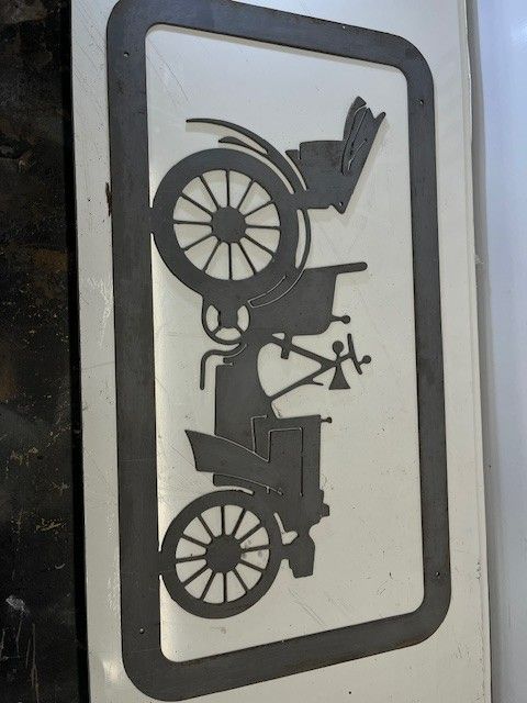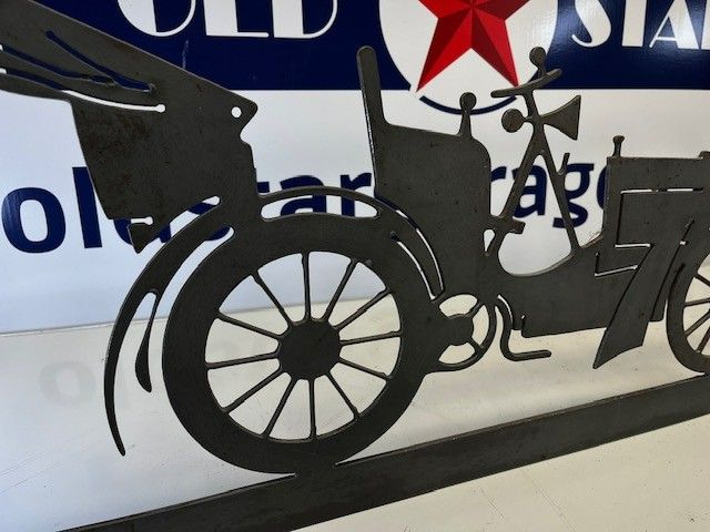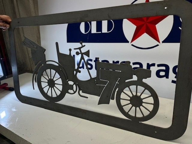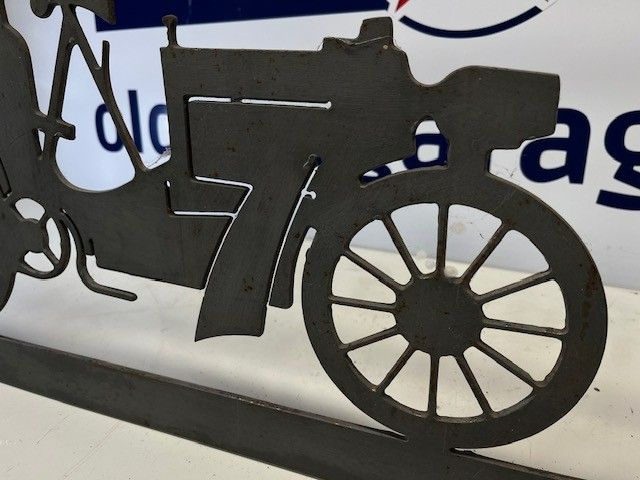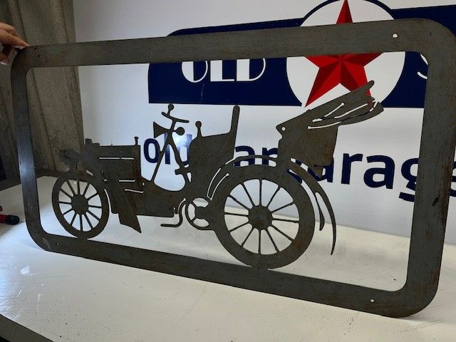 DECORATION PLATE in cut METAL, representing a PRE-WAR car. Very good condition, heavy grey plate. Size 84x46x0.4cm