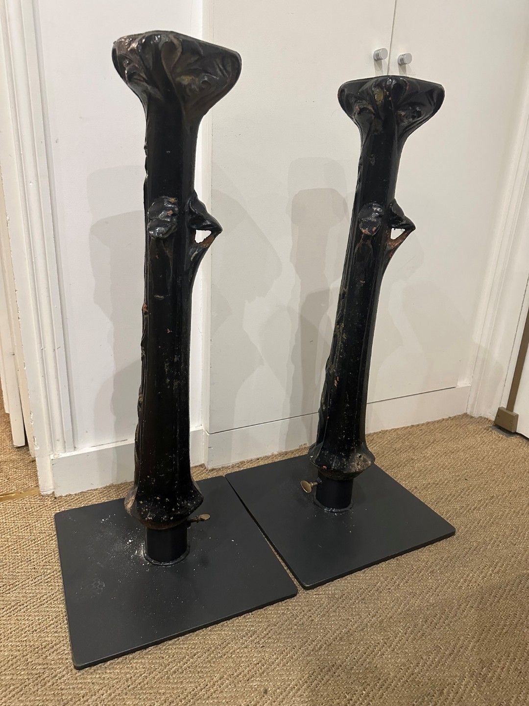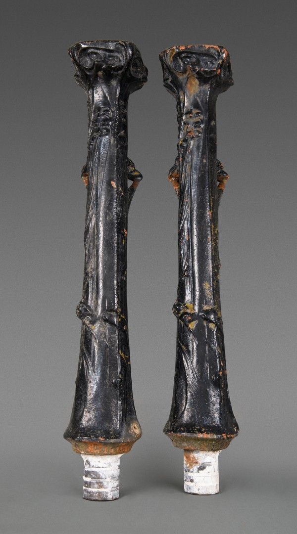 Pair of cast-iron bouquet-holder pilasters with naturalistic stylised floral motifs.