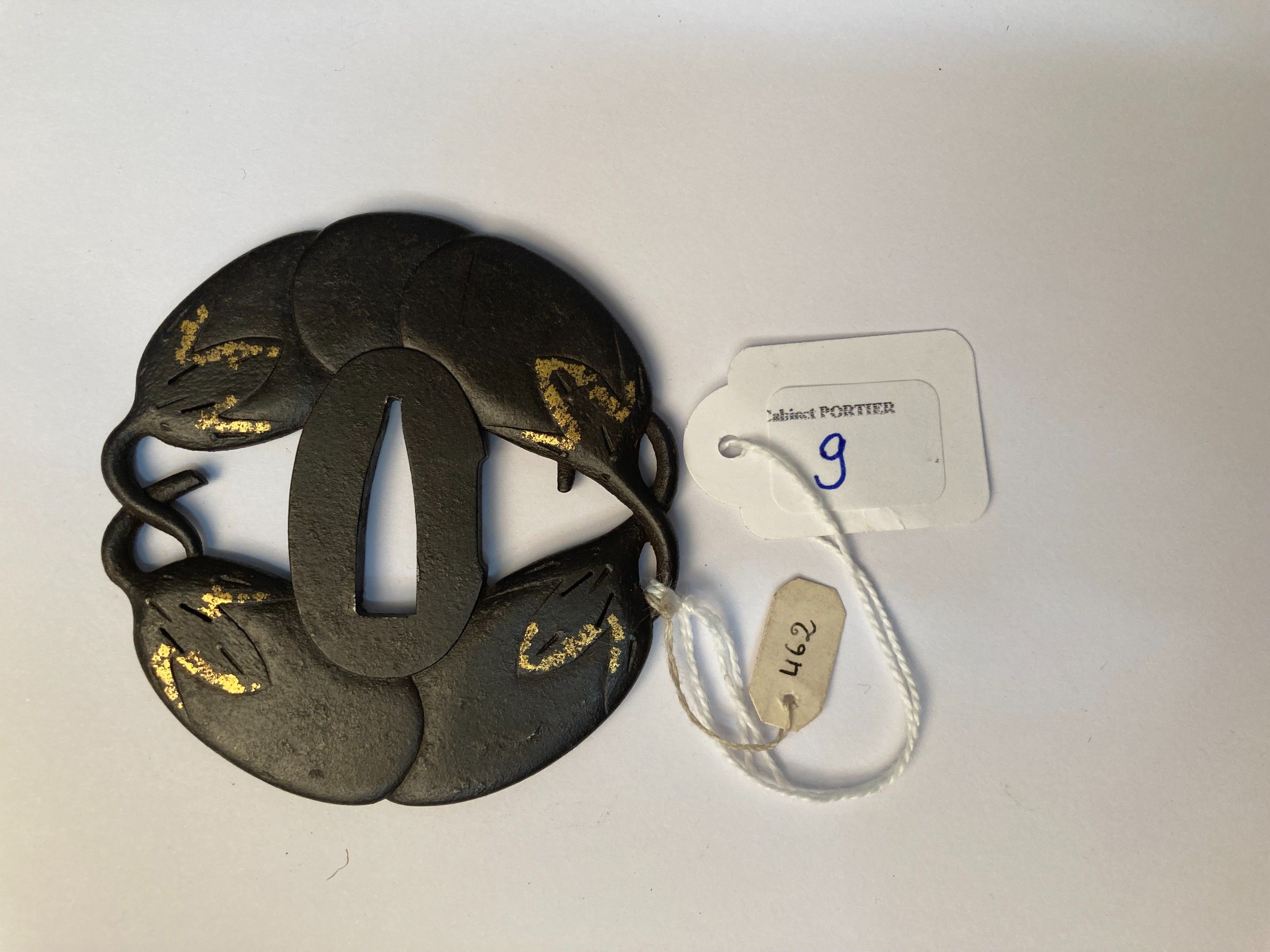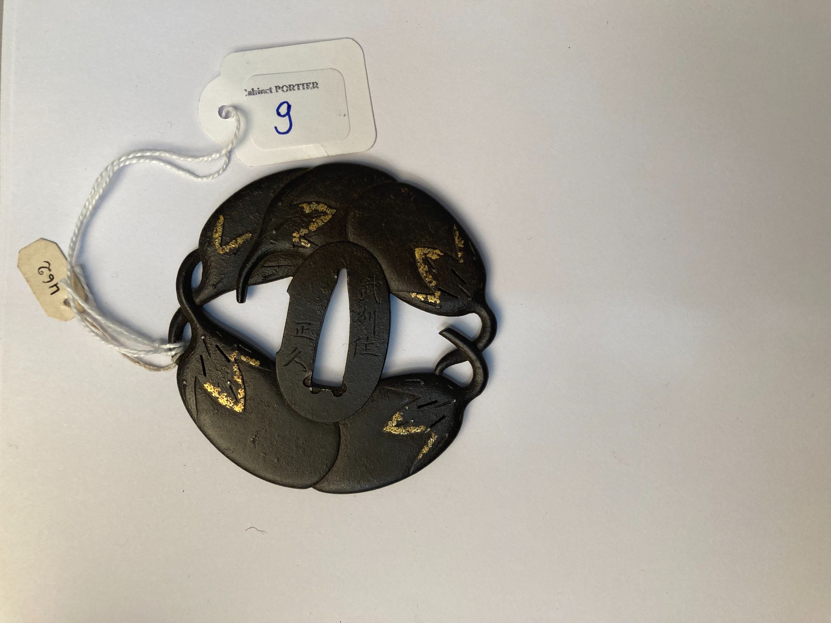 JAPAN, Bushu school - EDO period (1603 - 1868), - Kawari gata in iron in the shape of five aubergines enhanced with gilt copper nunome zogan. Signed Bushu (no) ju Masahisa. - H. 7,5 cm - - Reference : A similar tsuba in the Ashmolean Museum, Oxford, Accession no. EAX.10547 - - Expert : Cabinet Portier -