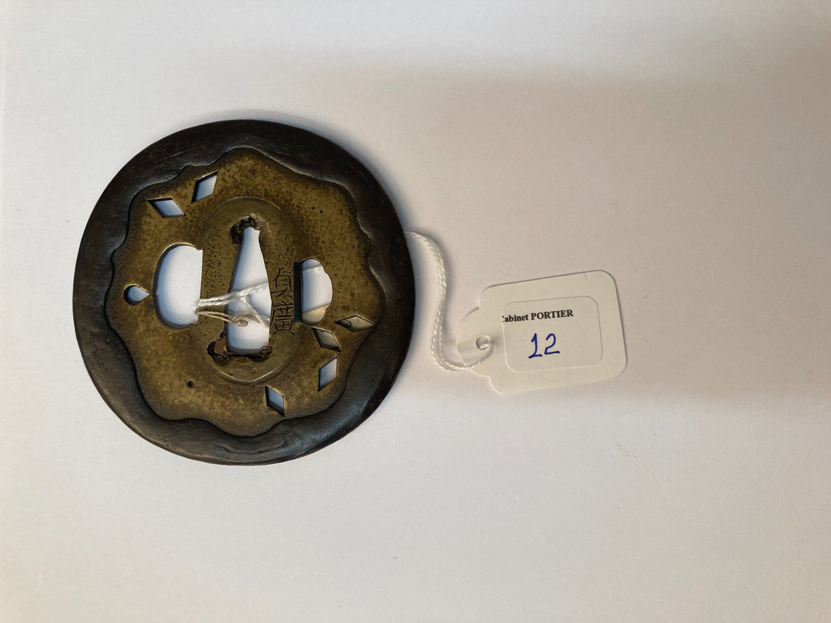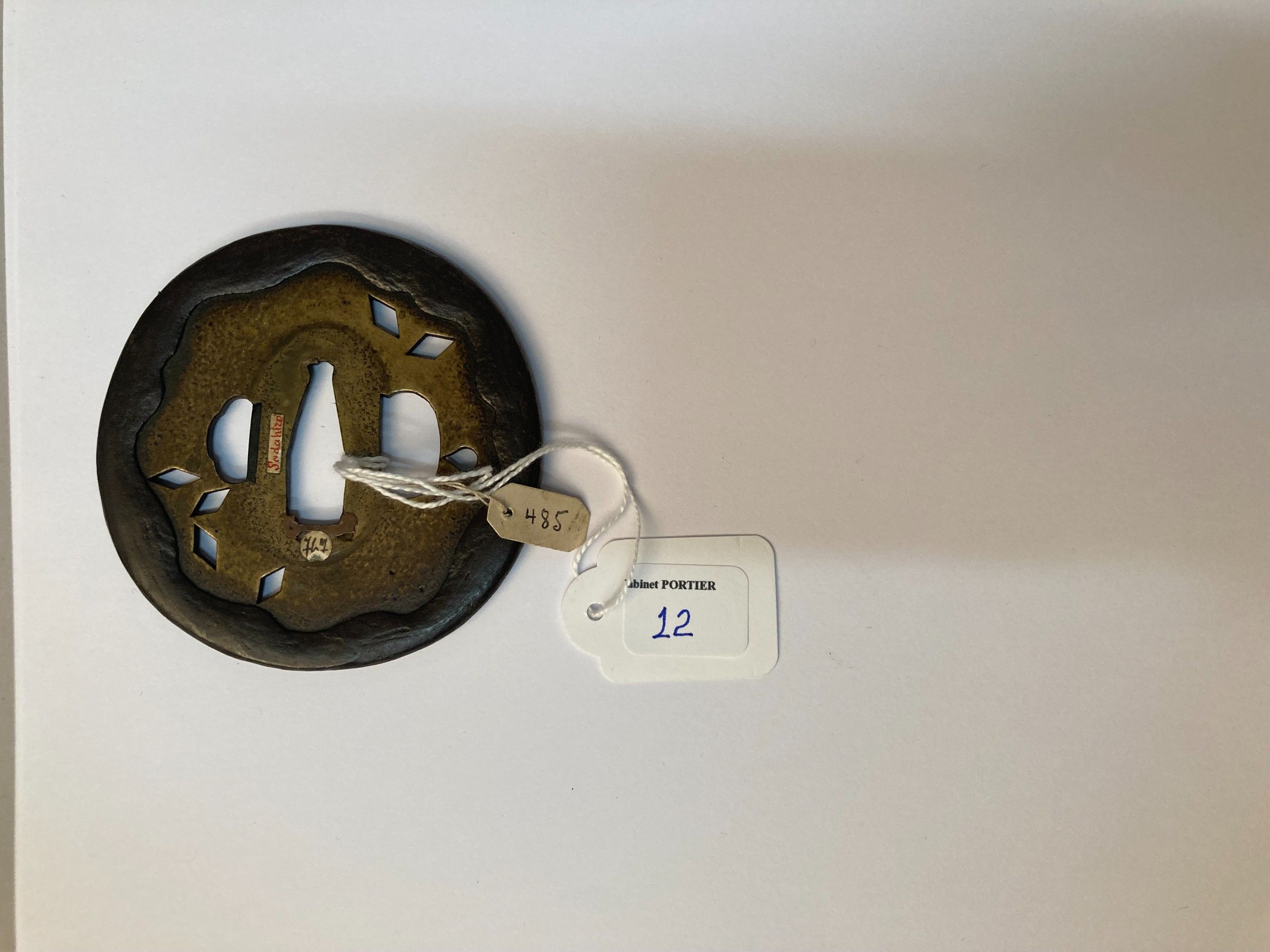 JAPAN - Early EDO period (1603 - 1868), XVIIIth/XIXth century, - Maru gata in sentoku openwork in kage sukashi of lozenges, the fukurin in irregular iron. Signed Sadahiro. - H. 7,7 cm - - Expert : Cabinet PORTIER -