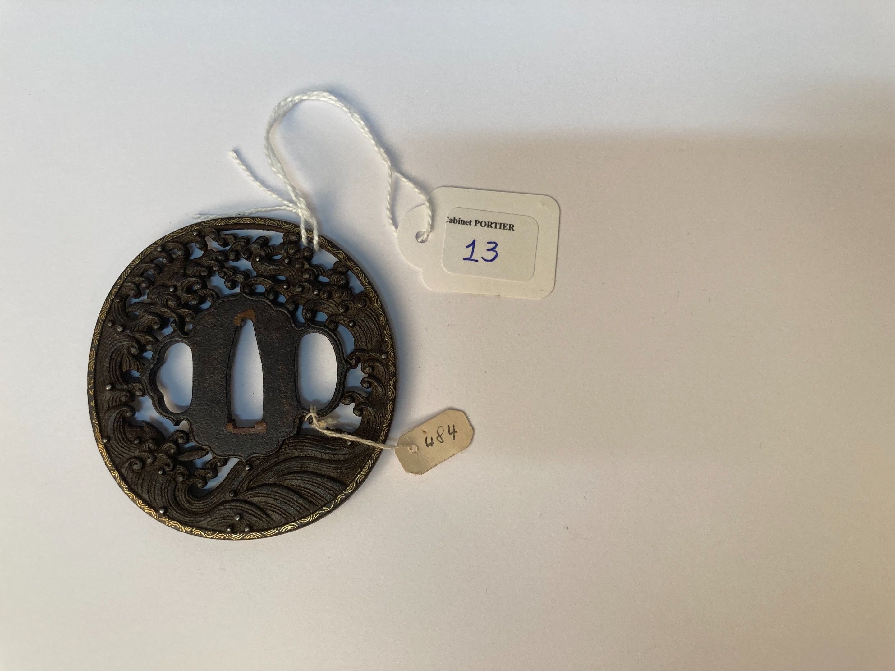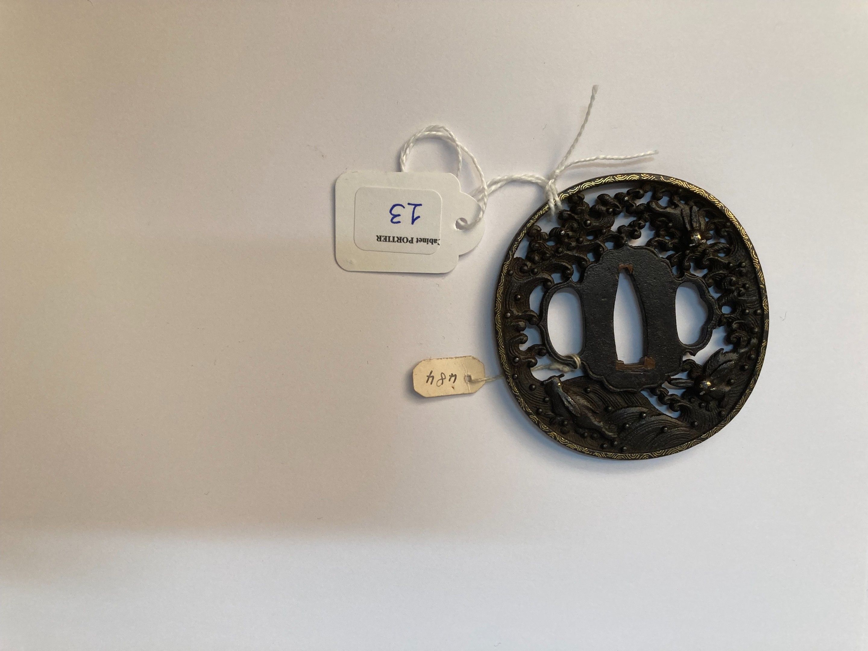 JAPAN, namban? - Middle EDO period (1603 - 1868), - Nagamaru gata in chased iron in maru bori of three Inaba no shiro usagi in the waves, the mimi decorated in gilded copper sen zogan of circles. Unsigned. - (Wear) - H. 7.1 cm