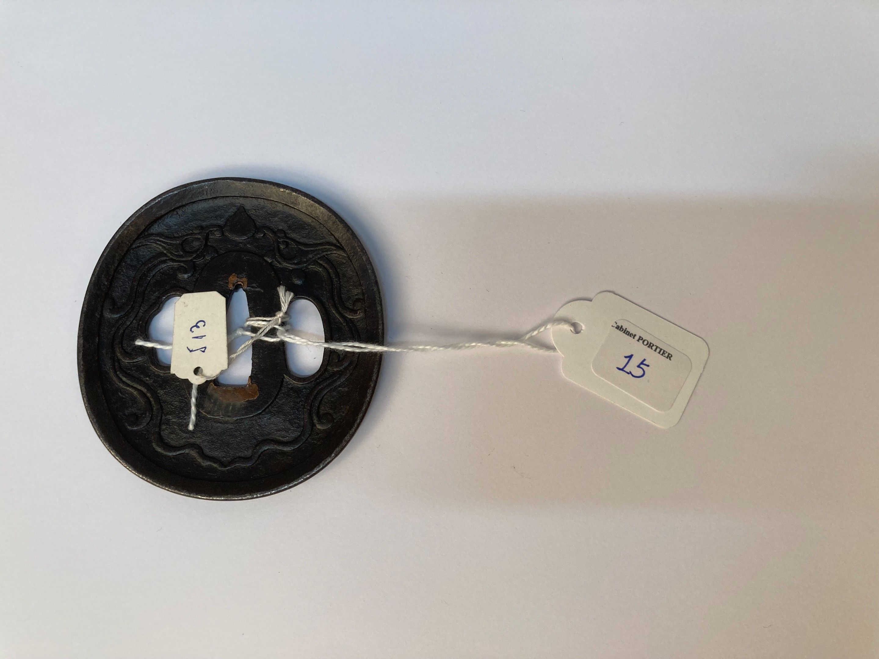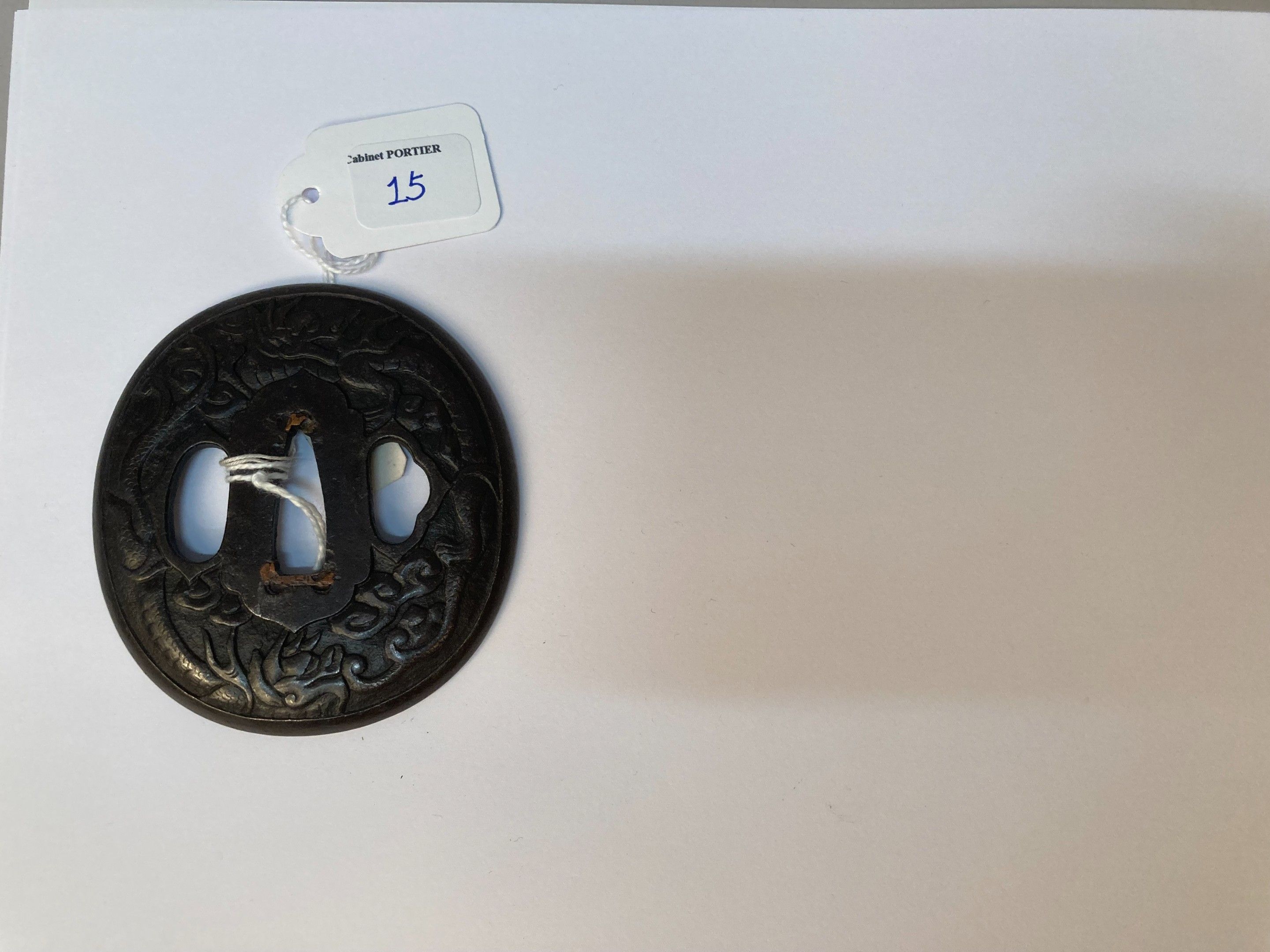 JAPAN, NAMBAN - EDO period (1603 - 1868), 16th century, - Convex iron Nagamaru gata chased in hira bori with two dragons flying in the clouds on one side, two archaizing dragons surrounding a tama on the other. Unsigned. - H. 7,7 cm - - Expert : Cabinet Portier -