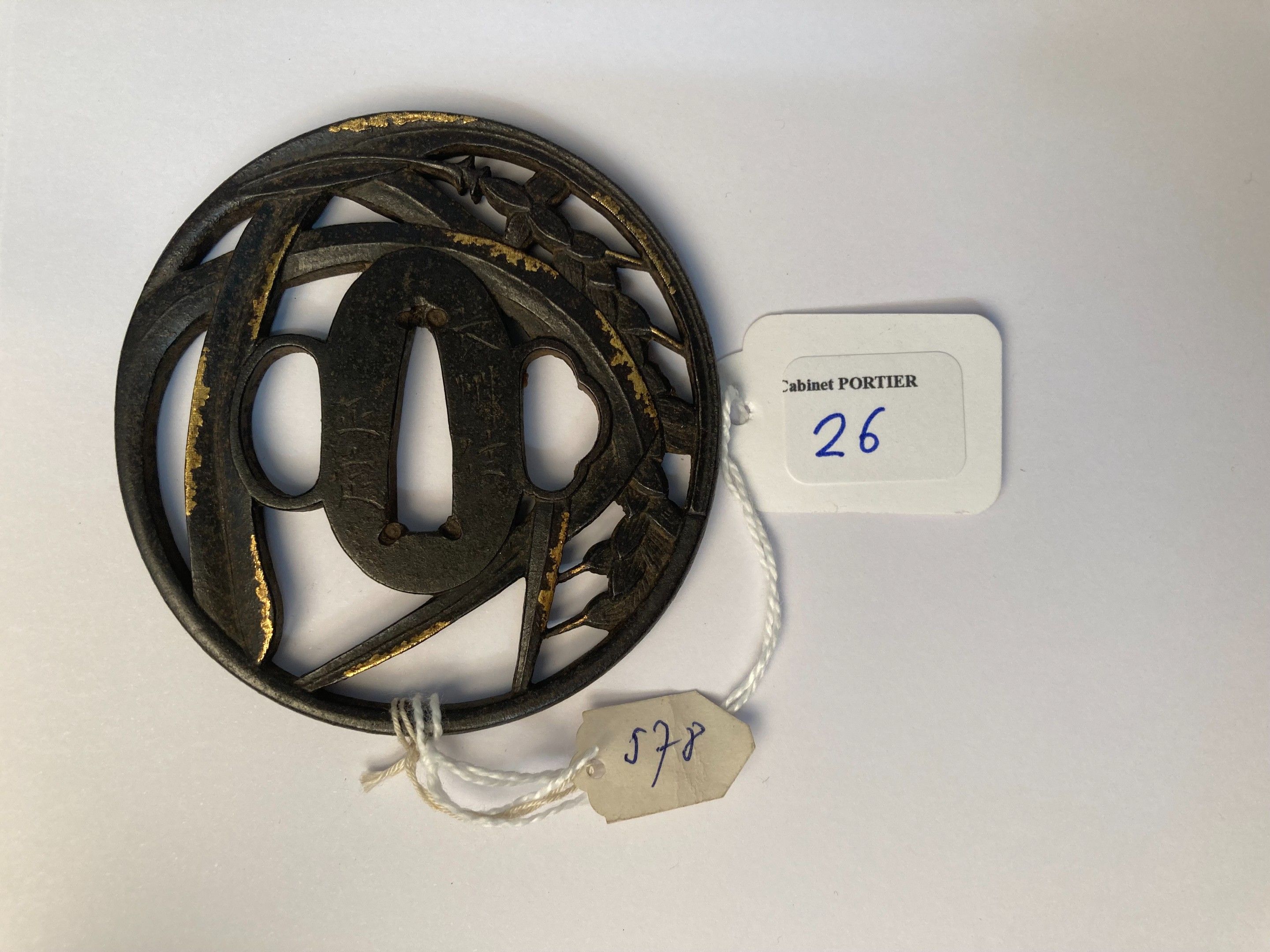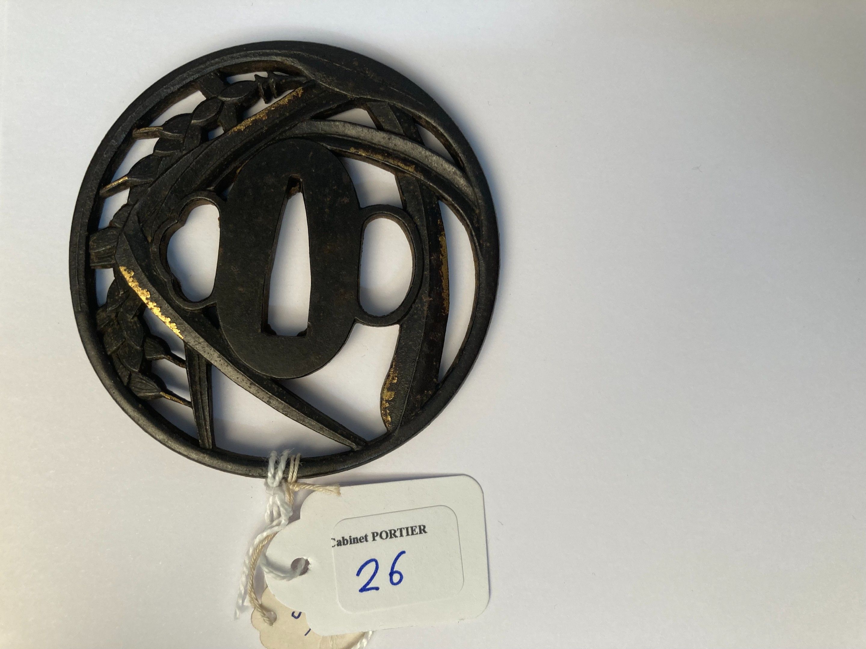 JAPAN - EDO period (1603 - 1868), 19th century, - Openwork iron maru gata in maru bori and gilded copper nunome zogan of rolled wheat ears. Signed Choshu (no) ju Masasada. - H.7,5 cm - - Expert : Cabinet Portier