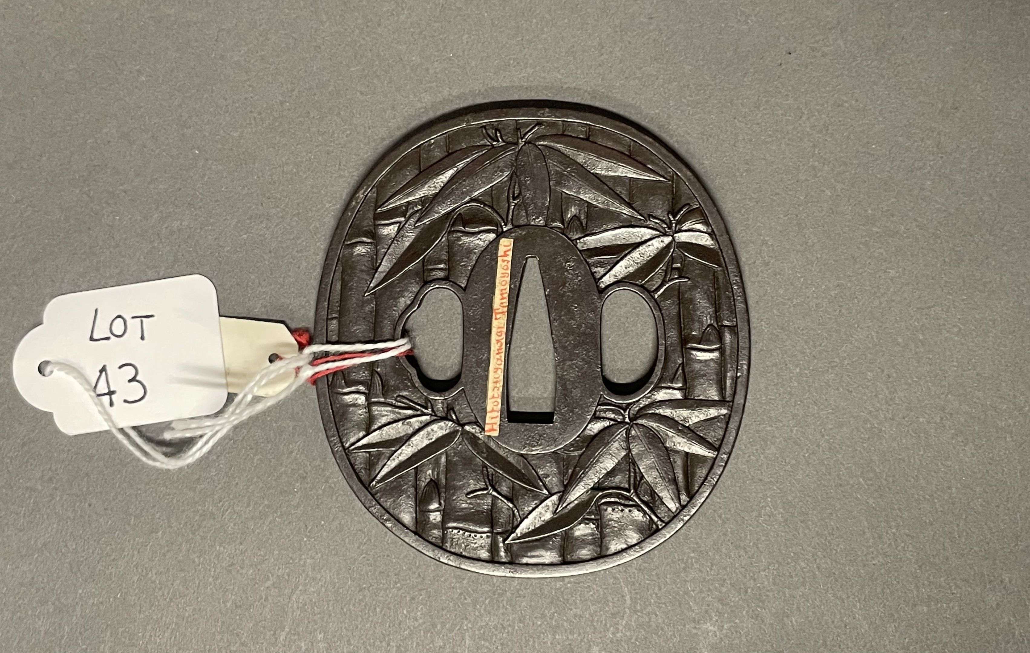 JAPAN, MITO SCHOOL - EDO Period (1603 - 1868), 19th century, - Nagamaru gata in iron chased in hira bori with bamboo stems and leaves. Signed Ichiryu Tomoyoshi and kao. - H. 8,2 cm - - Expert : Cabinet Portier