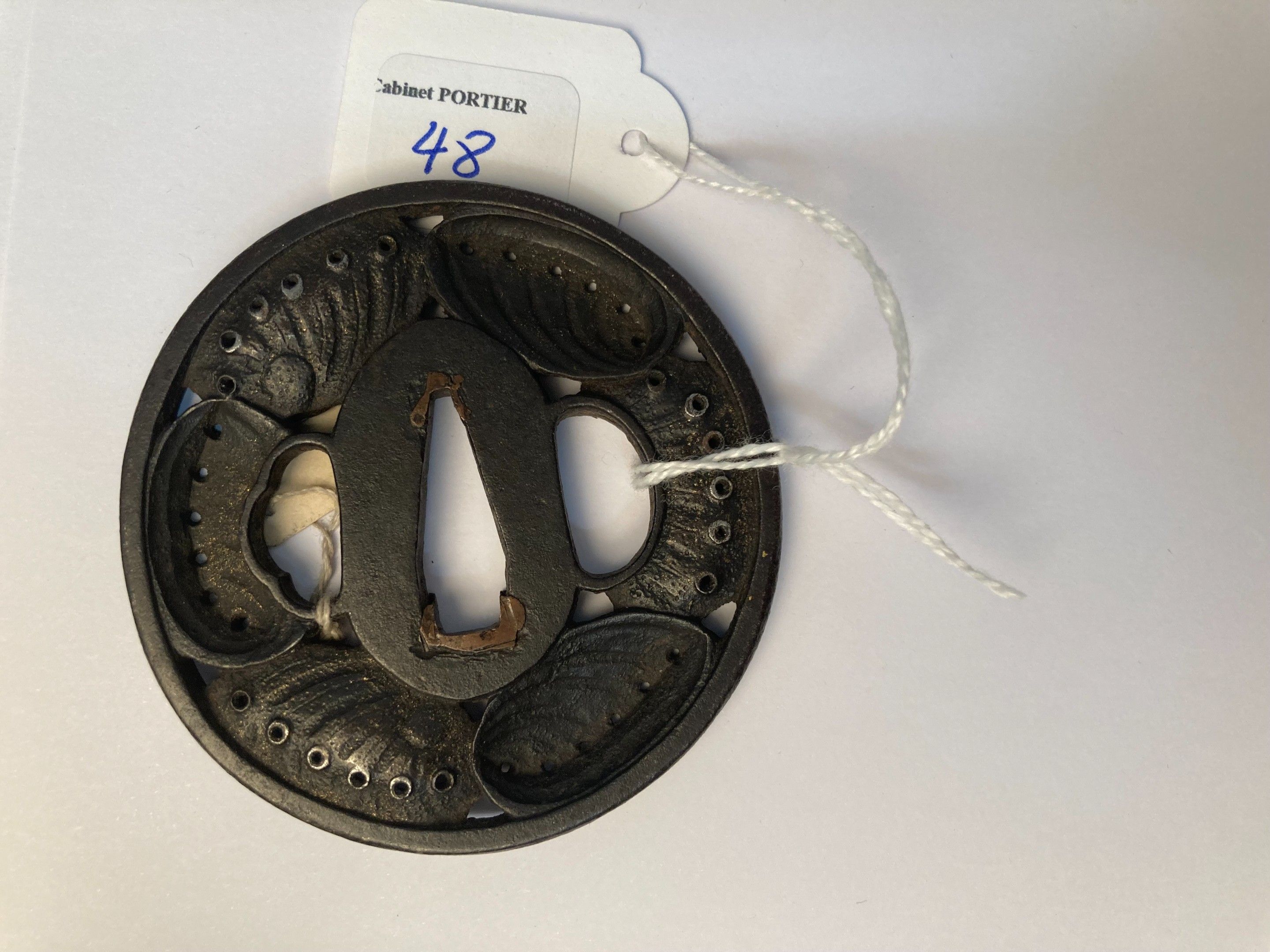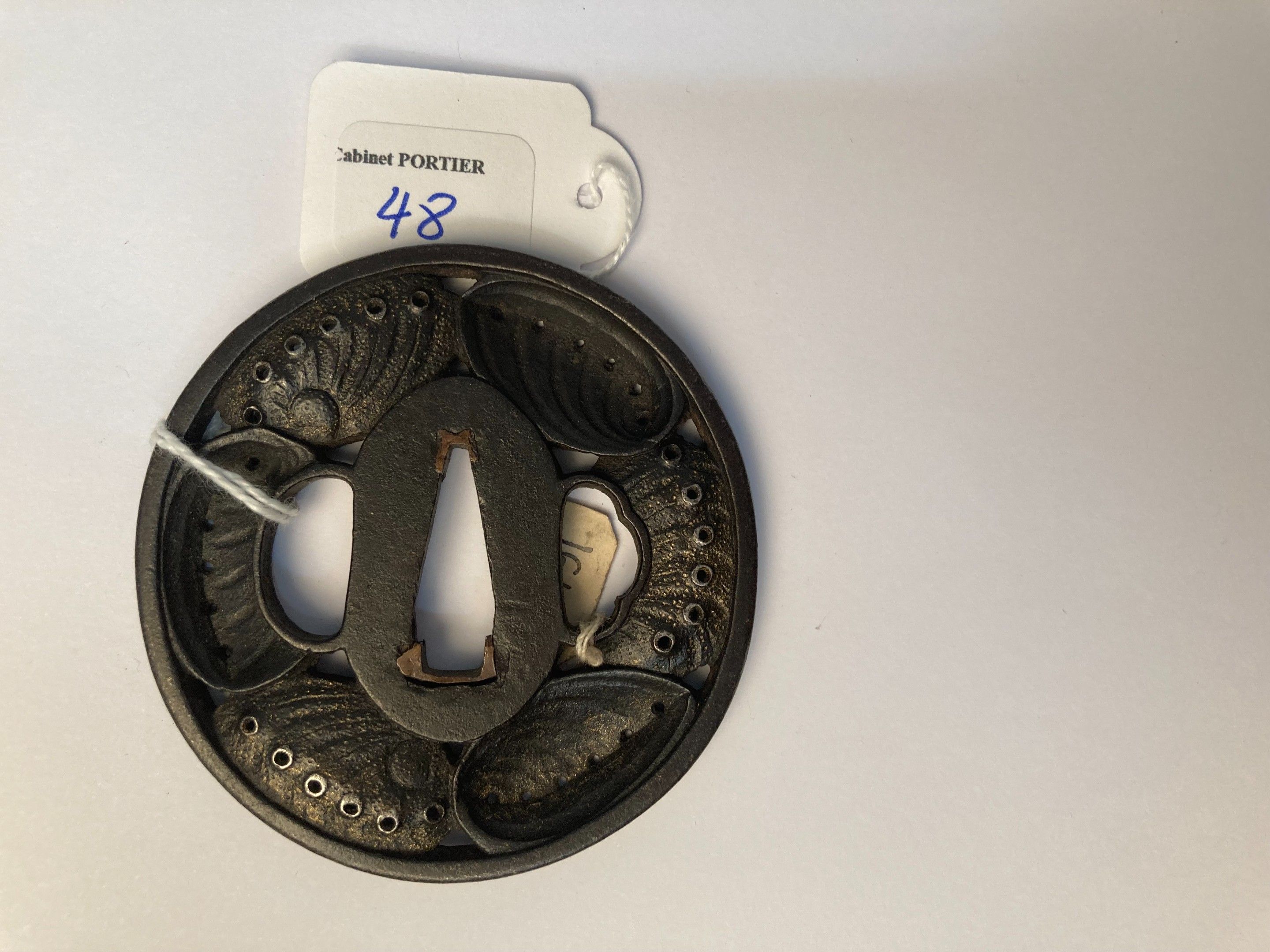 JAPAN, BUSHU SCHOOL - EDO period (1603 - 1868), 19th century, - An openwork iron maru gata in maru bori and traces of gilt copper inlays of six awabi. Unsigned. - H. 6,9 cm - - Expert : Cabinet Portier