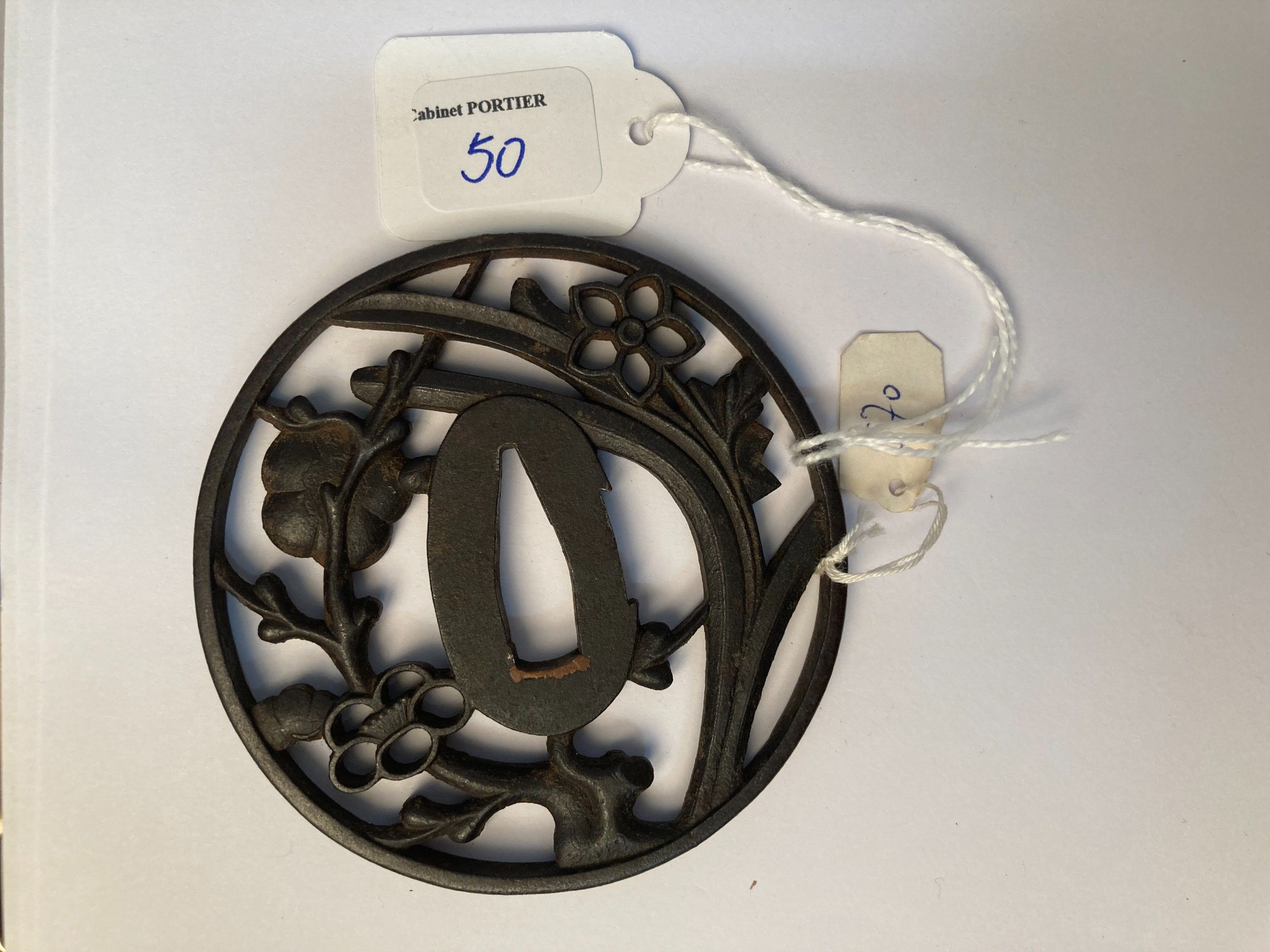JAPAN, CHOSHU - EDO period (1603 - 1868), 19th century, - An openwork iron maru gata in maru bori and yo sukashi of plum blossom branch and narcissus. Unsigned. - H. 7,8 cm - - Reference : A similar tsuba in the Ashmolean museum, Oxford, Accession no. EAX.10366. - Expert : Cabinet Portier