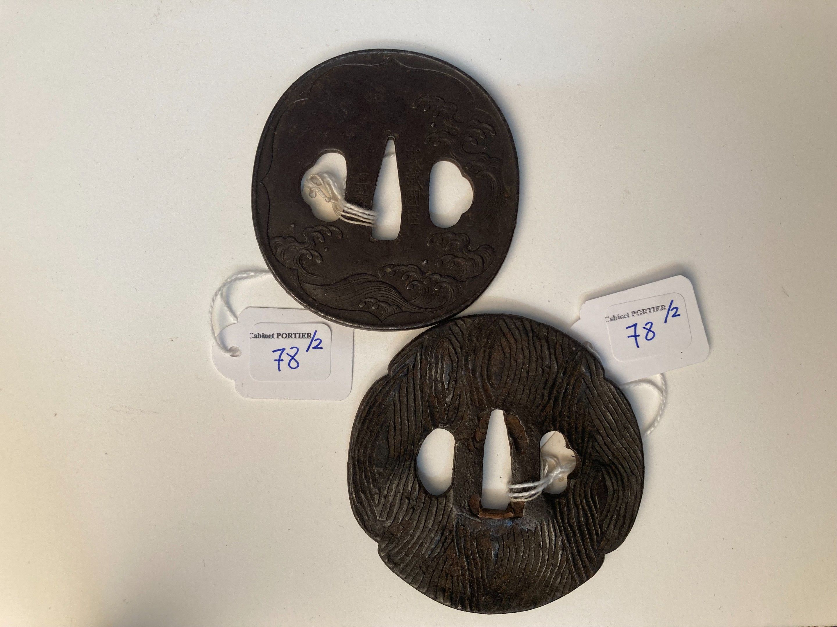 JAPAN - EDO period (1603 - 1868), 19th century, - Two iron tsuba : - - nagamaru gata chased in hira bori with foaming waves. Signed Masanobu. H. 7,7 cm - - mokko gata carved in hira bori with wood grain pattern. Unsigned. H. 8 cm - - Expert : Cabinet Portier