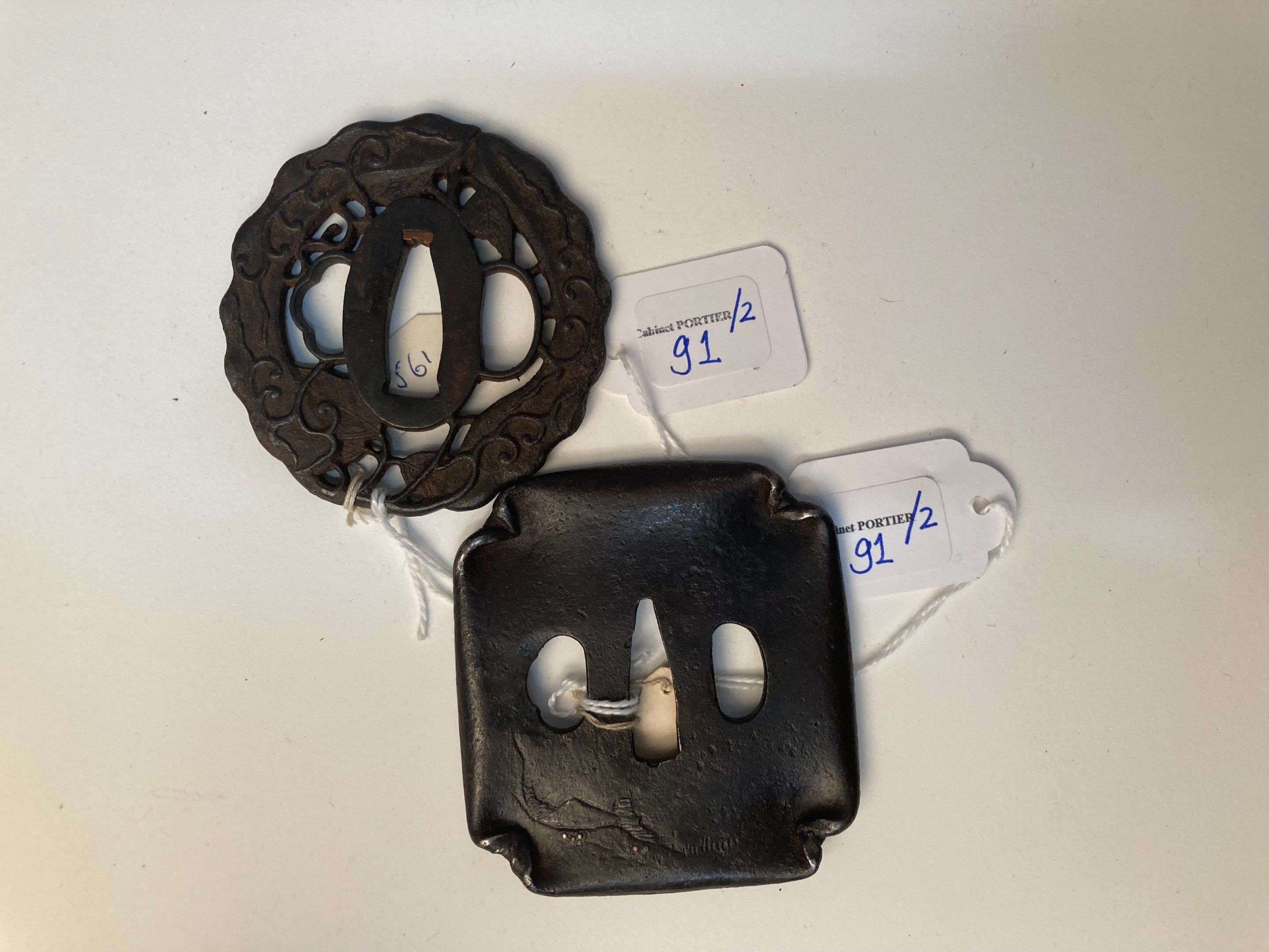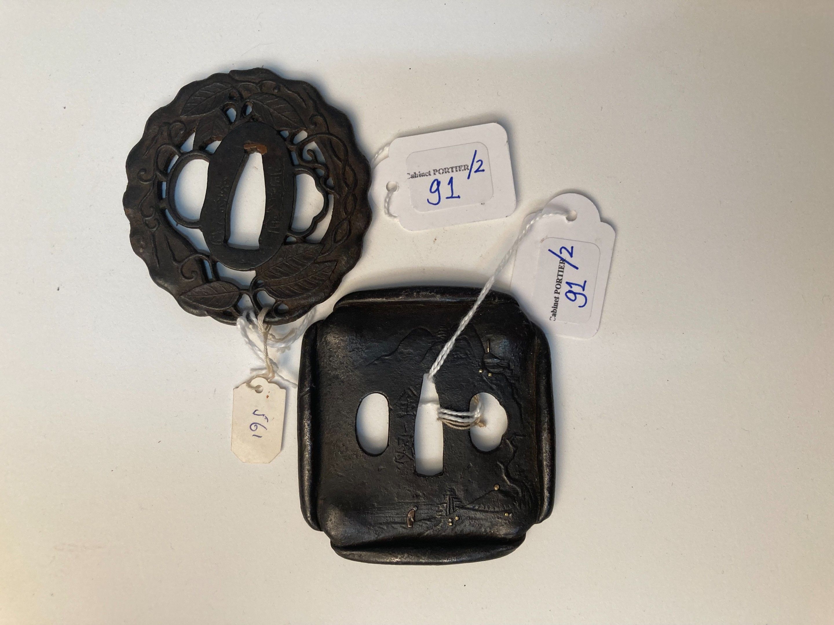 JAPAN - EDO period (1603 - 1868), 19th century, - Two iron tsuba : - - sumi iri kaku gata chased in hira bori and inlaid with copper and gilt copper of a mountainous landscape. Signed Kaneiye. Kanesada? H. 7,2 cm - - nagamaru gata carved in maru bori and hira bori with foliage. Signed Bushu ju Hidetada. H. 6,7 cm - - Expert : Cabinet Portier