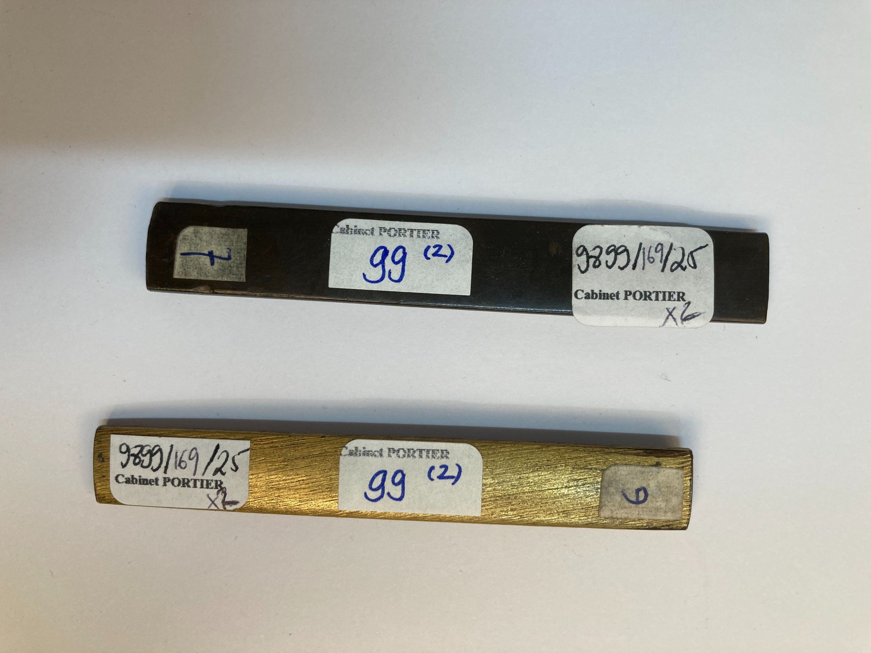 JAPAN - EDO period (1603 - 1868), 19th century, - Two shibuishi kozuka (kogatana handles) : - one decorated in hira bori with a crane and a golden minogame turtle on a nanako background. L. 9.2 cm - - the other decorated in hira bori with a man seated near a kettle hanging from a tree branch, on a nanako background. L. 9.6 cm - - Expert : Cabinet Portier