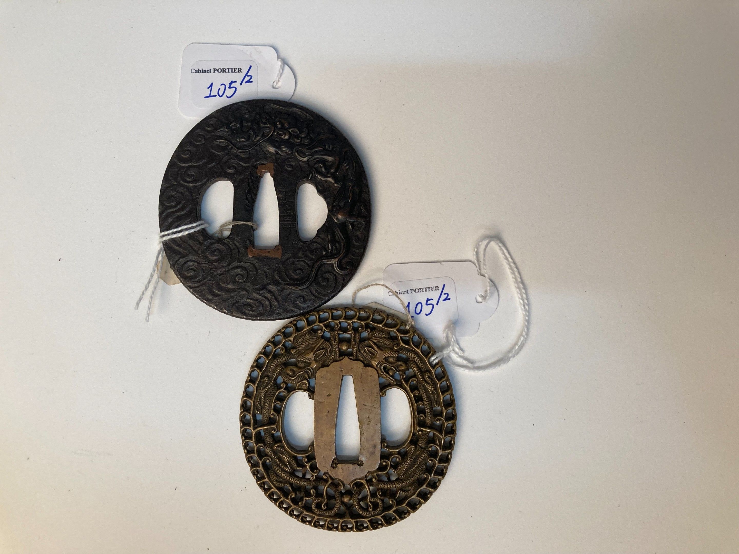 JAPAN - Late EDO period (1603 - 1868), - Set of two maru gata : - - in sentoku openwork in karakusa bori of two dragons facing each other. Unsigned. H. 7.1 cm Namban style. - Shibuichi taka zogan chased iron gata of a dragon in flight in the clouds. Signed Masatoshi. H. 7,2 cm - - Expert : Cabinet PORTIER -