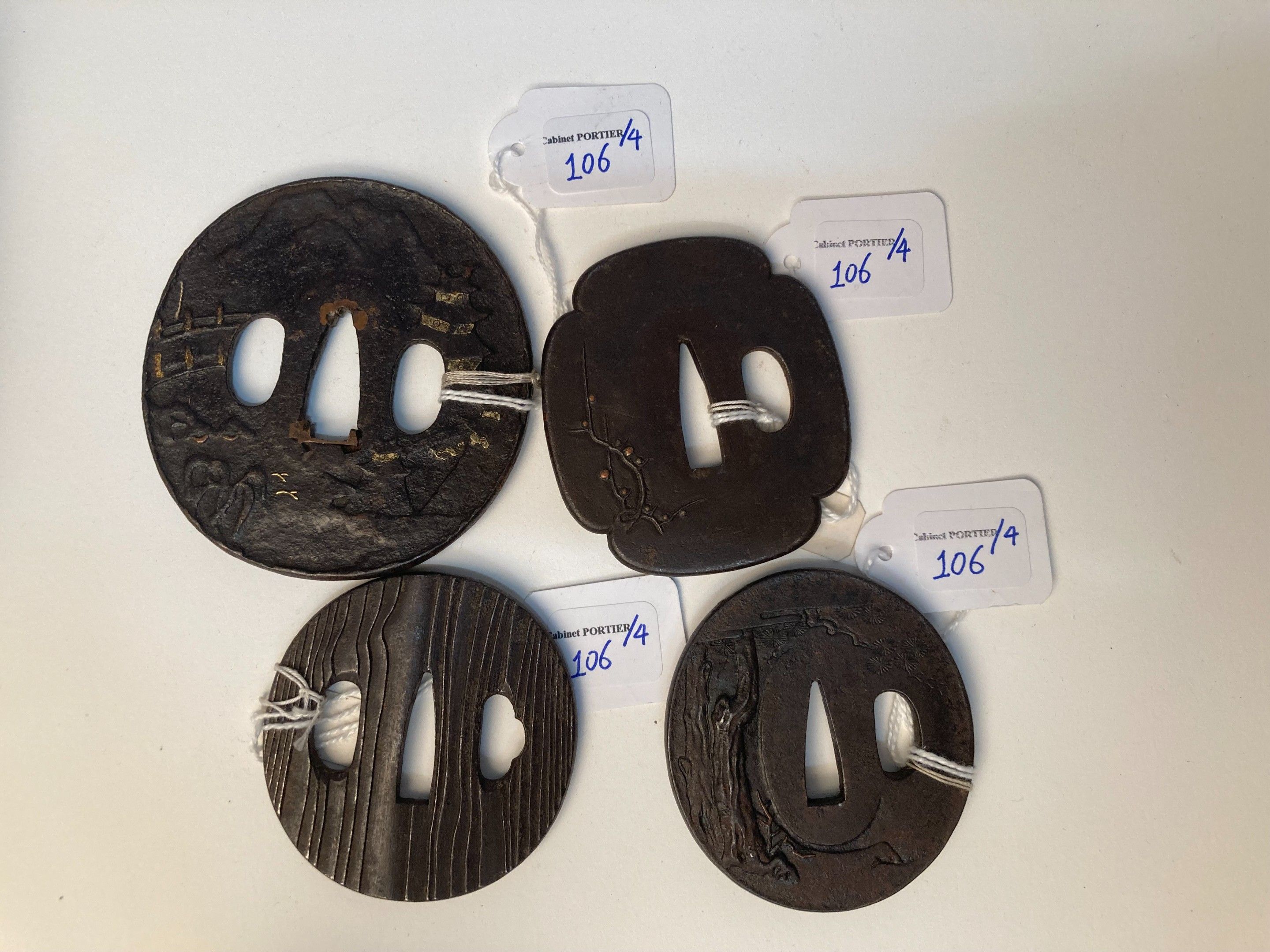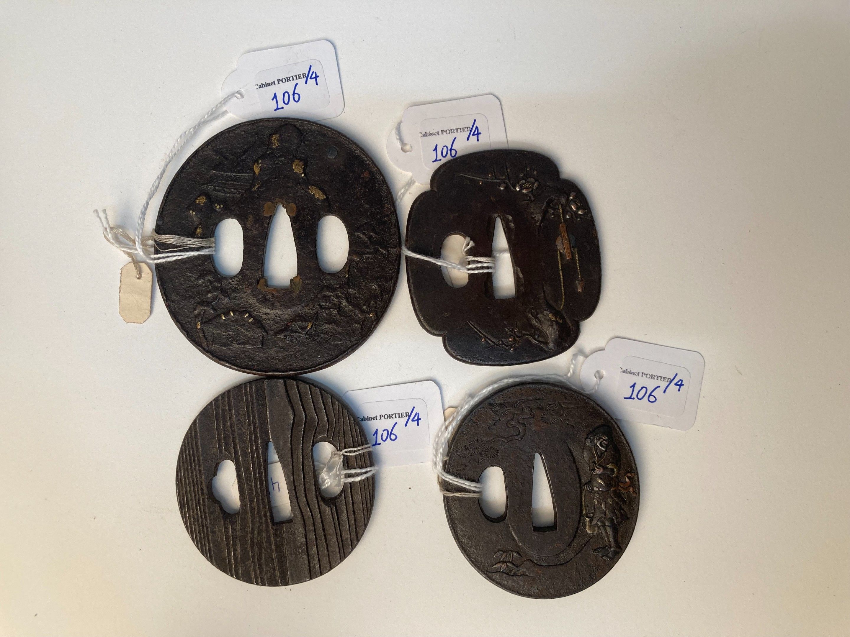 JAPAN - EDO period (1603 - 1868), - Set of four iron tsuba : - - Maru gata with chased mokume base. Unsigned. H. 6,3 cm - - Mokko gata chased in taka bori and hira zogan of a shibuichi pulley hanging from a plum tree in blossom. Unsigned. H. 6,8 cm - - Nademaru gata carved in hira bori and gilt copper nunome zogan of mountainous landscape, thatched cottages and castle. Unsigned. H. 8,1 cm - - Nademaru gata incised in katakiri bori and taka bori of Genkei holding a basket. Unsigned. H. 6,5 cm - - Expert : Cabinet PORTIER -