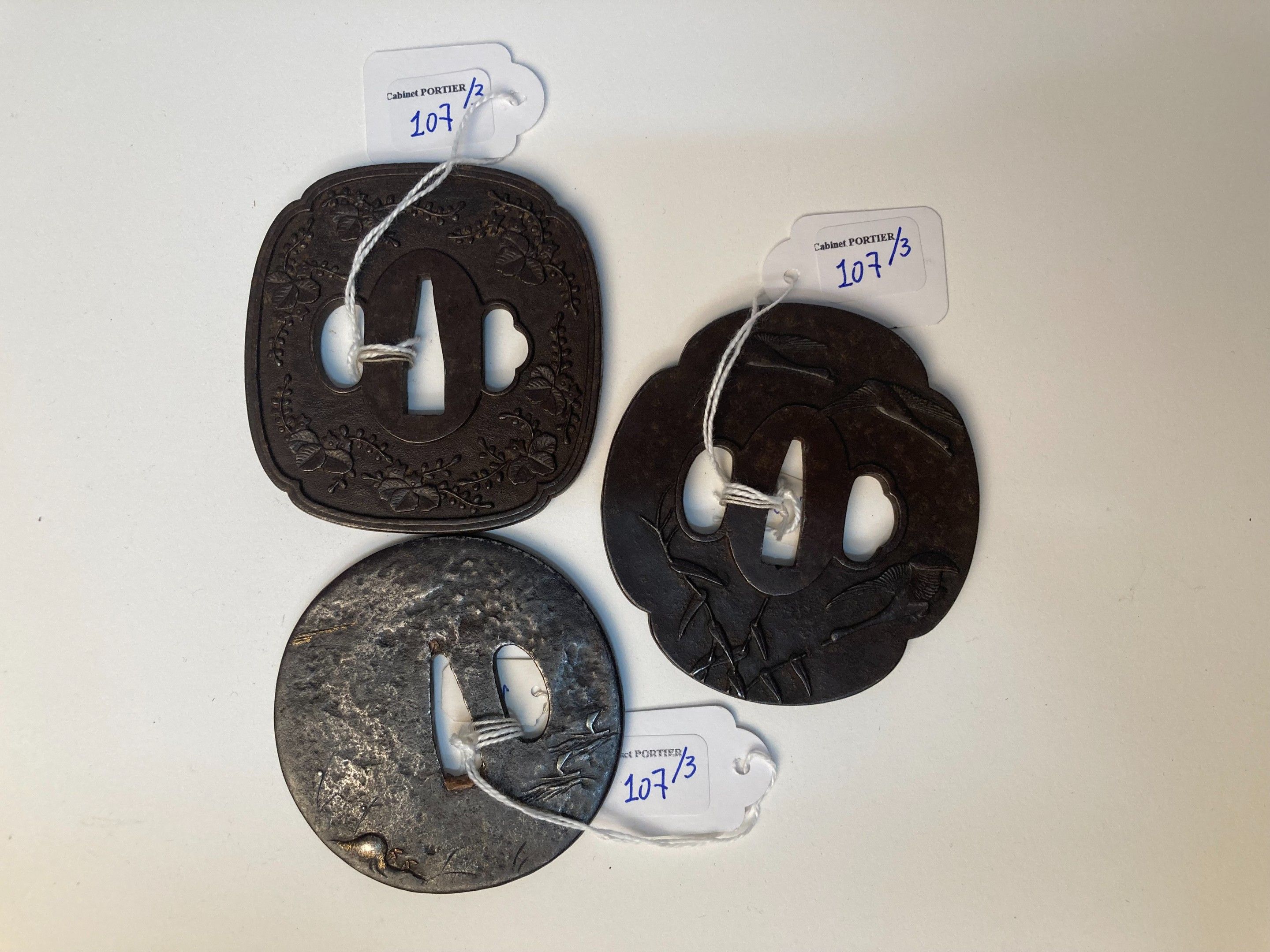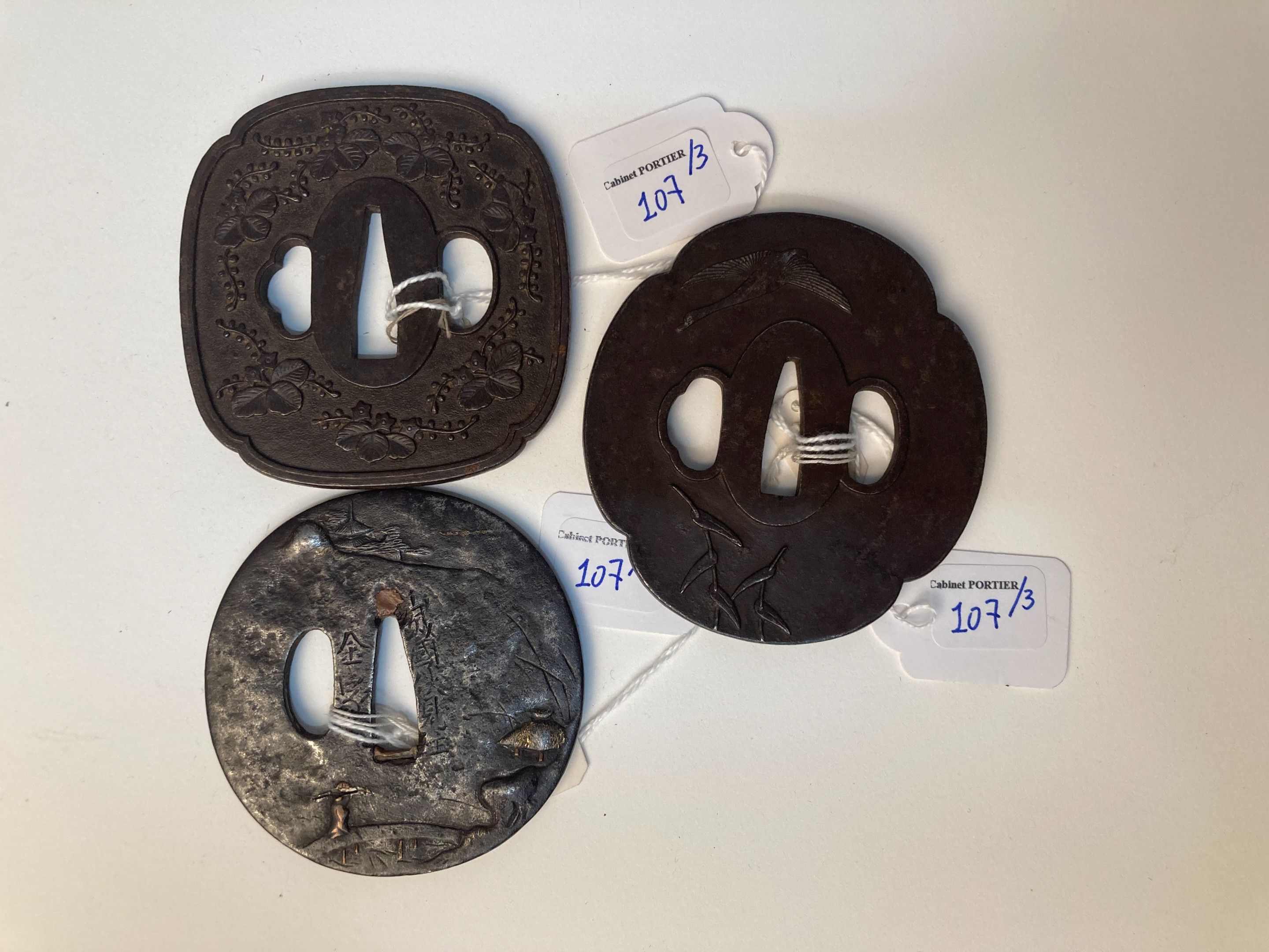 JAPAN - EDO period (1603 - 1868), 19th century, - Set of three iron tsuba : - - Mokko gata chased in hira bori with flying geese and reeds. Unsigned. H. 8,2 cm - - Sumi iri kaka gata carved in hira bori with paulownia leaves and flowers. Unsigned. H. 7,7 cm - - Maru gata carved in hira bori and inlaid with copper of a scholar crossing a bridge and a thatched cottage. Signed Yamashiro Kuni Fushimi ju Kaneiye (Depatinated) H. 7,2 cm - - Expert : Cabinet PORTIER -