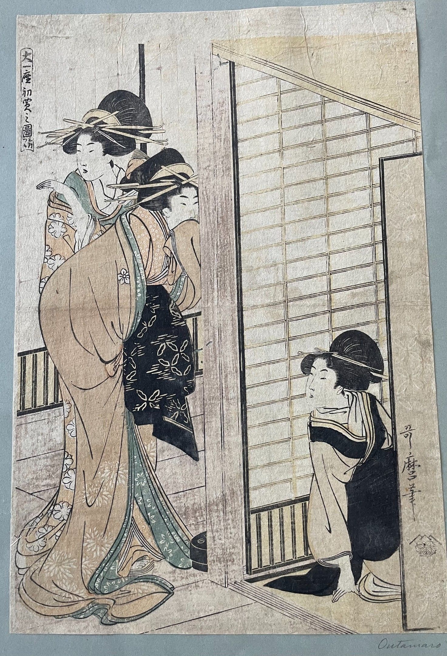 Kitagawa Utamaro (Japan, 1753?-1806), - Print, oban tate-e, two courtesans on a terrace, one holding her hand to her mouth, a third seated inside. Signed Utamaro hitsu, publisher tsutaya Juzaburo. - (wear, stains, worm hole) - 34,2 x 22,7 cm - - Provenance: Collection of Jean-François Raffaëlli then by descent - - Expert: Cabinet Portier -