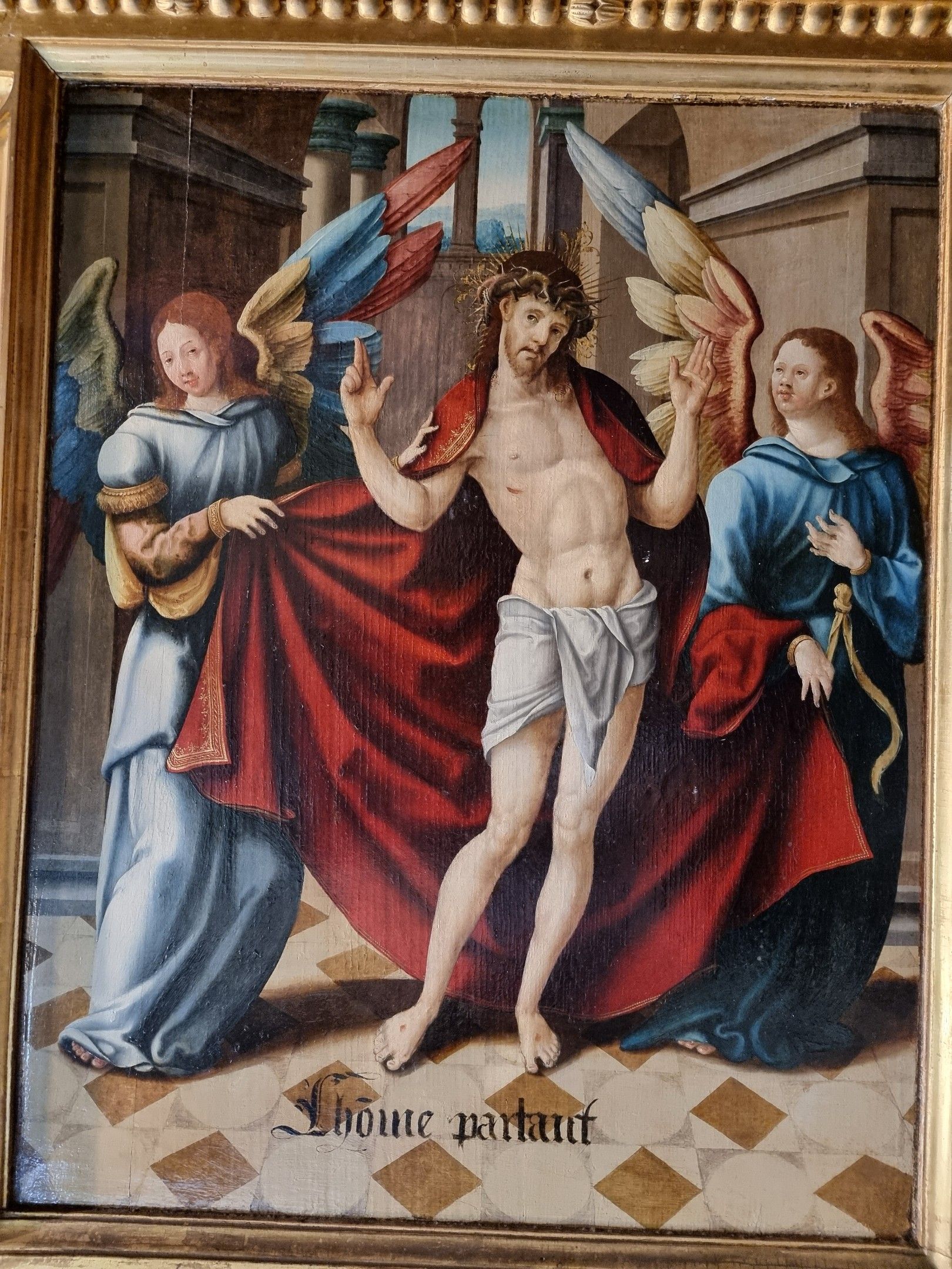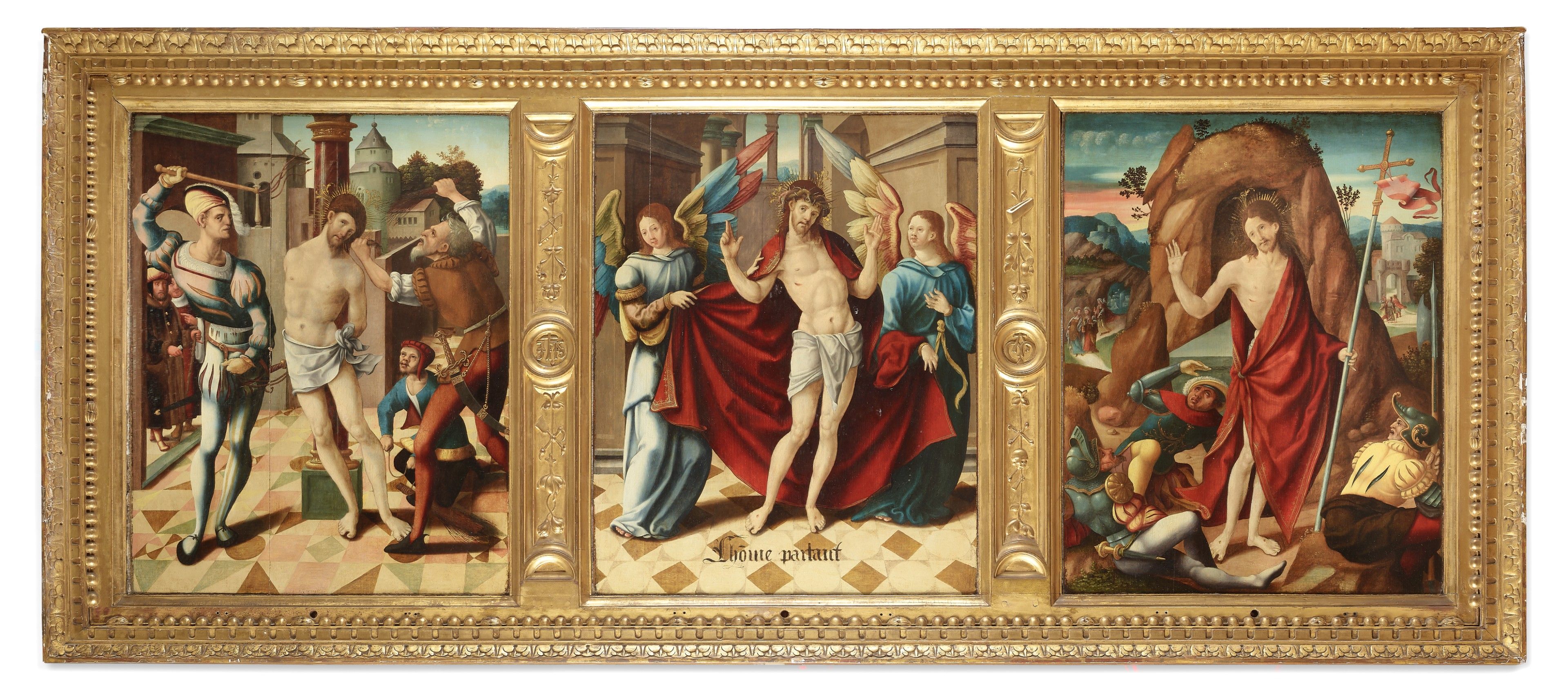 TROYAN SCHOOL circa 1520 - Triptych with La Flagellation, Le Christ aux anges, La Résurrection - Three oak panels, three boards, not parqueted, in a single mount - 63.5 x 50 cm each - 83.5 x 193 cm overall - Inscribed at bottom centre of central panel L'hôme partant - Wax stamp on reverse J.A - Crack in the panel - - Provenance: - Saint-Etienne church in Troyes (according to the 1864 exhibition) - - Julien Gréau collection - - H. Gréau collection in 1939 - - Gréau sale, Paris, Hôtel Drouot (Mes Walther et Ader), 25 February 1939, no. 27, reproduced (like the Bernard van Orley school, is thought to have come from Troyes and to have formed the altarpiece known as the Jacobins). - Exhibition: - Objets d'art anciens et œuvres de peinture, de dessin, de sculpture, exposés à l'Evêché et au musée de Troyes, Troyes, musée, 1864, no. 306. - Bibliography: - Catalogue des objets d'art anciens et des œuvres de peinture, de dessin, de sculpture, exposés à l'Evêché et au Musée, Troyes, 1864, n°306 (L'homme parfait). - Troyes painting is a school in its own right, closely linked both to the dynasties of local painters - among whom the Cordonnier family occupies a prominent place - and to the art of stained glass, which flourished in Troyes during the Renaissance. The first third of the 16th century was marked by the work of two now-identified masters: the Master of Clairvaux and the Master of the Legend of the Santa Casa. Their work was characterised by an original reinterpretation of Flemish and Dutch models, adapted to the tastes and clients of the Champagne region. - Our painting belongs to this period - its style, close to that of Grégoire Guérard and the Master of Clairvaux, is in keeping with a Trojan production influenced by Nordic models. The Master of Clairvaux was inspired by painters such as Gérard David and Jan Joest. - Several figures in our triptych can be compared with works by Grégoire Guérard, such as the Resurrection in a private collection (see F. Elsig, Grégoire Guérard, Milan, 2017, reproduced fig.101), or the Assumption of the Virgin in the Musée de Vauluisant in Troyes (see opus quoted above, reproduced pl. 11). - Furthermore, the slender morphology of the figures and the meticulous treatment of the decorative elements - in particular the rock at the centre of The Resurrection - are in keeping with an aesthetic close to that of the Master of Saint-Rémy, of which the Ascension in the church of Saint-Rémy in Troyes is a particularly significant example (see Peindre à Troyes au XVIe siècle, edited by F. Elsig, Milan, 2015, reproduced in fig. 140). The Gothic inscription and the soldiers' clothing support the idea of a date of around 1520-1530: sleeves with slits were very common in Western Europe at this time, under Germanic influence. This influence can be explained by the prolonged Germanic presence in Troyes thanks to the Champagne fairs, which welcomed foreign, mainly German, merchants. - The triptych was probably an Antependium (altar frontal) that adorned the altar of the church of Saint-Etienne in Troyes, according to the 1864 exhibition at the Musée de Troyes. At this exhibition, most of the loans came from the same collection: that of Julien Gréau. It was described on this occasion by Alfred Darcel: "This collection is almost a museum, as all branches and periods of art are represented in it, from the Egyptians to the present day [...] the paintings range from fragments torn from the walls of Pompeii to works from the 18th century" (see A. Darcel, "Troyes et ses expositions d'art", in Gazette des Beaux-Arts, n°17, 1864 p. 338). - Born in Troyes in 1810 to a wealthy Champagne family, Julien Gréau was an industrialist but above all a great collector and enthusiast of Antiquity and the art of the Middle Ages. He built up several collections over the course of his life, dispersing each one to focus on a new area of interest. The most important part of his collection concerned antique glassware, enamelware and pottery, comprising five thousand pieces. His Greek, Gallic and French medals were sold in 1867, followed by his Roman medals in 1869, his antique bronzes in 1885, and finally his Greek terracottas in 1891 (the latter bought in large numbers by the Louvre). - - Expert: René MILLET (visible at the expert's home by appointment)