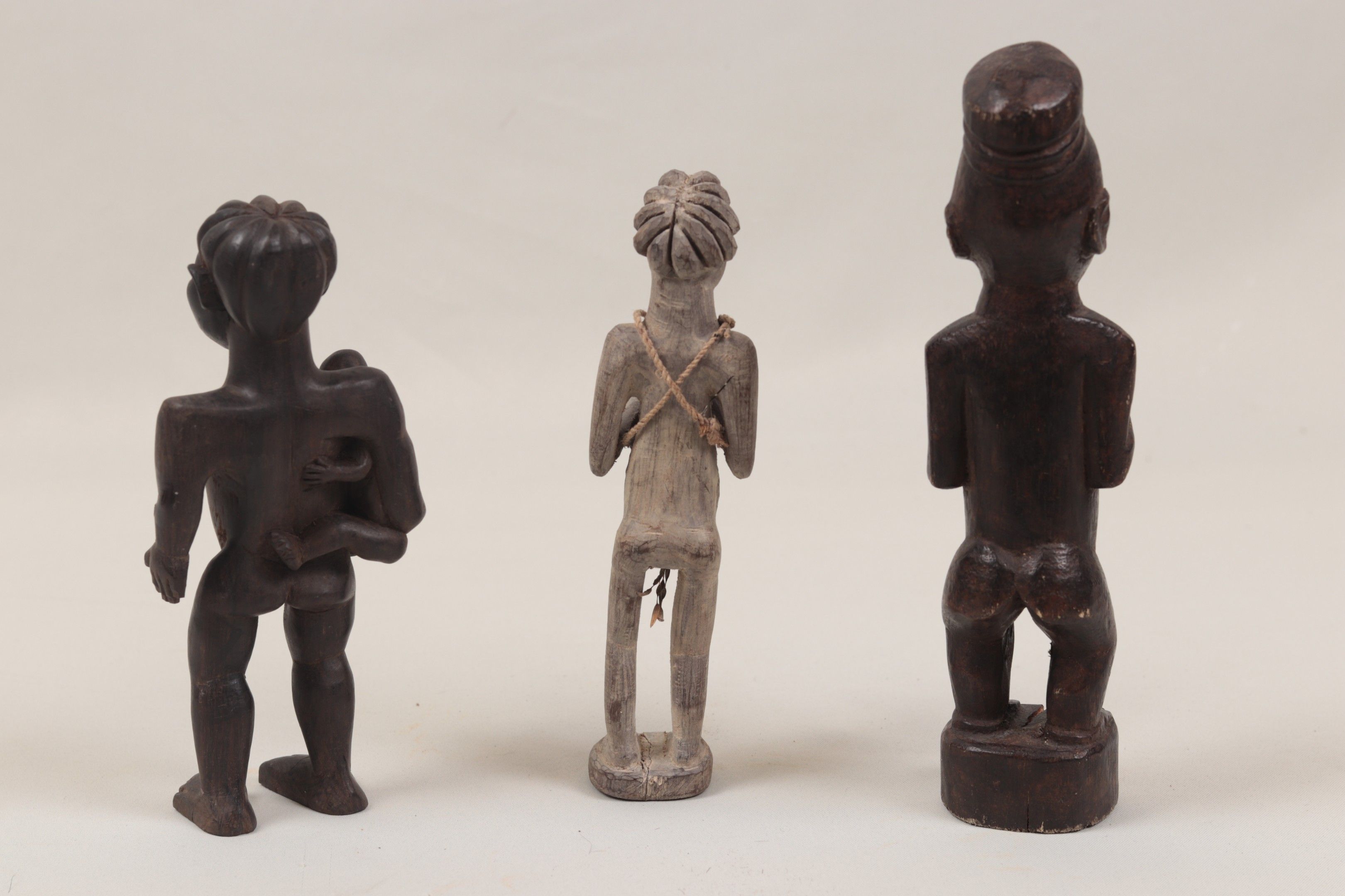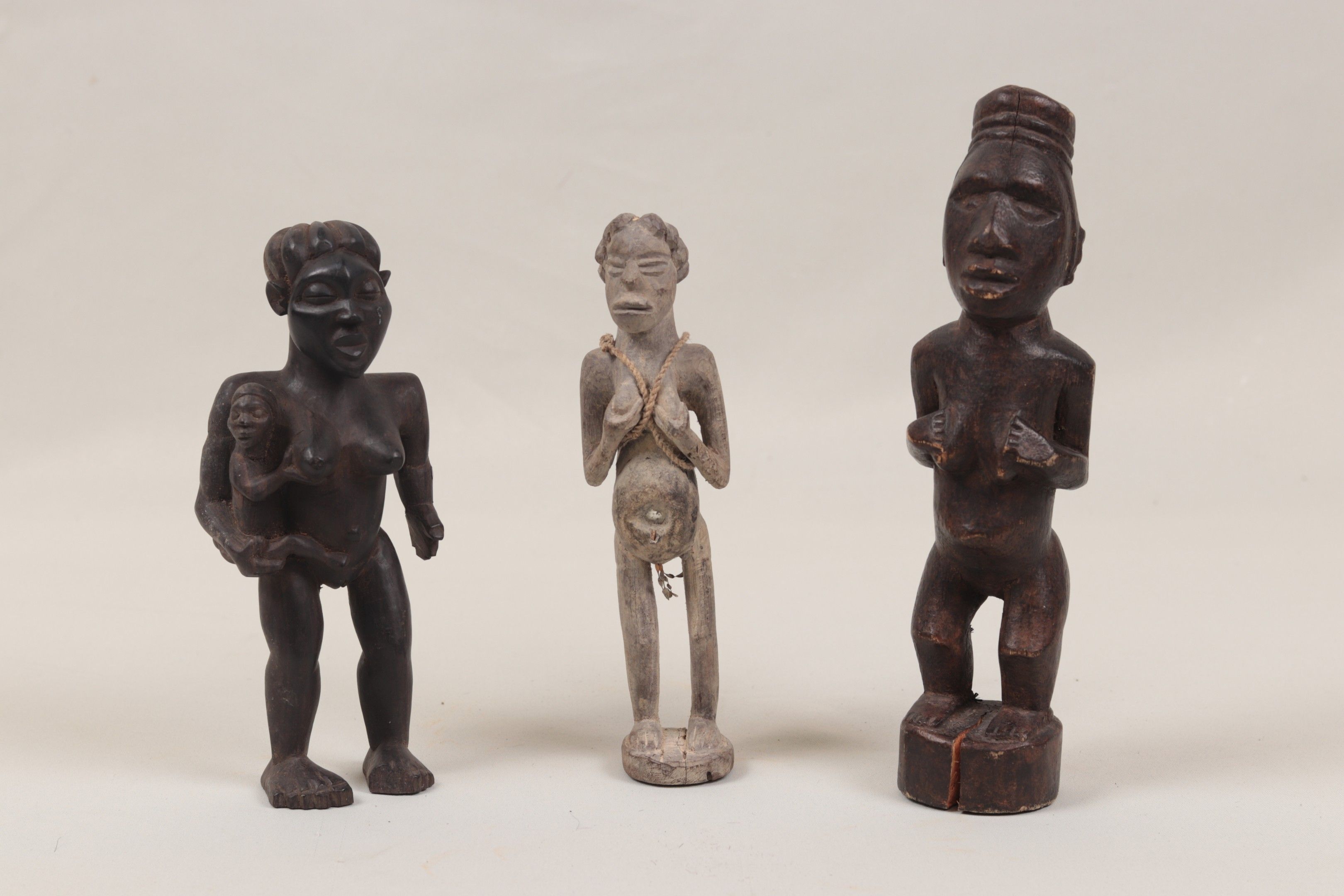 Yombe (Republic of Congo), three female statuettes, one with its magic charge, wood, - 20 x 24 x 20 cm. - (collected in 1969 in the Mayombe). - Provenance: Former collection of Mr and Mrs FREUDENREICH, collected between 1969 and 1970 - - Consultant: Mr Jacques BEAUFFET