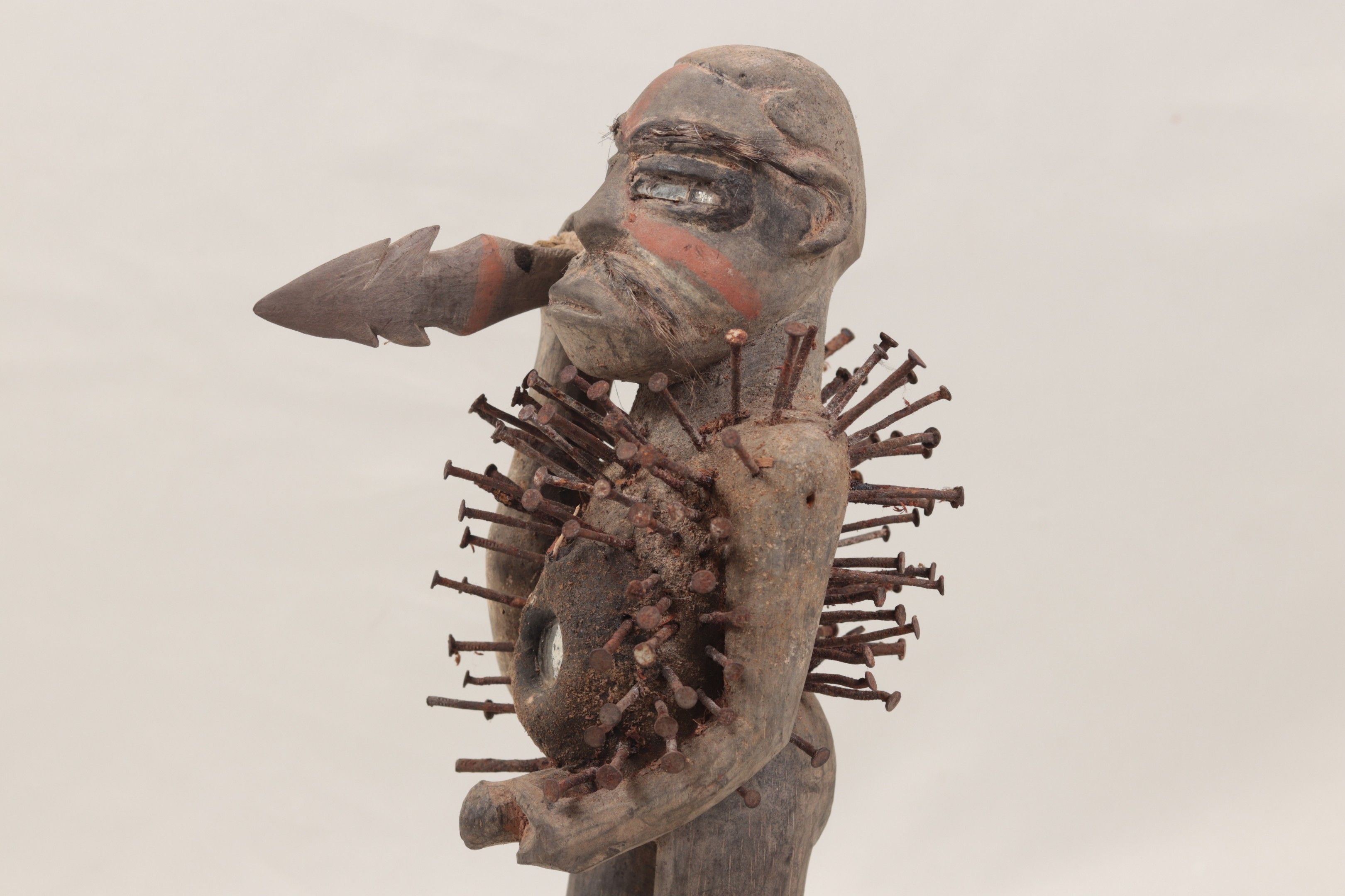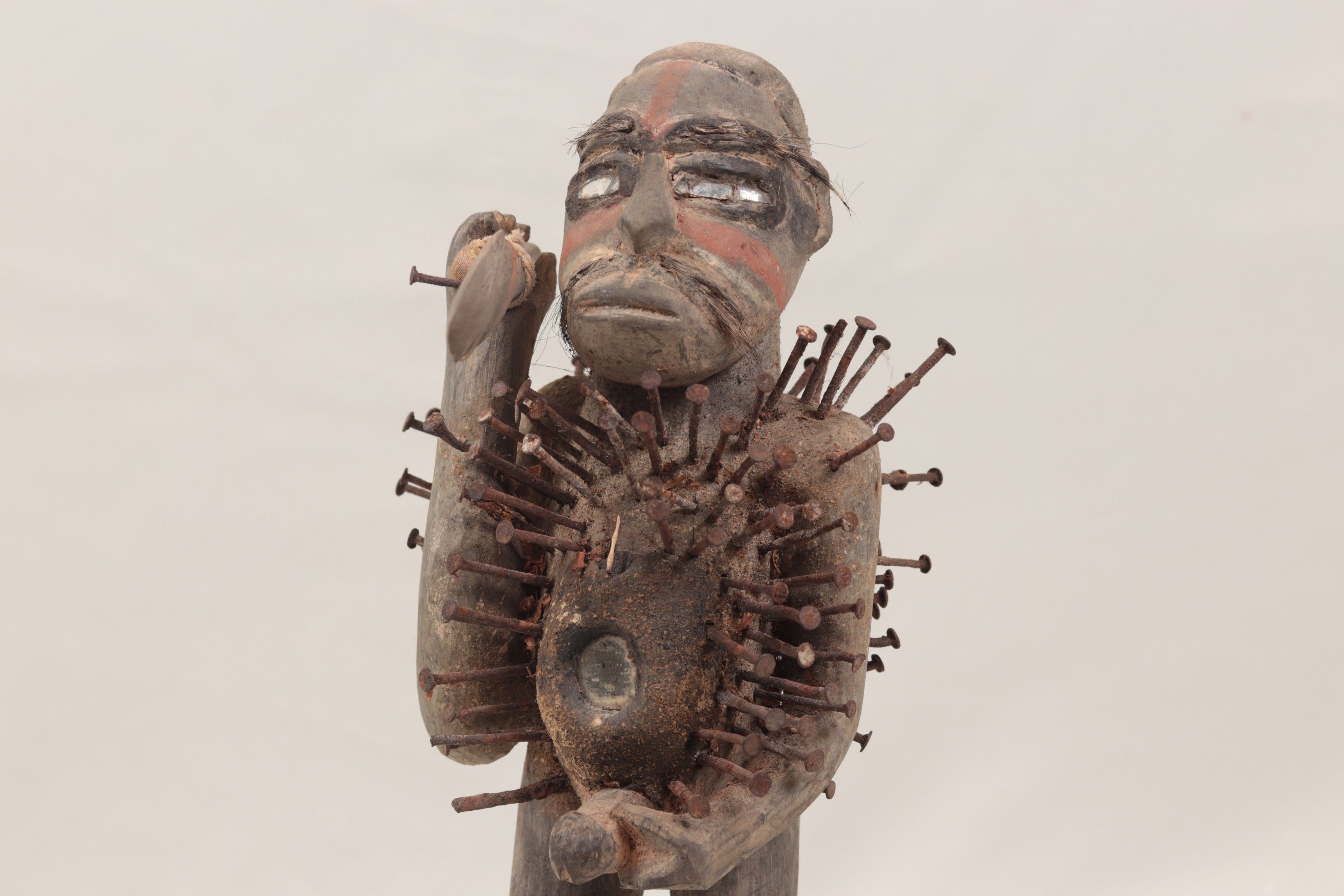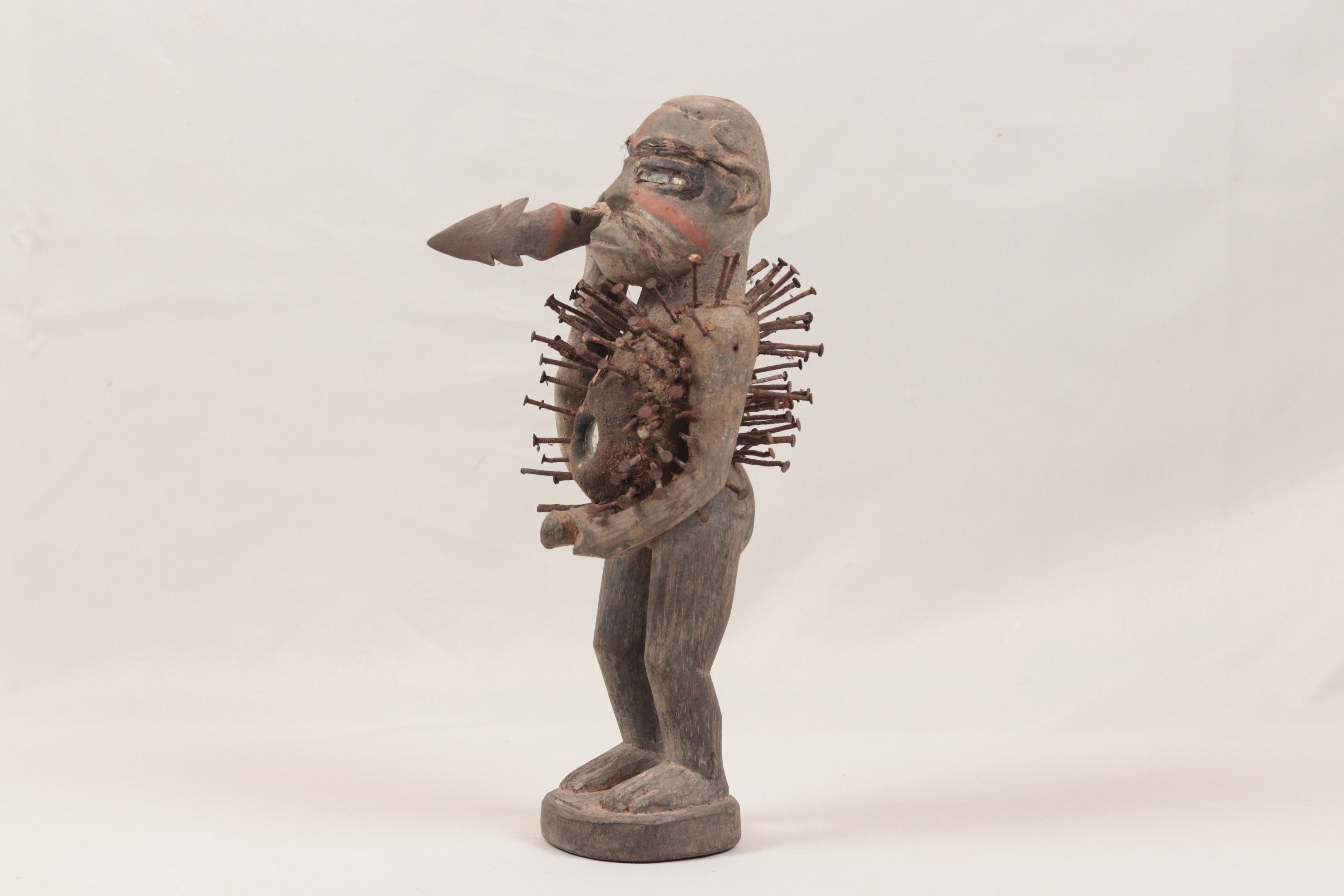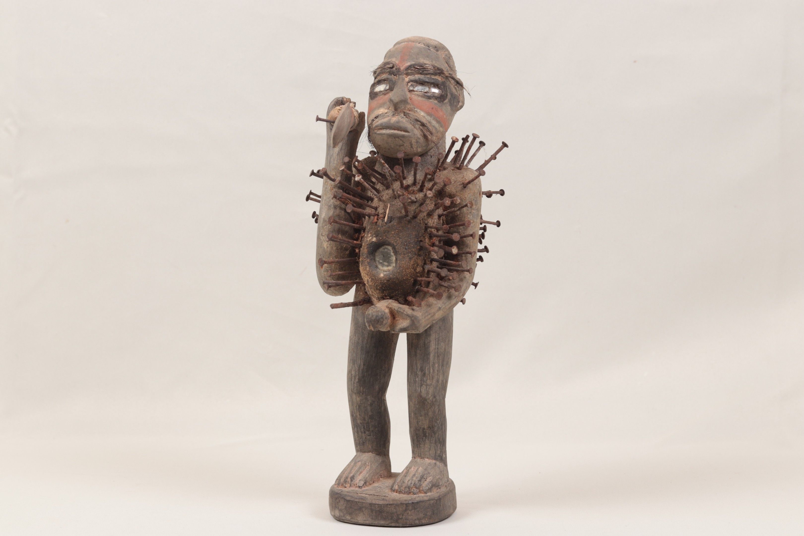 Yombe (Republic of Congo), male statuette with spear, "Nkisi", wood, nails, hair, magic charge, grey and ochre colours, - H. 37 cm. - (collected in 1969 in the Mayombe) - - Provenance: Former collection of Mr and Mrs FREUDENREICH, collected between 1969 and 1970 - - Consultant : Mr Jacques BEAUFFET