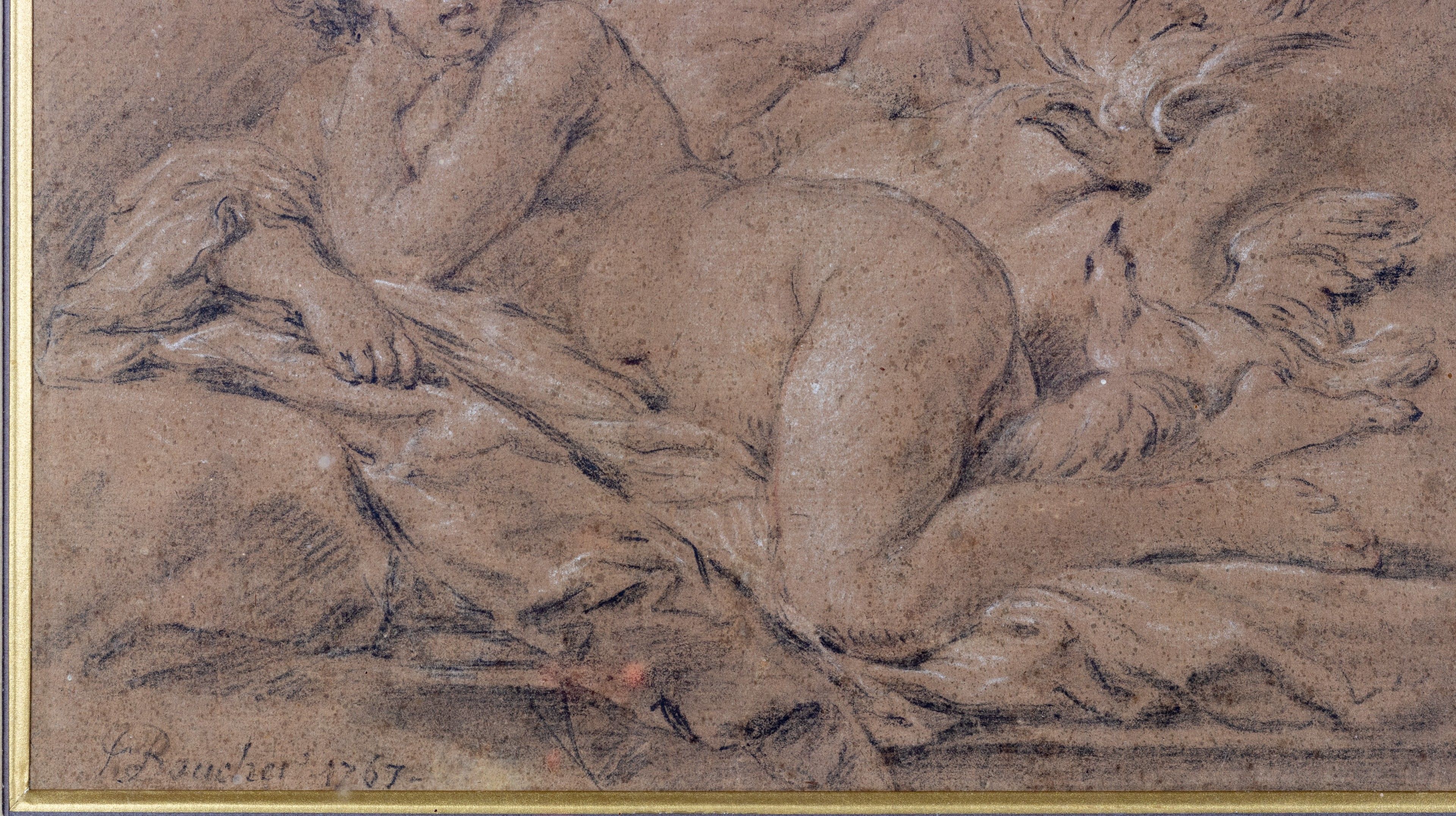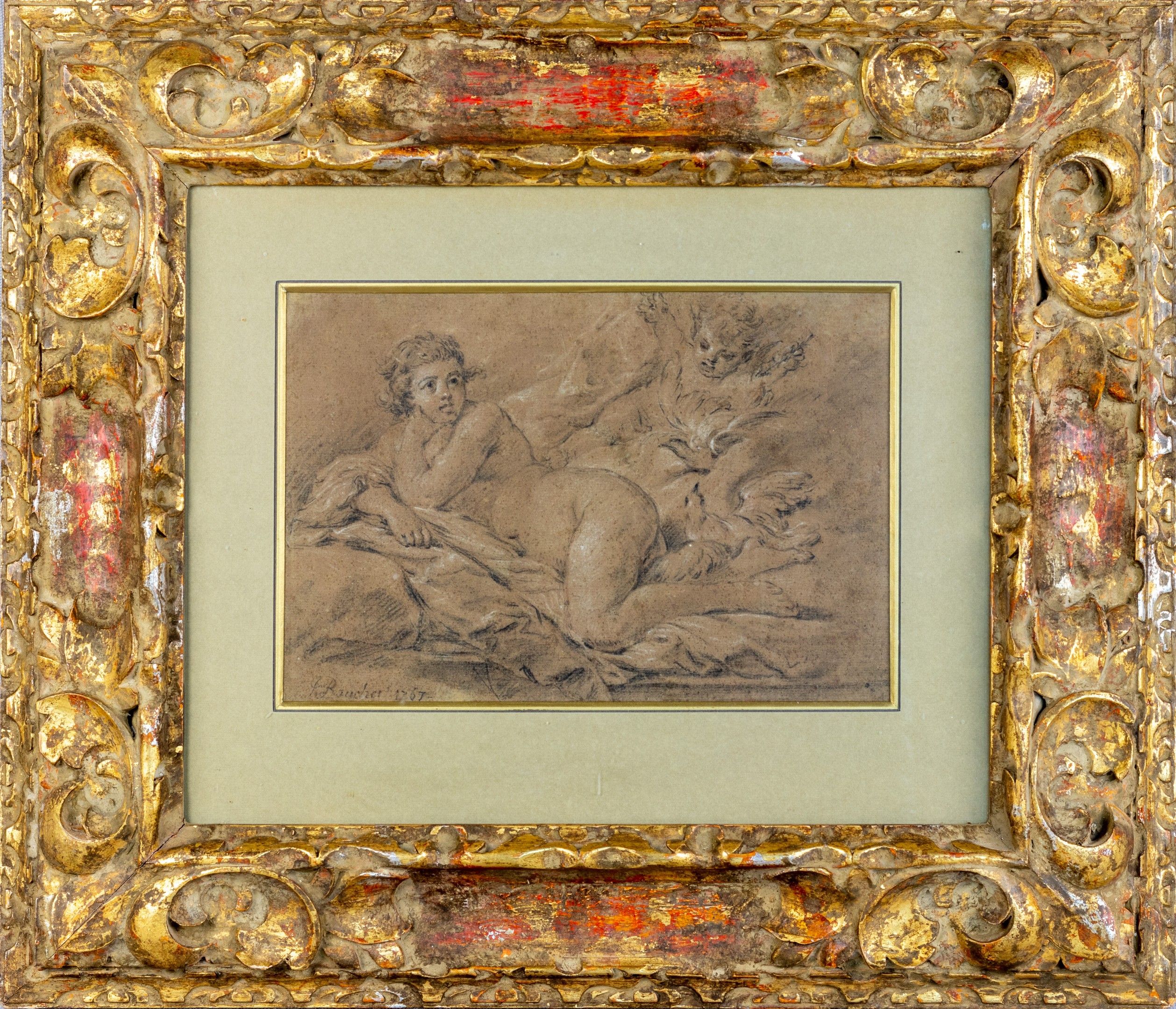 18th century FRENCH SCHOOL, follower of François BOUCHER, - Naiad with a dove, - black stone and white highlights, - 20,5 x 30 cm - Bears lower left an inscription F. Boucher 1767 - - Provenance: Anonymous sale, London, Phillips, May 1992 - - With André Panderis, Paris, in 1996 - Acquired on this date by the current owner. - Our drawing is a repetition with slight variations of the drawing dated 1767 (see A. Ananoff, Francois Boucher, t. I, Paris - Geneva, 1976, n° 124, reproduced fig. 450). - Expert: René MILLET