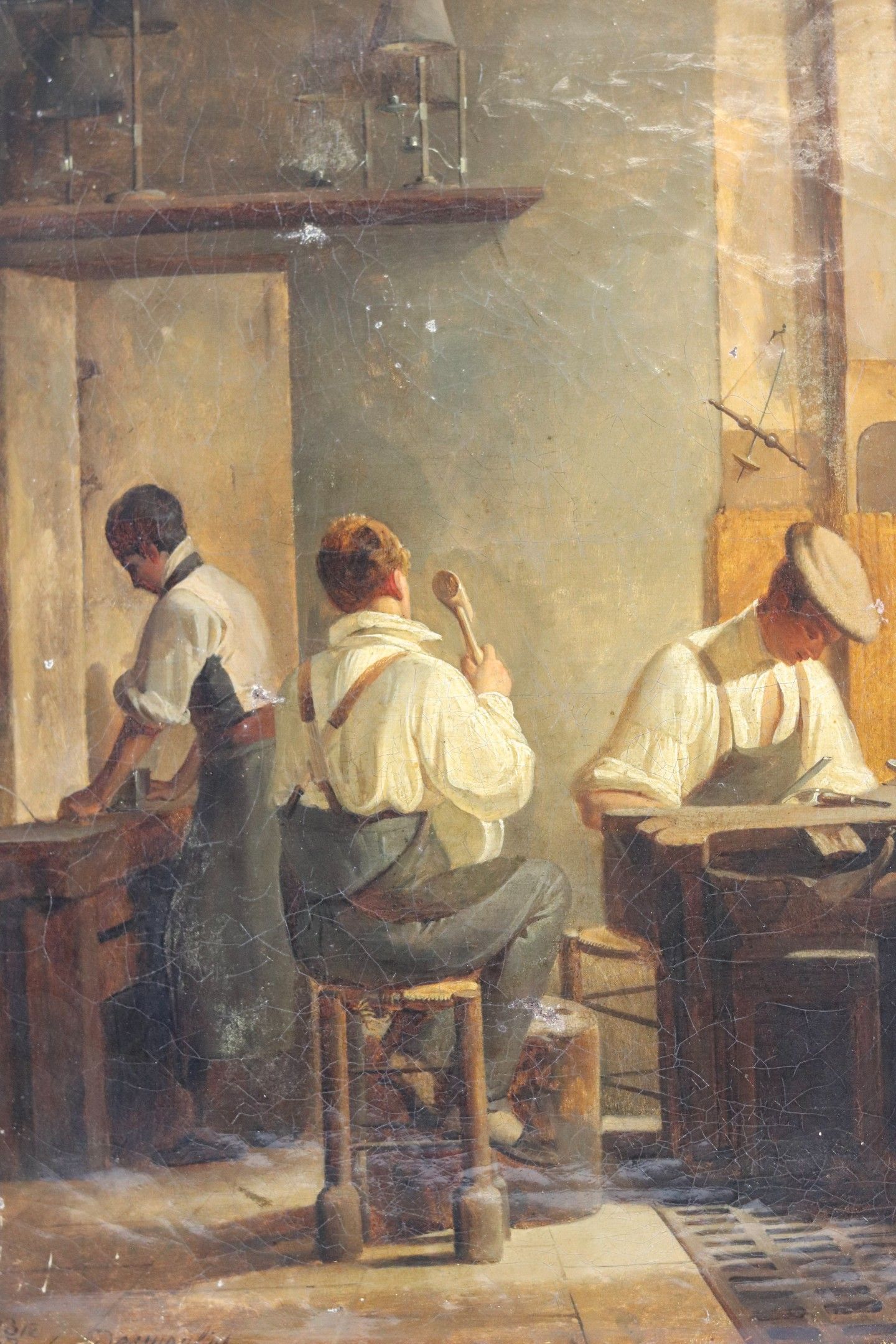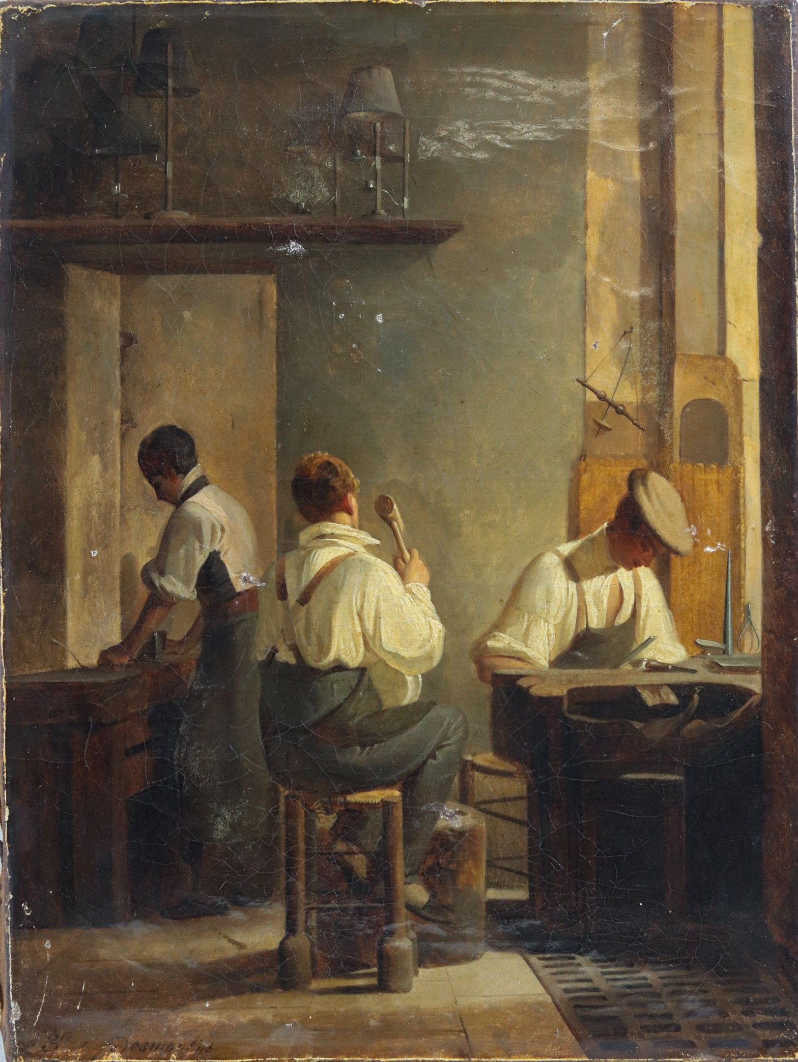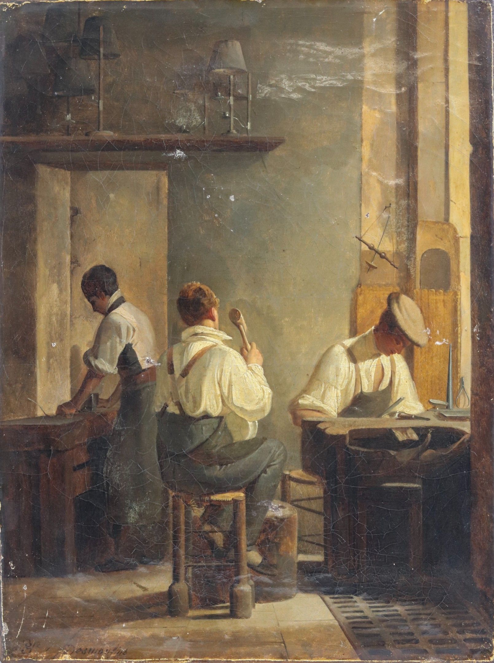 François Barthélémy Augustin DESMOULINS (Paris 1788 - 1856), Vers 1822, - l'atelier de l'Orfèvre Odiot (1763-1850), rue Saint-Honoré, - oil on canvas signed lower left - 32,5 x 24,5 cm - (paint chips, small accidents, oil on paper pasted on canvas?) - - Related work: - - L'atelier de l'orfèvre Odiot, 1822, Paris, musée Carnavalet. - François Barthélémy Auguste DESMOULINS (Paris 1788 - 1856), vue intérieure des ateliers d'orfèvrerie de Monsieur Odiot, 1822, Exposition - Salon de Paris de 1822, n°354. Sale Garden Party, Rouillac, - 8 June 2008, lot 586 - - Expert : René MILLET