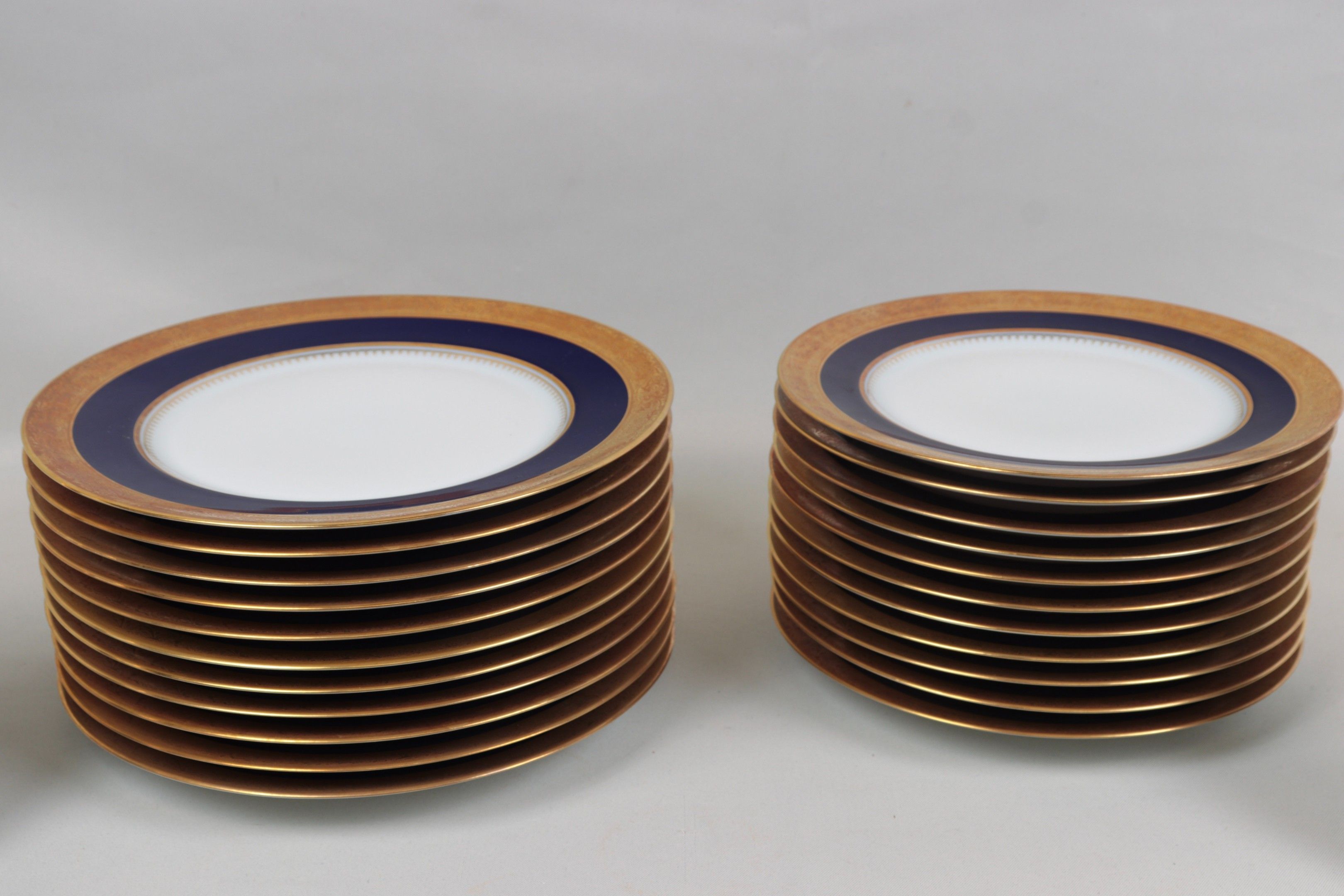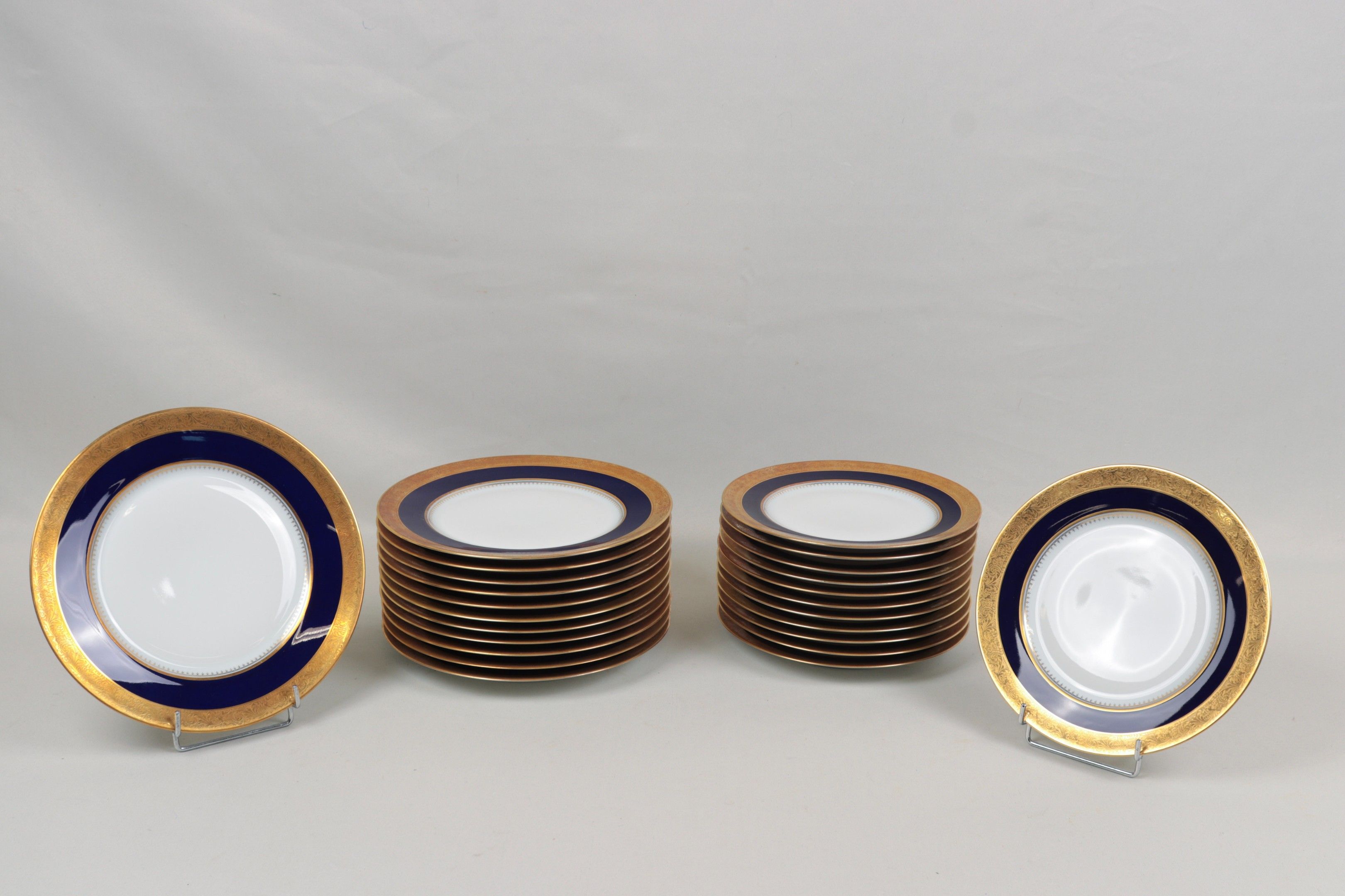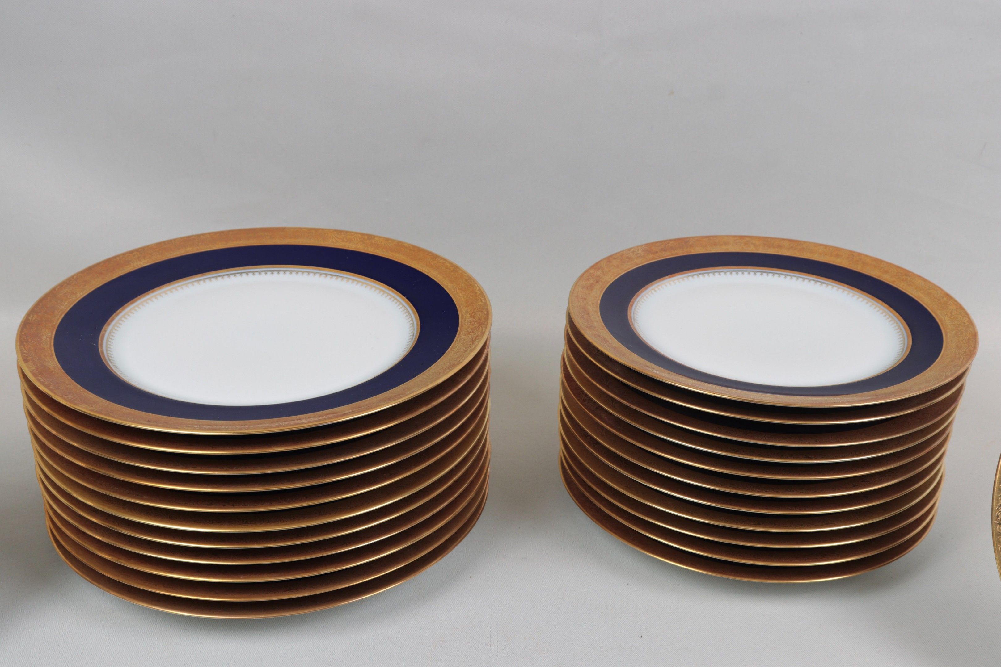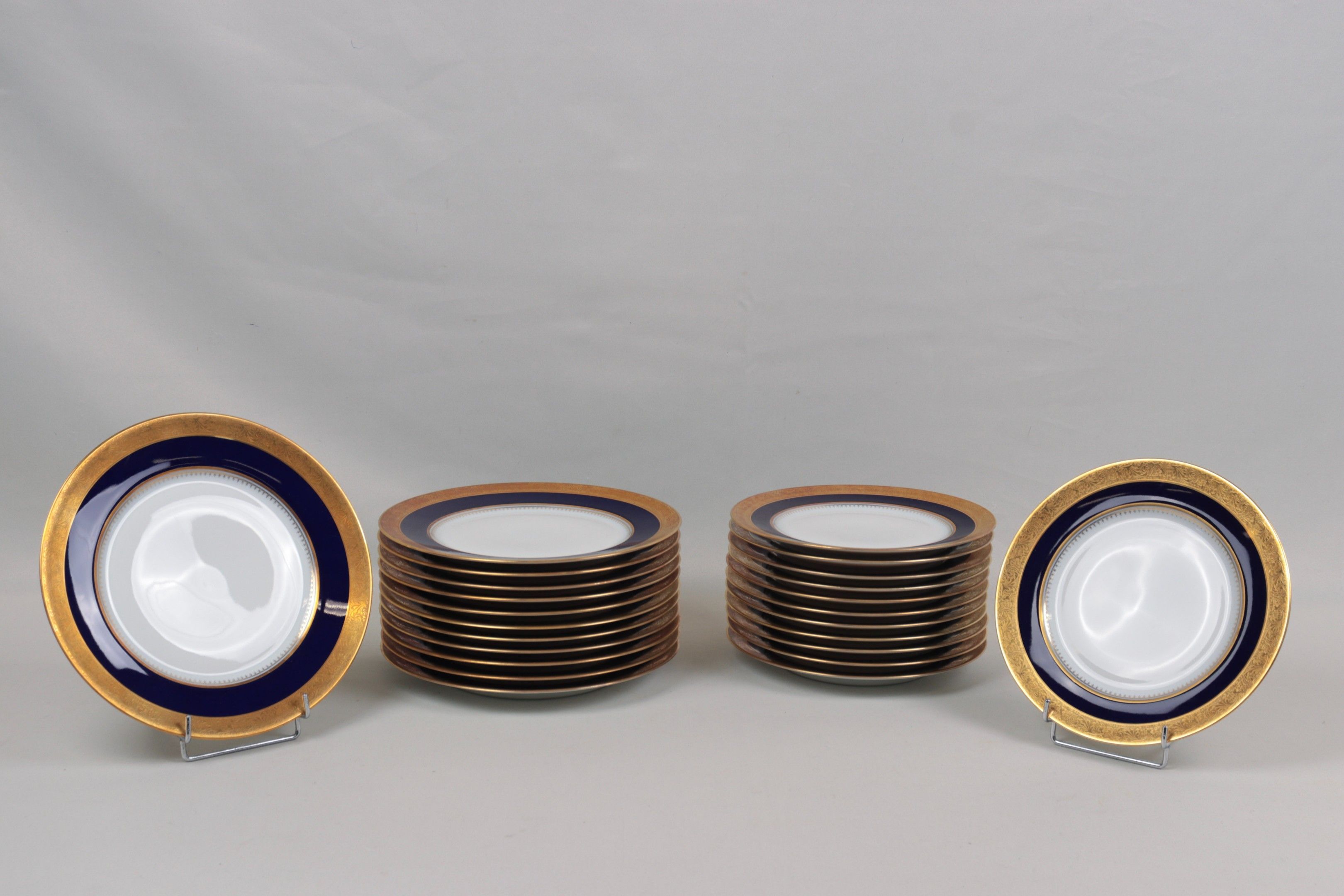 Manufacture JAMMET SEIGNOLLES in Limoges, blue porcelain service with double gilded foliate decoration comprising 12 dessert plates and 12 dinner plates