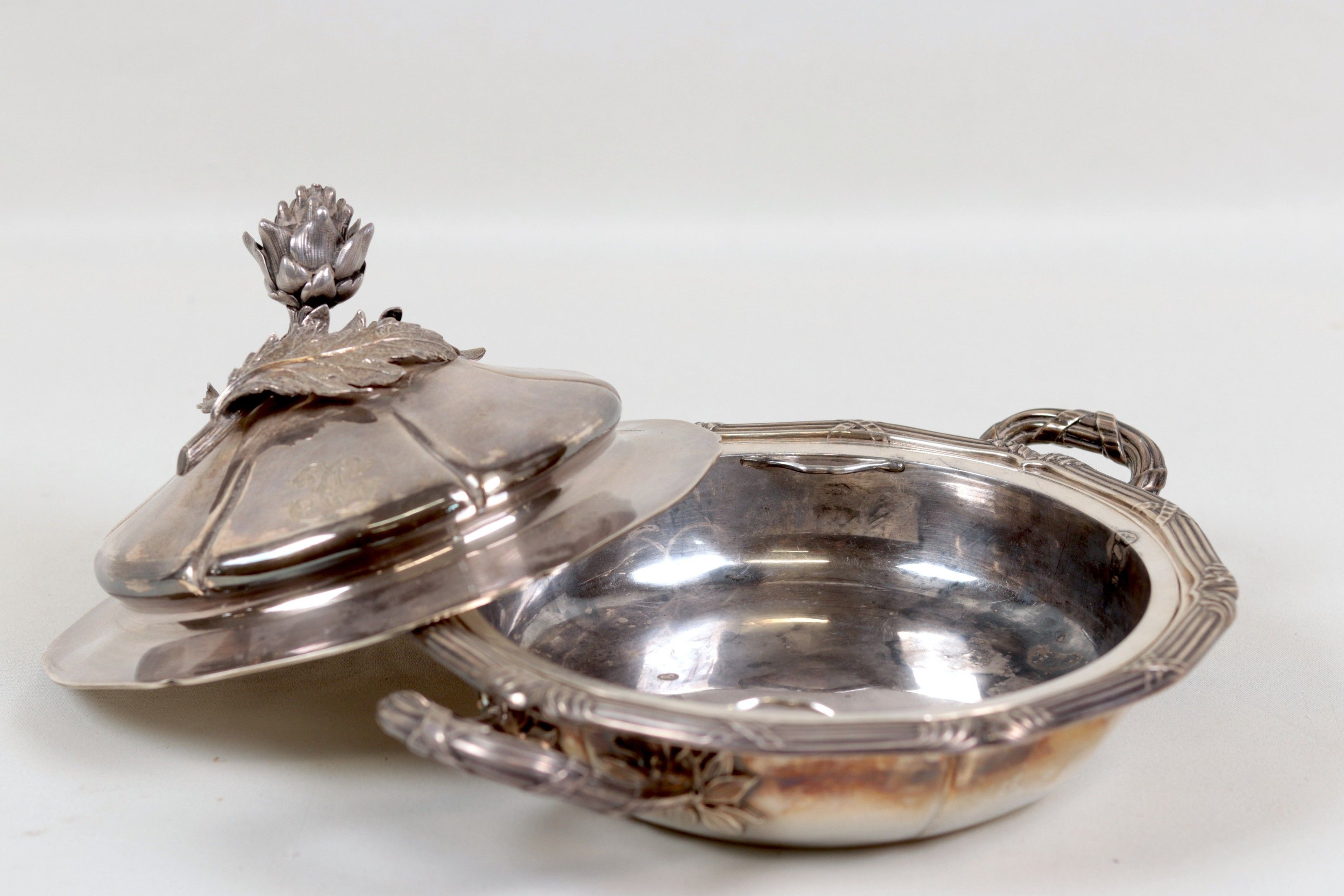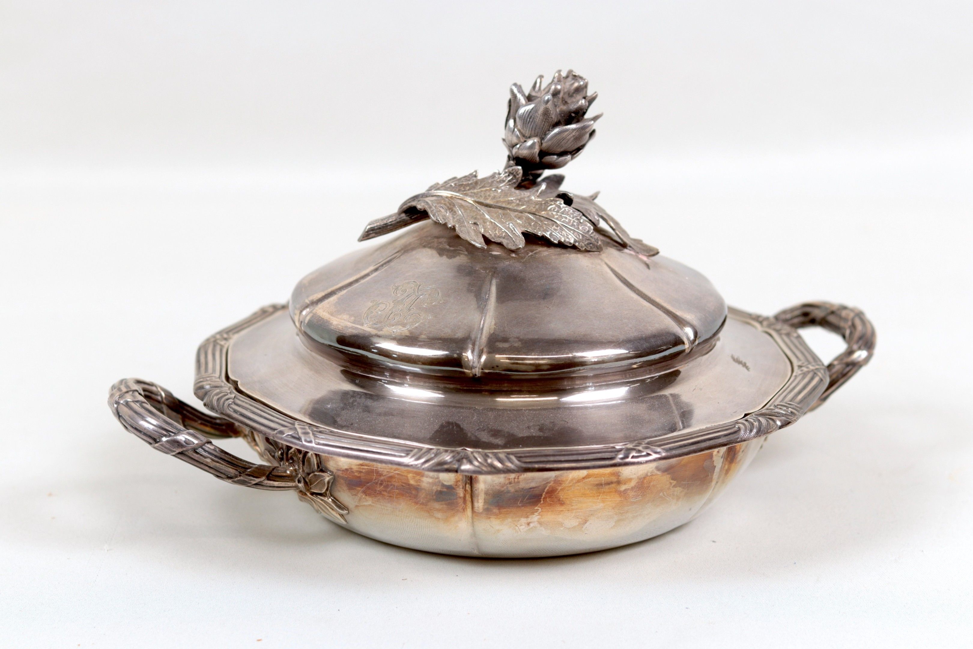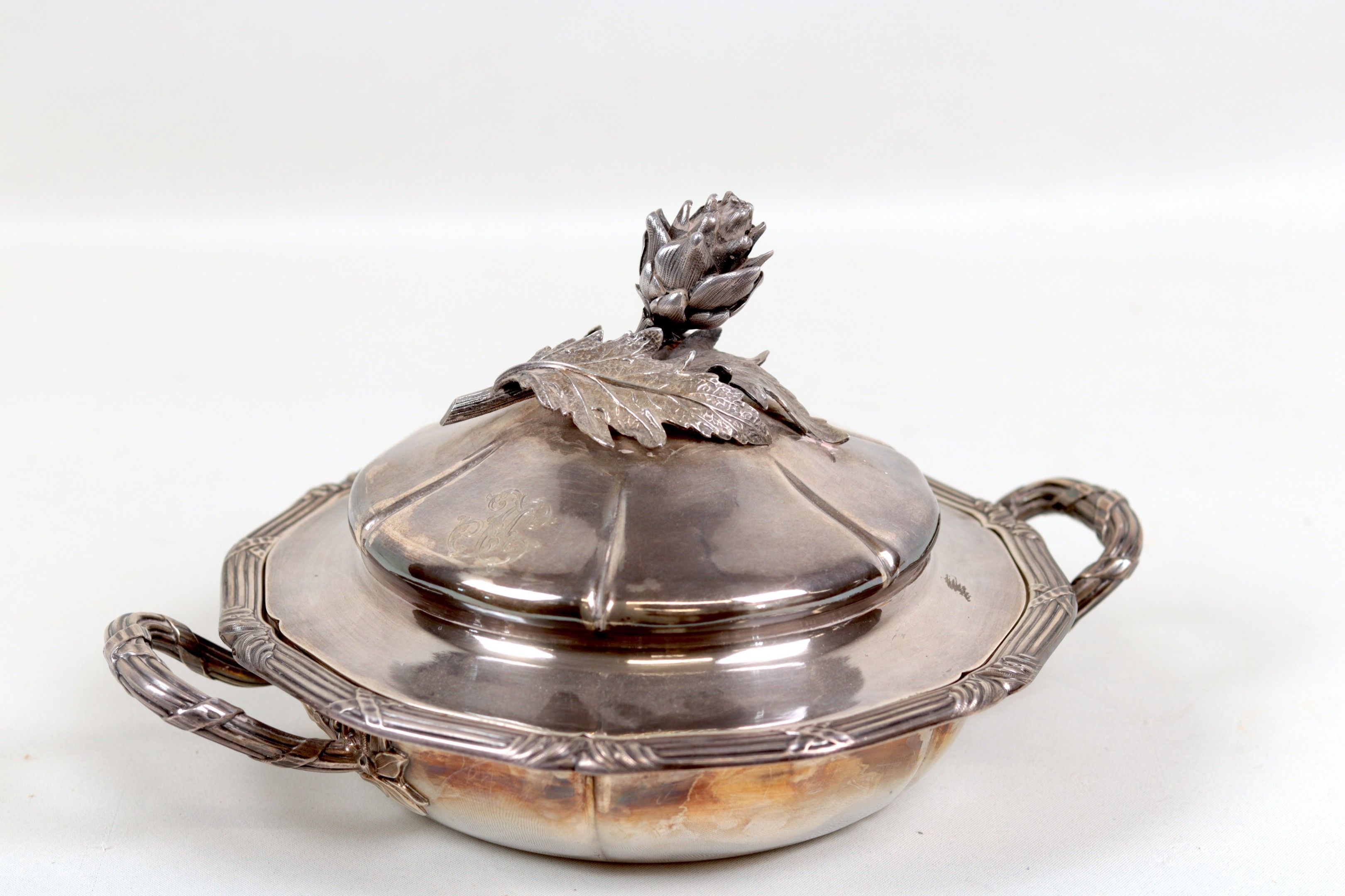 Pair of silver vegetable dishes 950 thousandths with their lining, the scrolled lip enrubannée with leafy clasps, the handles enrubannées and the base with decoration of laurels, the lid godronné, engraved "JC", the catch in artichoke for the one and in cabbage for the other. - Marked Minerve - MO: Jean-Baptiste-Gustave Odiot (1865-1894). - Weight: 3900g