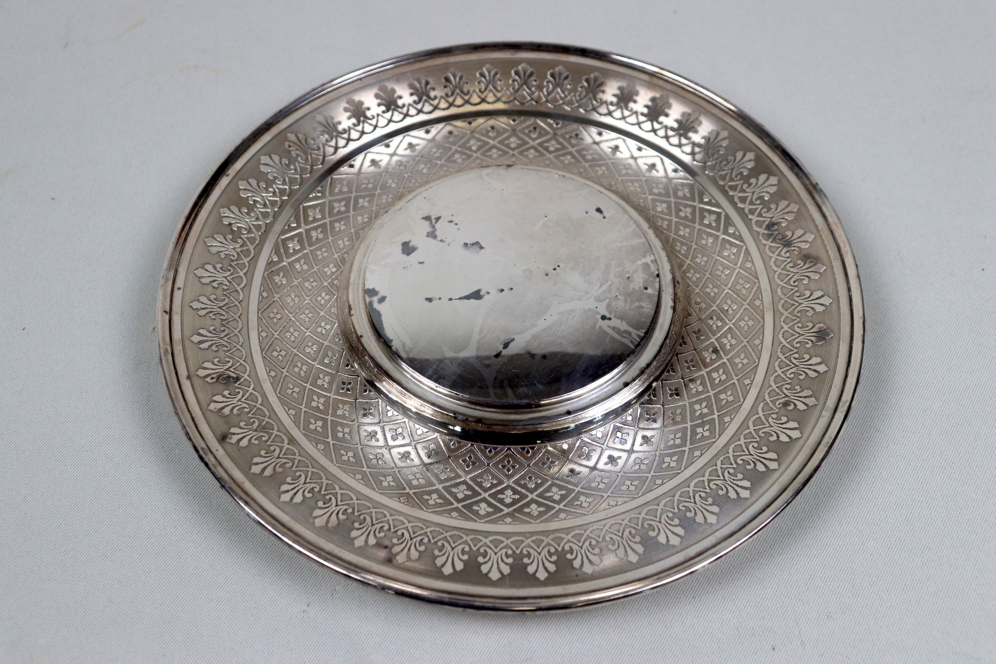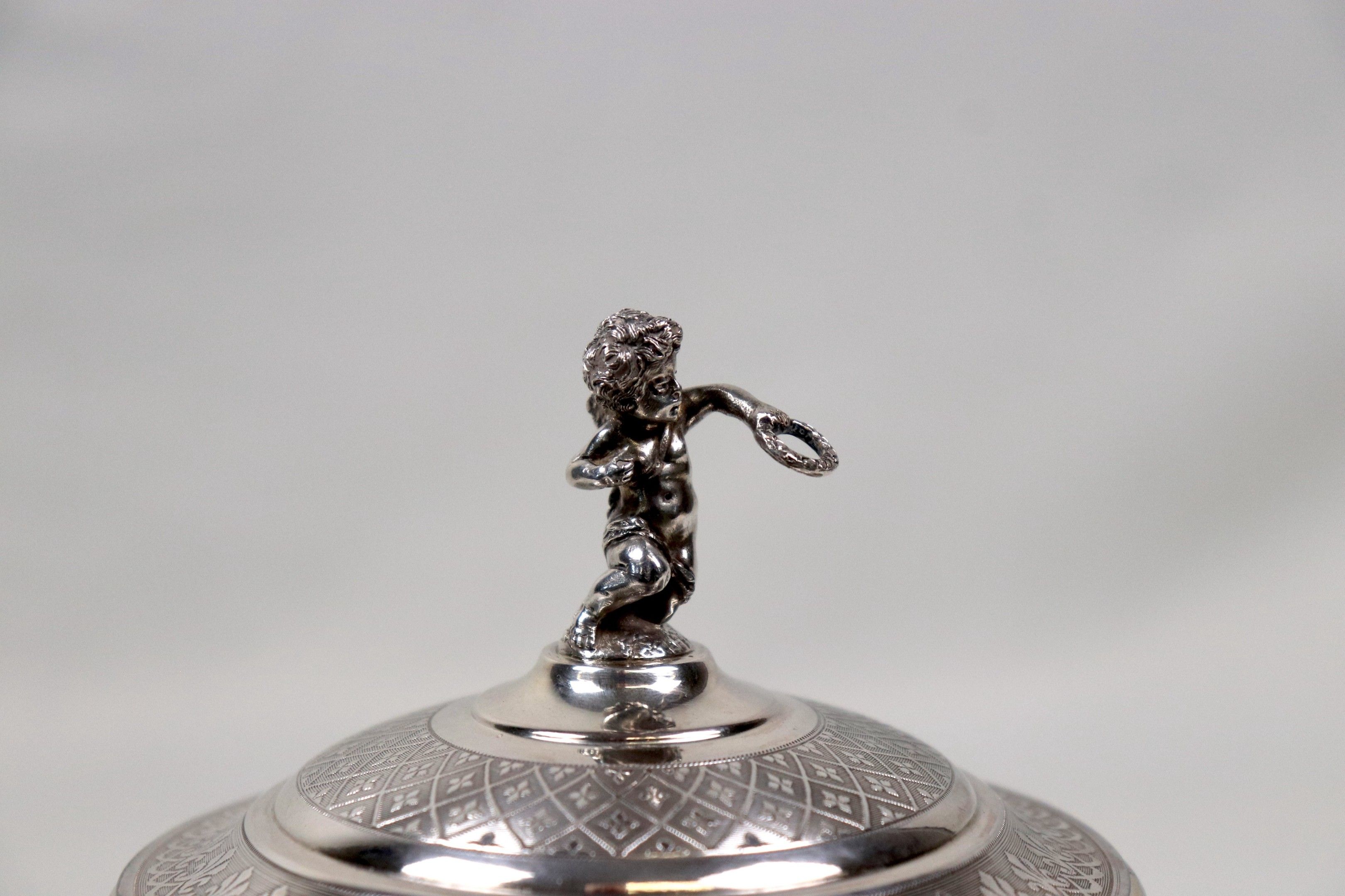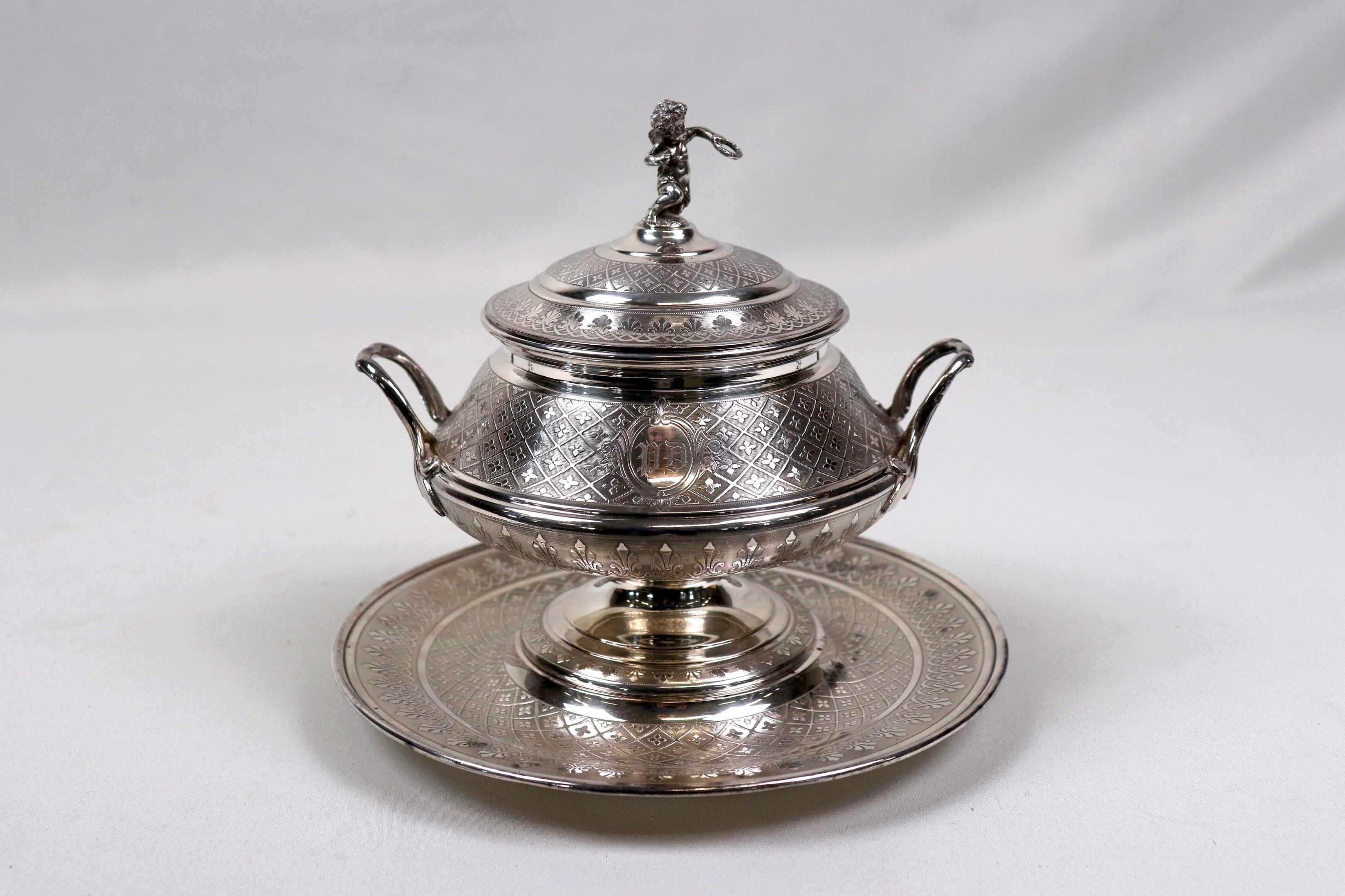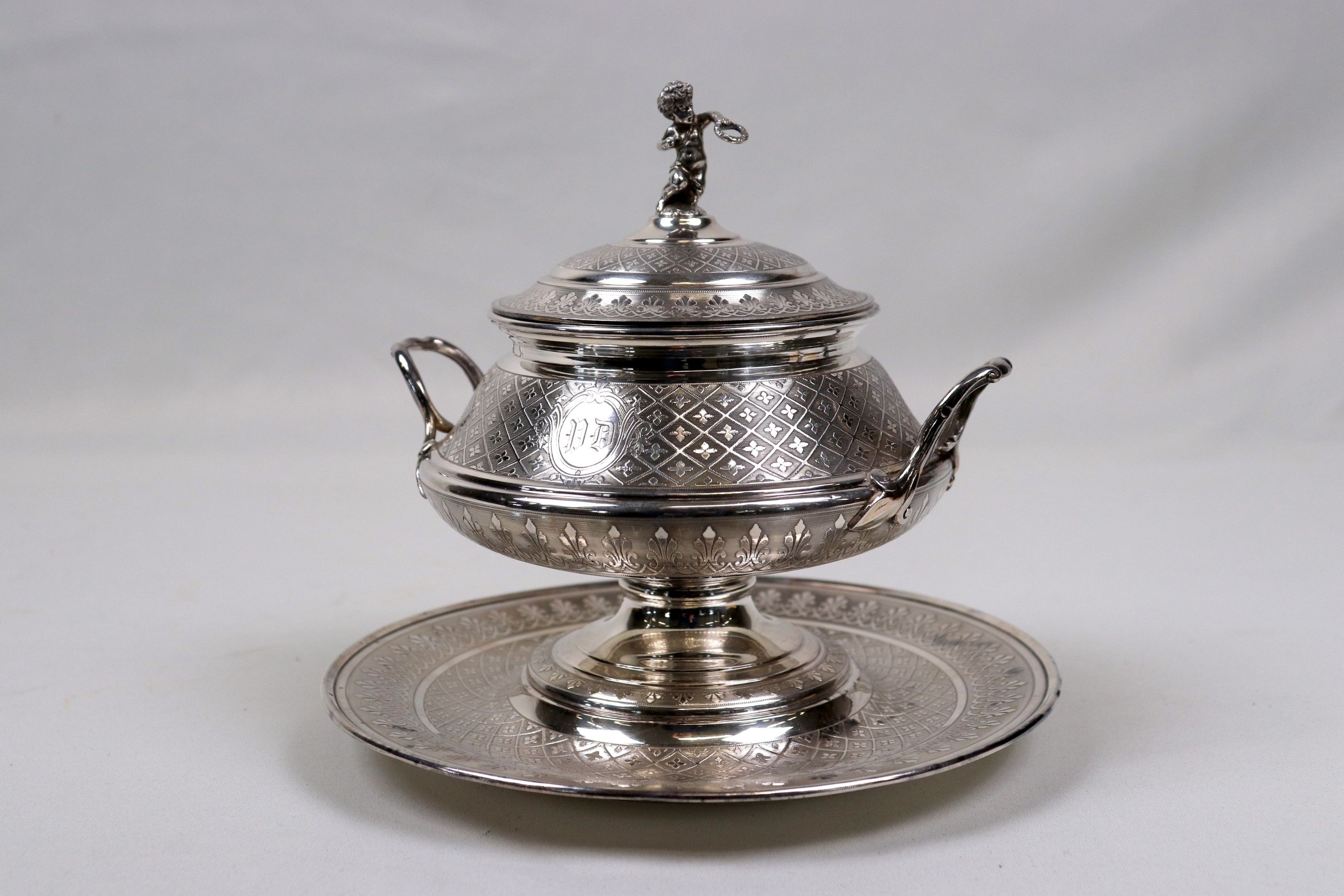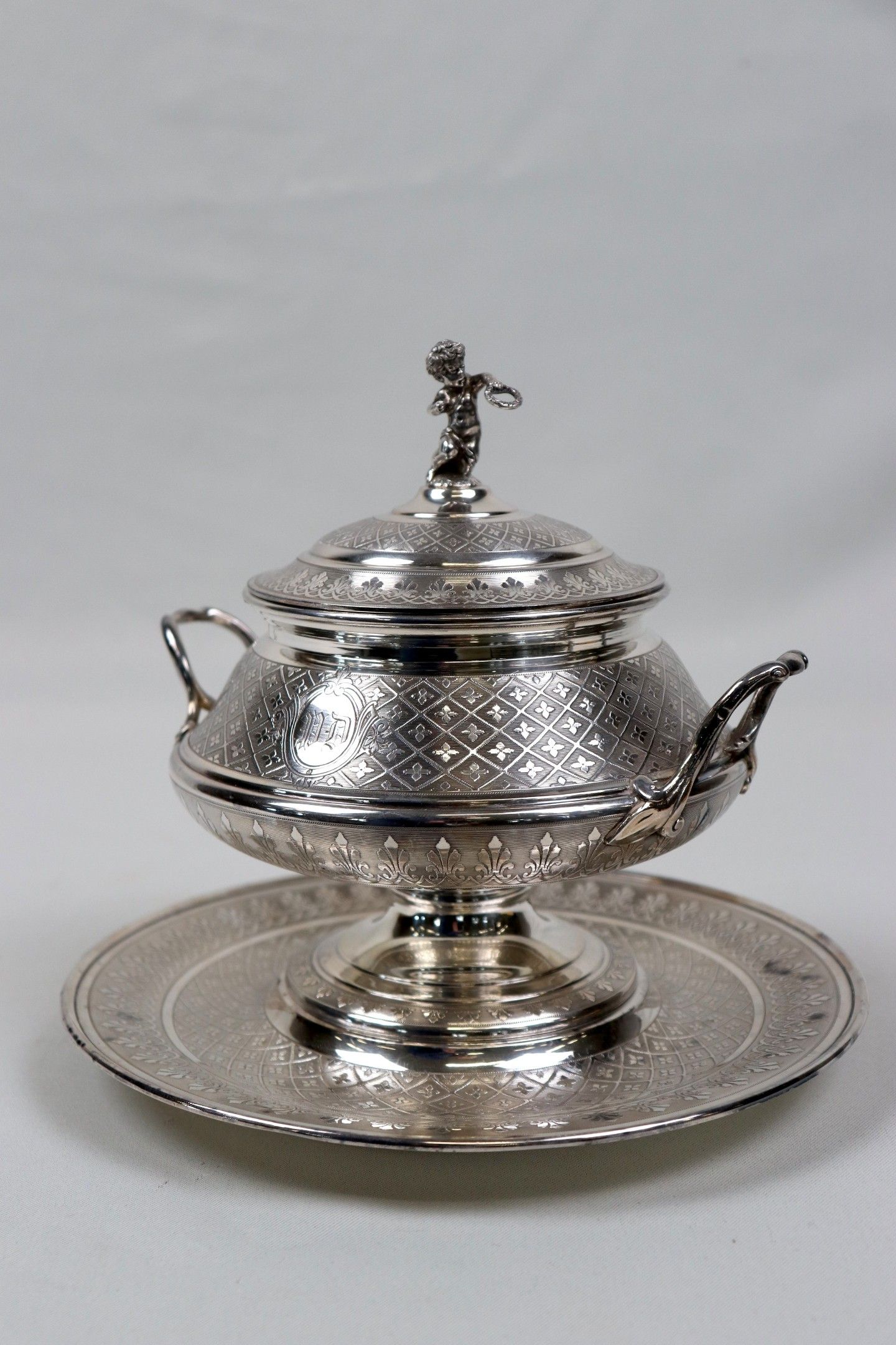 A Napoleon III period covered tureen and its display stand in 950 thousandths silver with a rich geometric decoration on a guilloché background, the lid decorated with a putto. - A silver tray by the same silversmith forming a lid rest is attached. - Minerve hallmark - MO: Emile HUGO, charged on 10 March 1853 - Weight: 1099.8 g