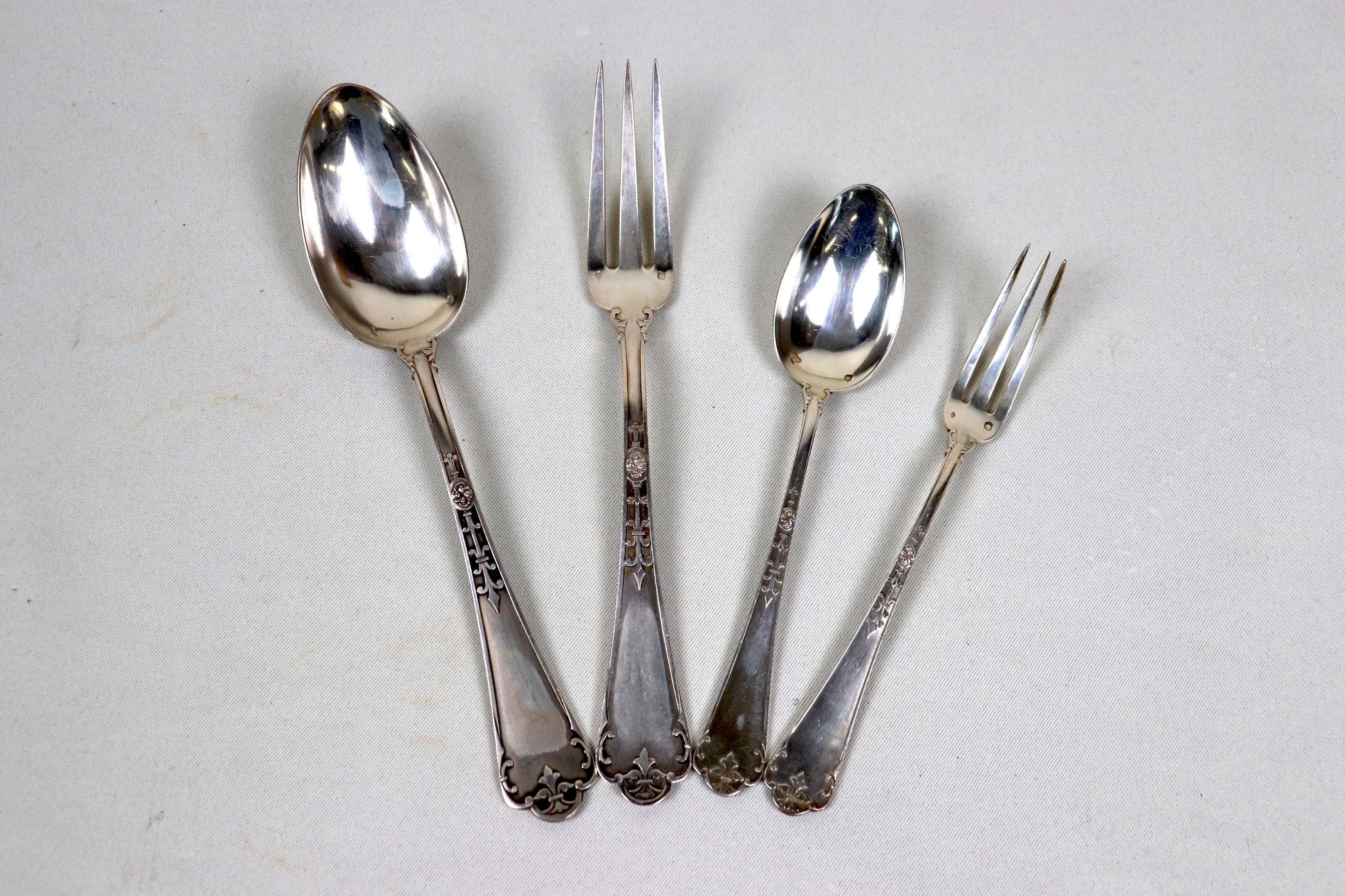 Neo-Renaissance silver "Fer de Lance" model with 48 pieces including twelve large place settings and 12 dessert place settings. - MO: PUIFORCAT - Minerve hallmark - With cases - Weight: 3268g