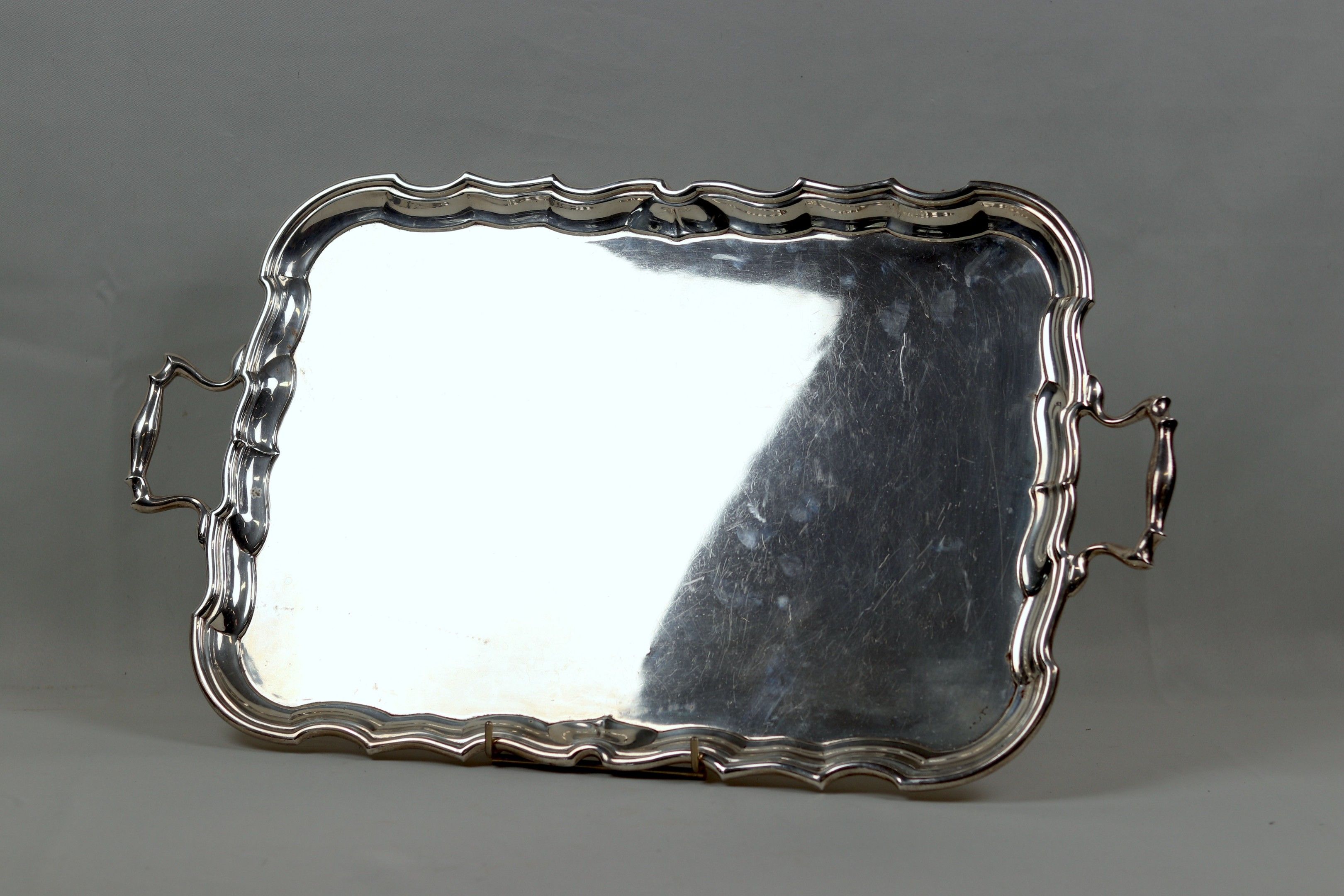 ENGLAND, large rectangular silver platter 800 thousandths, the edges and handles scalloped. - Swan hallmark and English hallmarks of the London office. - Weight : 3900 g - 57 x 40 cm